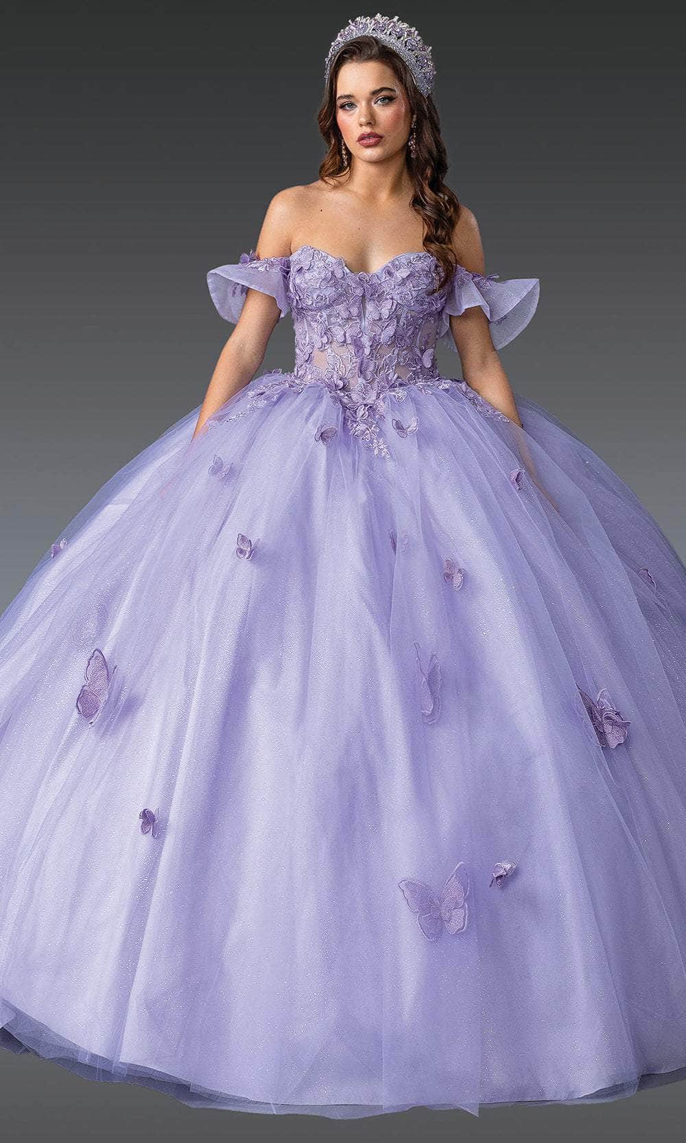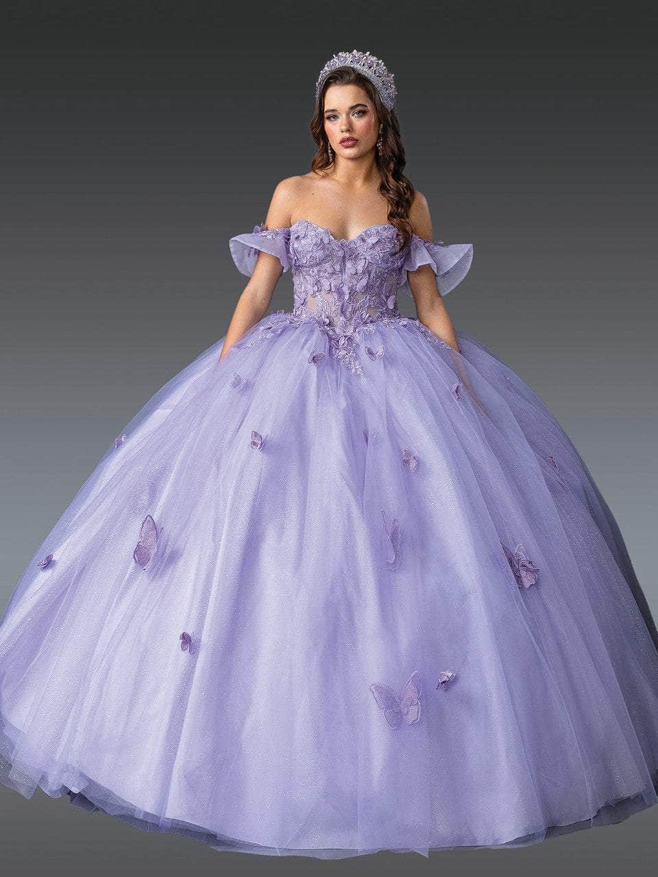 Transform your quinceanera into a fairytale in the Dancing Queen 1911 masterpiece. This enthralling gown showcases butterfly appliques fluttering across a sheer corset bodice and voluminous tulle skirt. The sweetheart neckline enhances your decolletage, while the Basque waistline provides a flattering fit. Embroidered details, sparkling glitter accents, and dreamy off-shoulder puff sleeves complete this captivating design. Make your special day unforgettable with the stunning beauty of the Dancing Queen 1911. Model is wearing Lilac color.