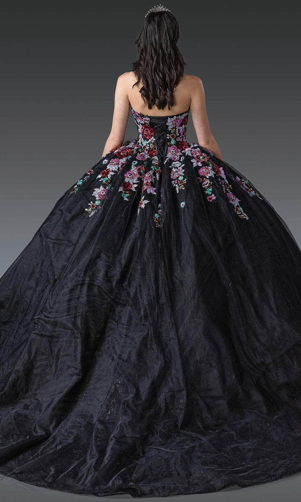 Step into elegance with the Dancing Queen 1927, a showstopping quinceanera gown designed to impress. This ballgown features a strapless sweetheart neckline adorned with multicolor floral sequins and embroidery. The corset-style bodice flatters your figure, while the voluminous skirt cascades into a dreamy ballgown silhouette. Glittering accents enhance the floral patterns, adding a touch of sparkle to every movement. The corset lace-up back ensures a perfect fit, creating a captivating look from all angles. Embrace this fairy-tale design and celebrate your special day in the Dancing Queen 1927. Model is wearing color.
