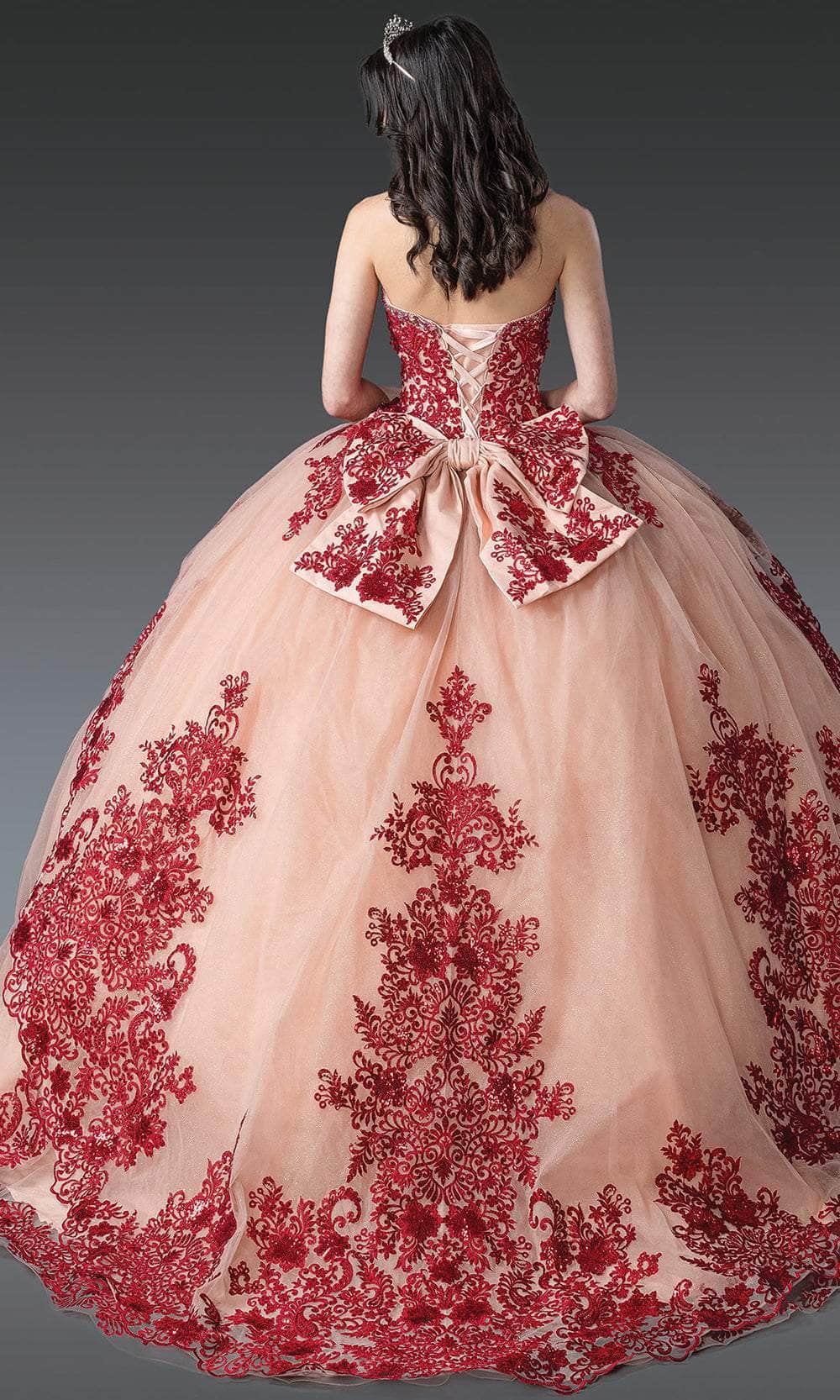 Dare to dazzle in the Dancing Queen 1928, a striking quinceanera gown adorned with baroque-inspired lace embroidery. The strapless bodice showcases a flattering sweetheart neckline and glitters with intricate details that shimmer in the light. A standout feature is the dramatic layered skirt that adds dimension to the full ballgown silhouette. The back bow accent enhances the gown royal flair, while the lace-up back offers an adjustable fit. The Dancing Queen 1928 is a masterpiece perfect for making a grand entrance on your special day. Model is wearing Rose Gold/Burgundy color.