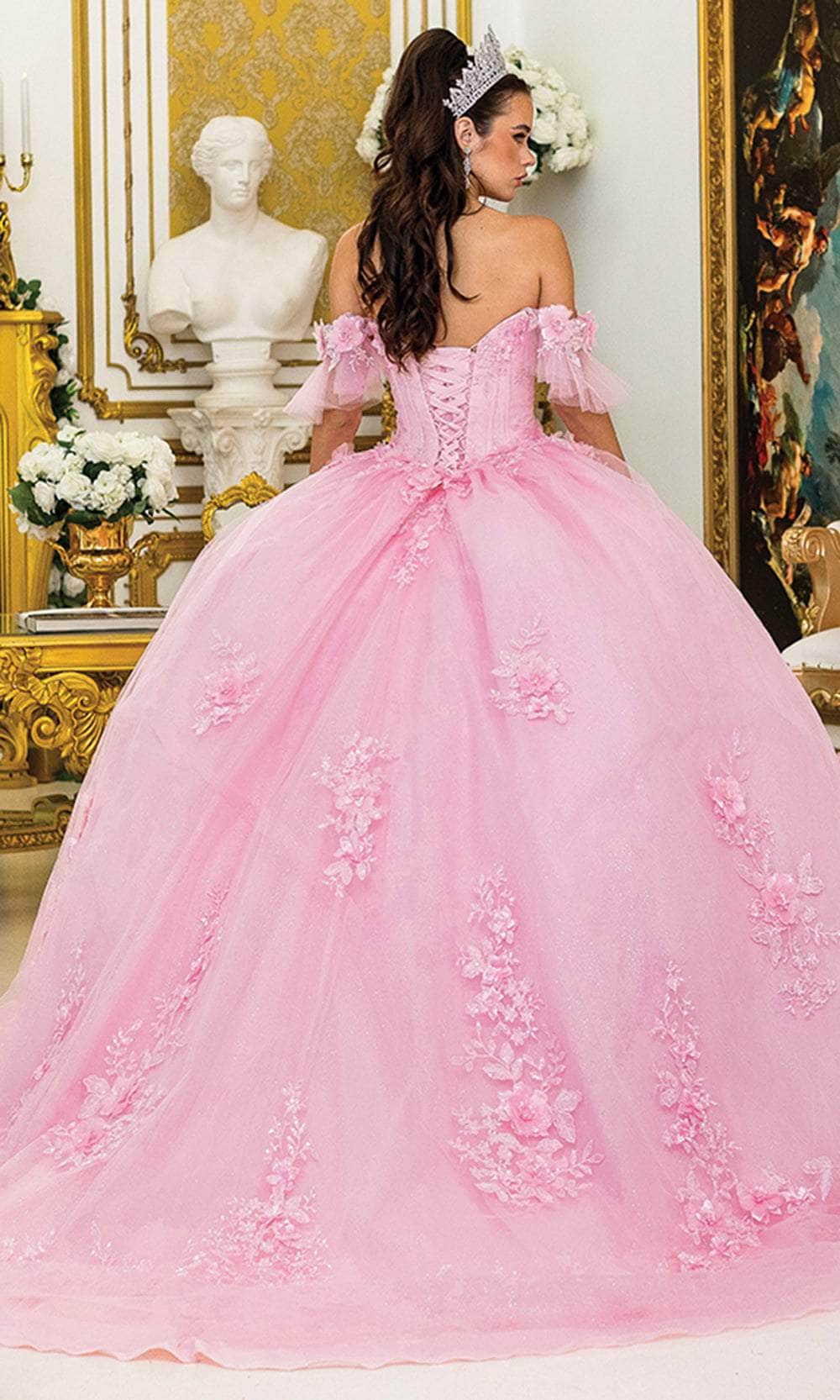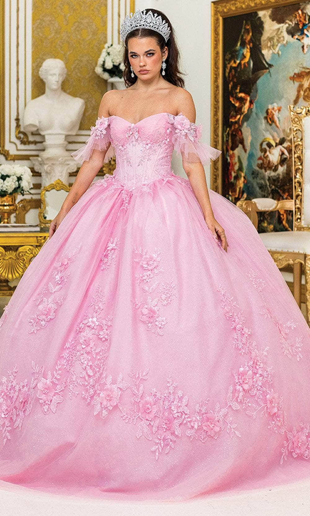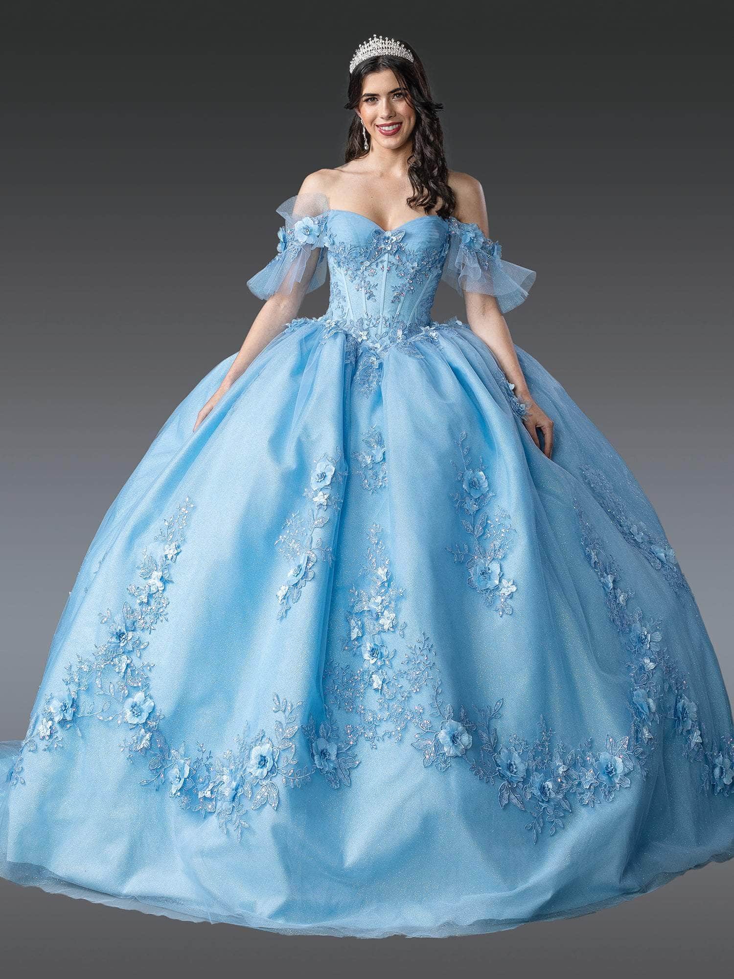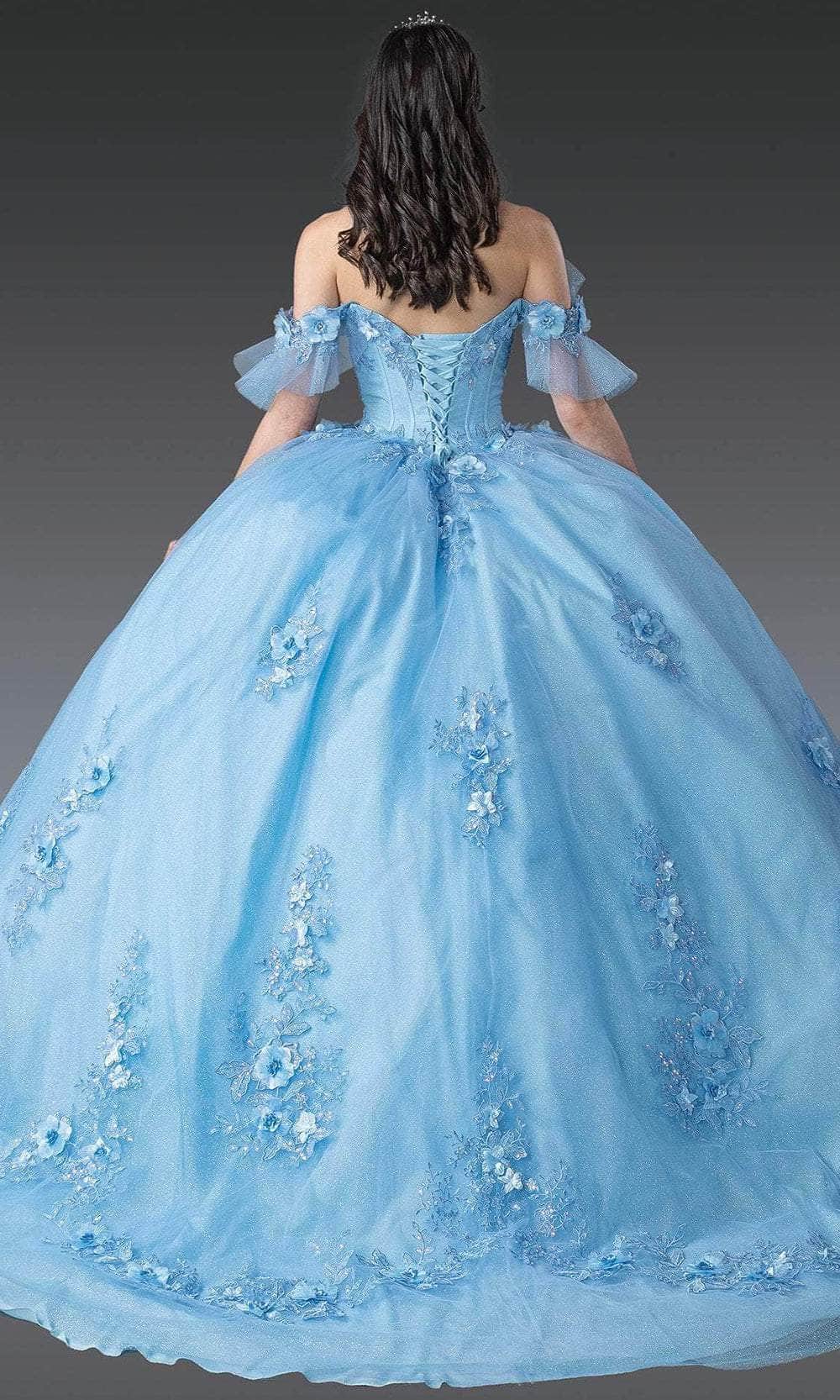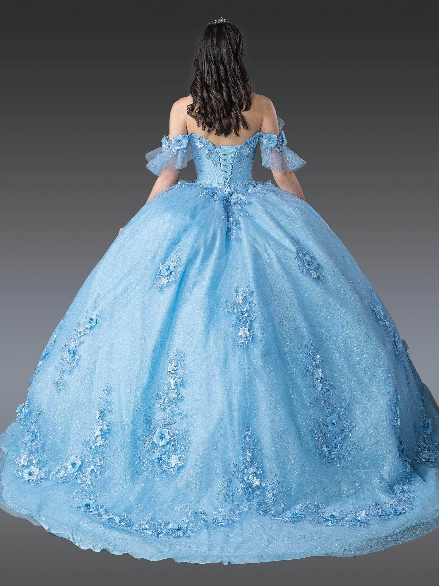The Dancing Queen 1944 blends fairytale romance with regal sophistication, perfect for quinceaneras celebrations. This off shoulder gown showcases a sweetheart neckline, sheer puffed sleeves and a beautifully crafted floral applique bodice. The beaded detail adds a shimmering effect, while the Basque waistline and lace up back sculpt a graceful silhouette. Whether for quinceaneras or galas, the Dancing Queen 1944 ballgown invites you to step into elegance and enchantment, making every moment feel magical and unforgettable. Models are wearing Bahama Blue, and Pink colors.