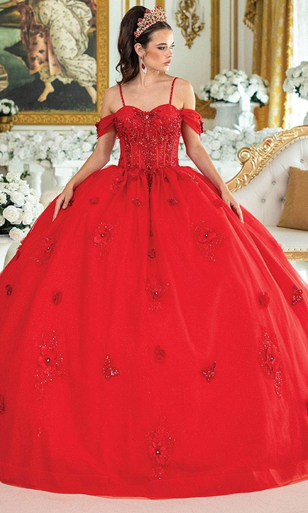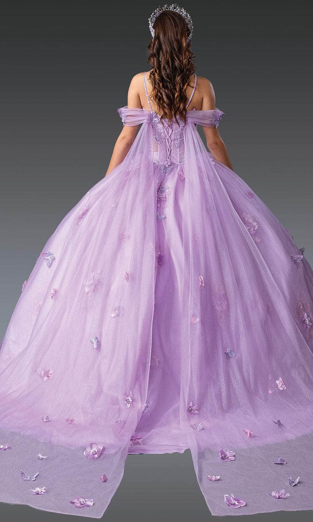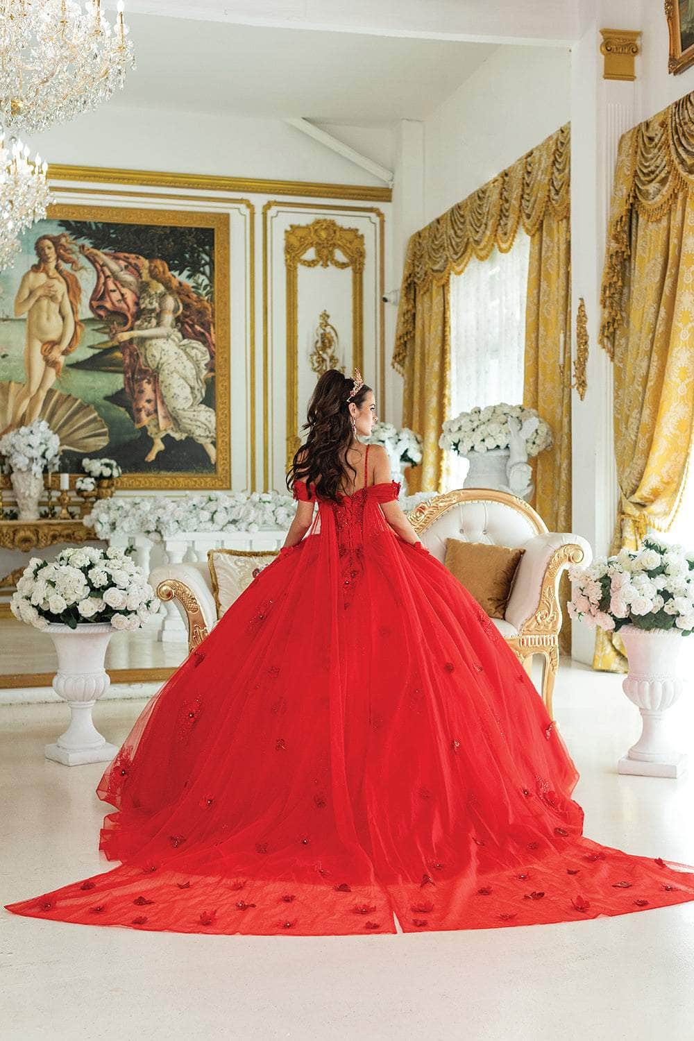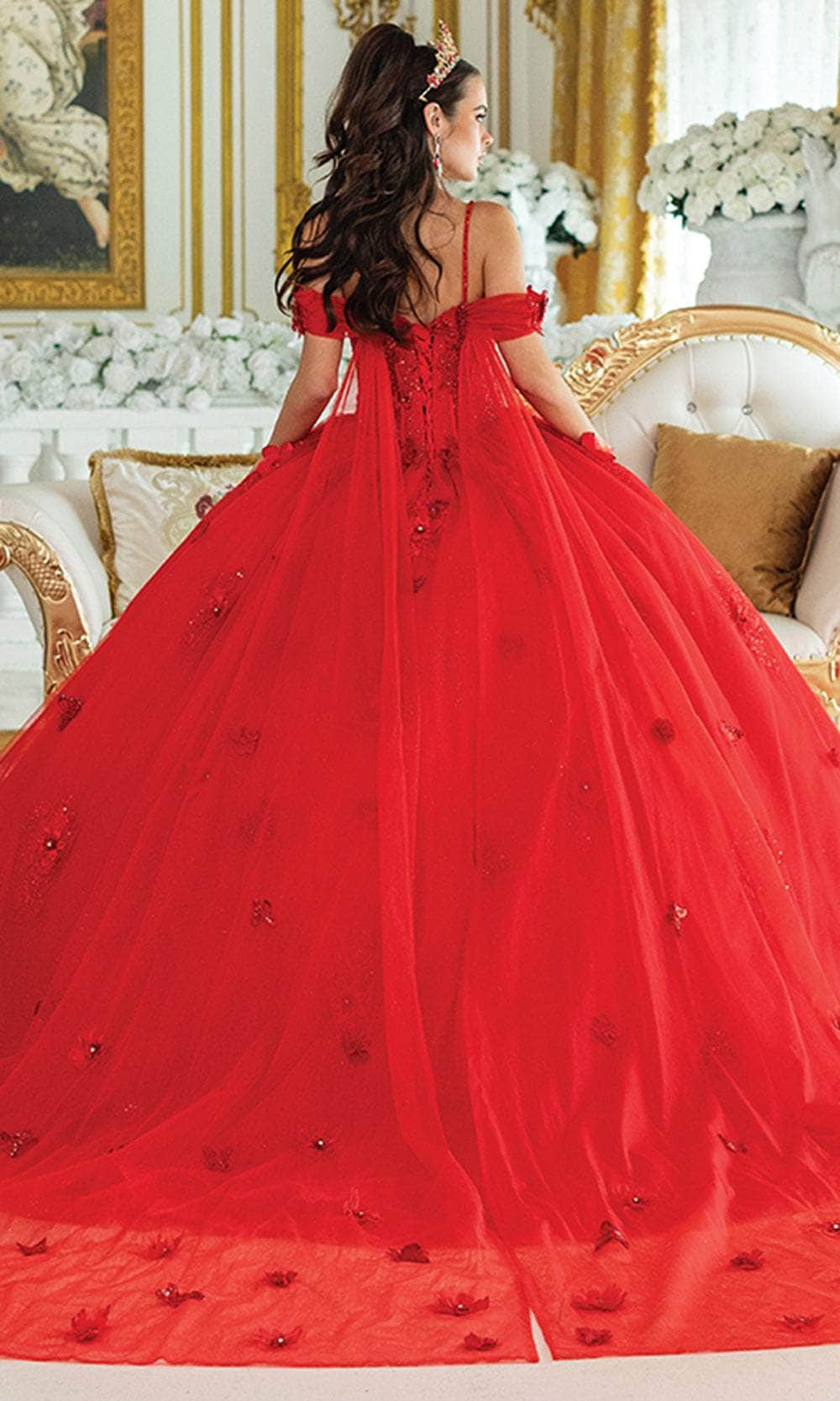 Radiate charm with the Dancing Queen 1954, a gown filled with enchanting details. The butterfly and floral applique bodice pairs beautifully with thin straps and off shoulder draped tulle sleeves, leading into a voluminous ballgown skirt. The illusion corset bodice adds shape and structure, while the lace up back completes the look with a perfect adjustable fit. The Dancing Queen 1954 is ideal for quinceaneras and other milestone celebrations where you want to sparkle and stand out. Models are wearing Lilac, and Red colors.