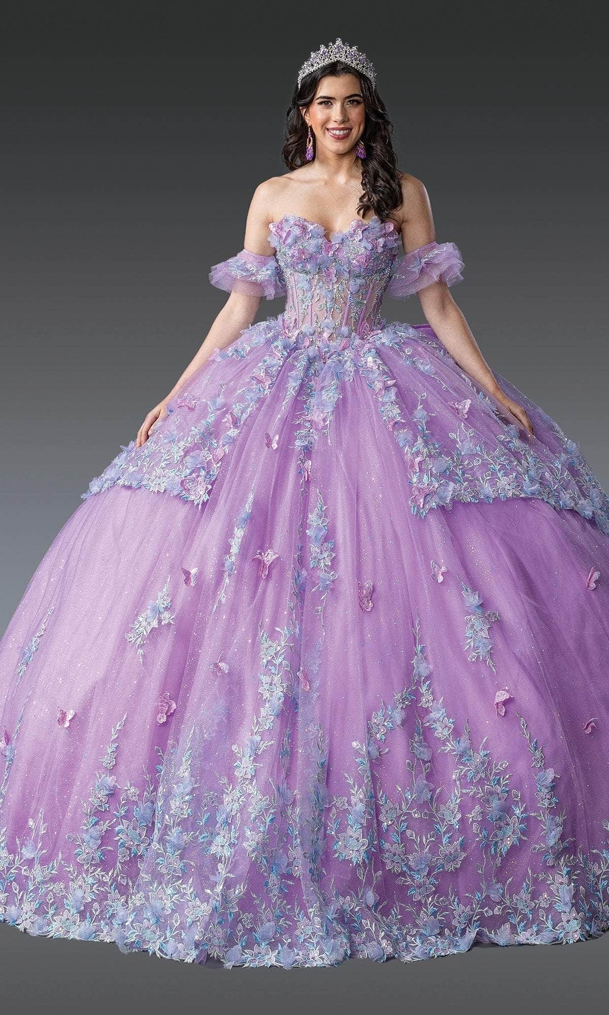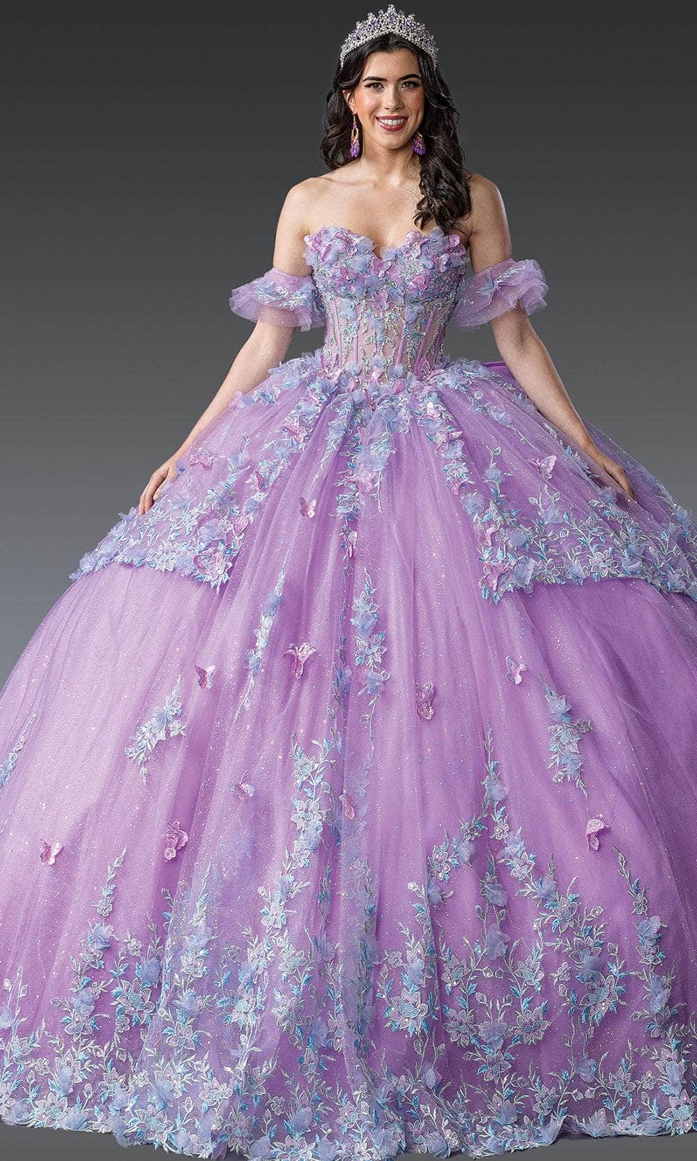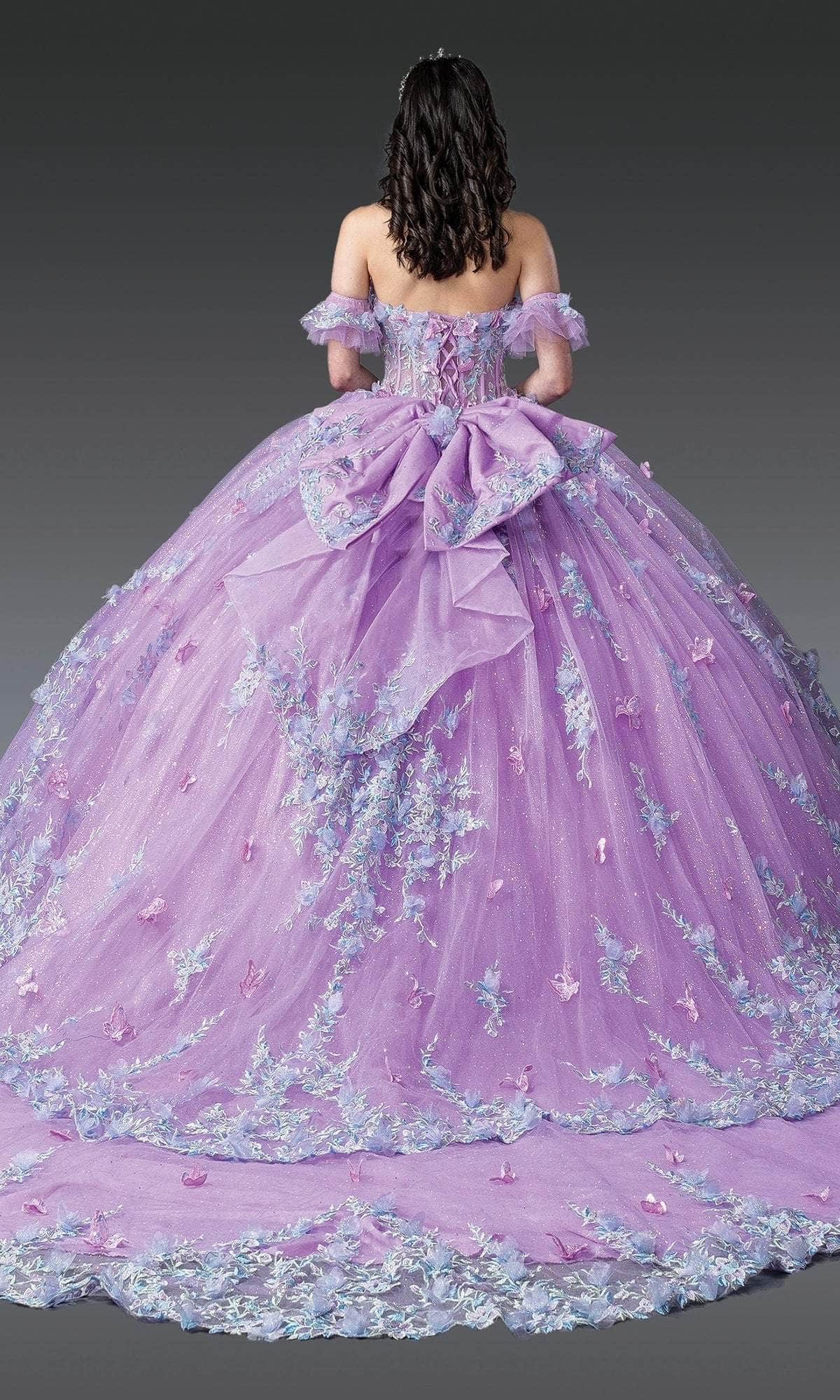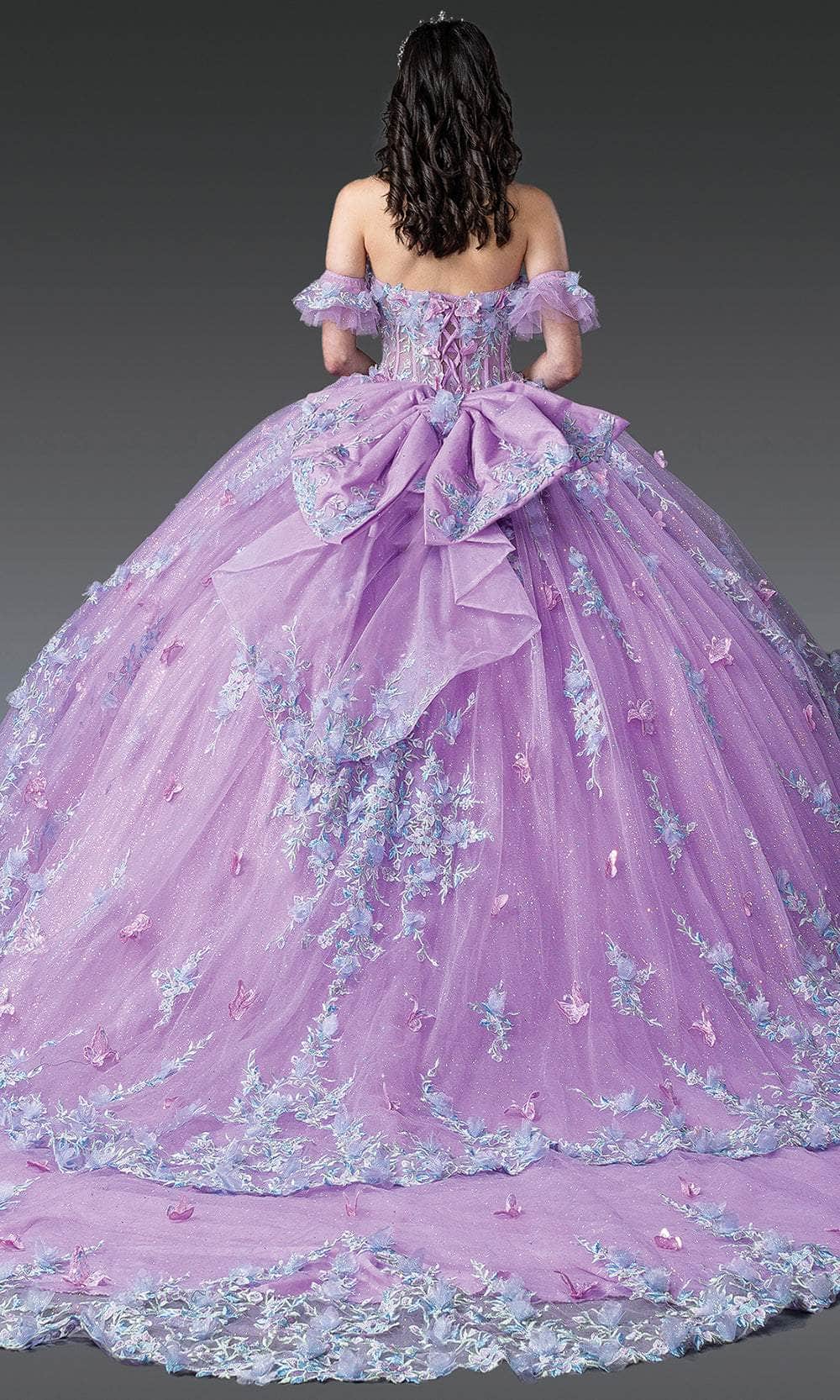 Celebrate a magical evening in the Dancing Queen 1961 gown, an enchanting creation that radiates timeless beauty. The gown showcases a sweetheart neckline and illusion corset bodice, while the exquisite 3D floral and butterfly appliques, and beaded embroidery brings a romantic charm to the look. Detachable short puff sleeves drape delicately, adding a soft elegance. The skirt blooms into voluminous ballgown silhouette accented with layered ruffles and oversized back bow. The Dancing Queen 1961 is an exceptional choice for quinceaneras and grand celebrations alike. Model is wearing Lilac color.