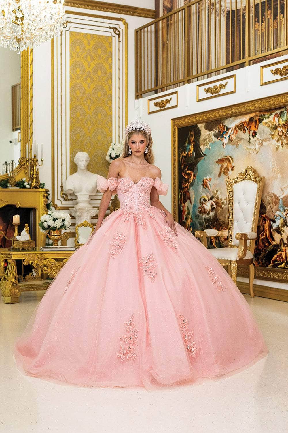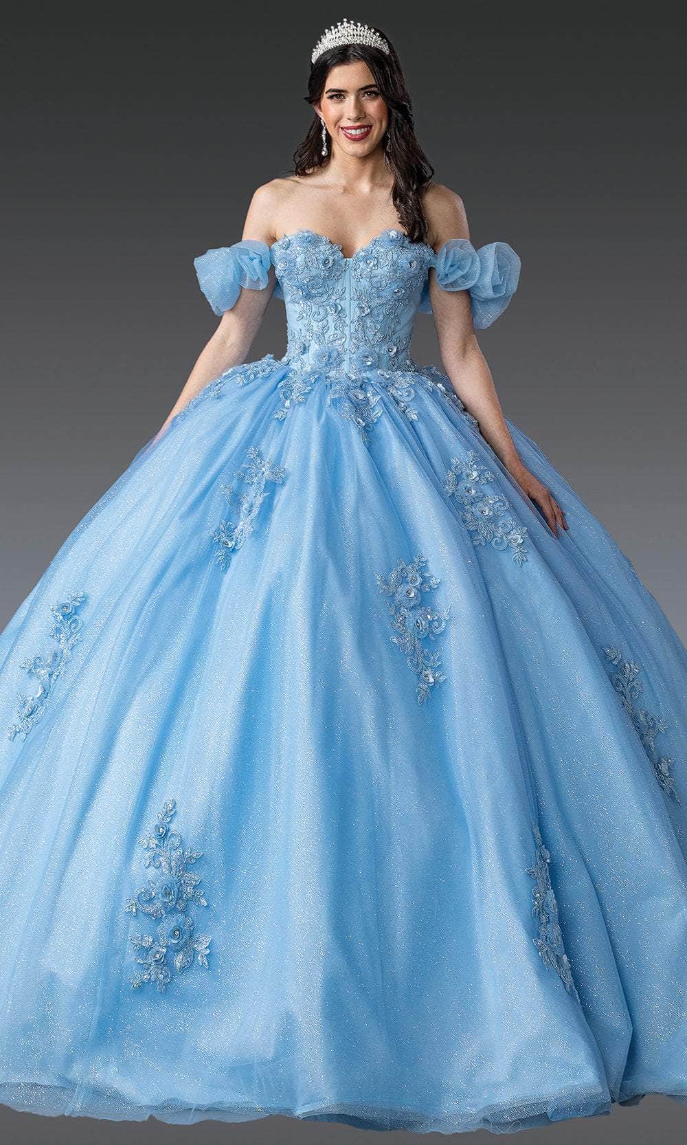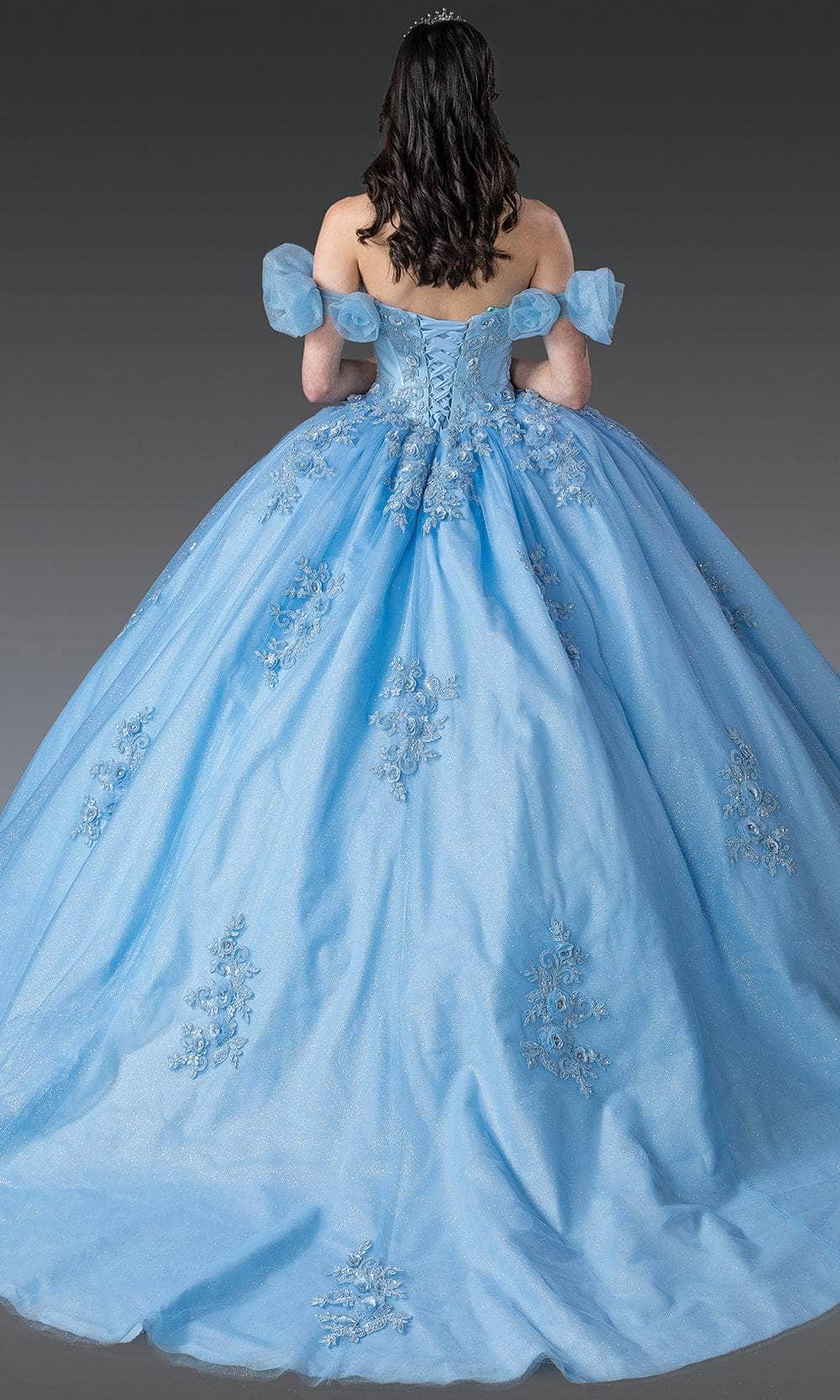 Dancing Queen 1976 blends classic charm with modern glamour, making it ideal for special celebrations. Featuring a sweetheart neckline and dreamy3D floral off-shoulder puff sleeves, this ballgown shines with detailed floral embroidery and glitter embellishments. The ballgown skirt drapes beautifully to sweep train, while the lace-up back cinches the waist for a flattering fit. The delicate beading on the bodice adds a luxurious element. Perfect for a quinceanera, the Dancing Queen 1976 will make you the star of your event. Models are wearing Bahama Blue, and Blush colors.