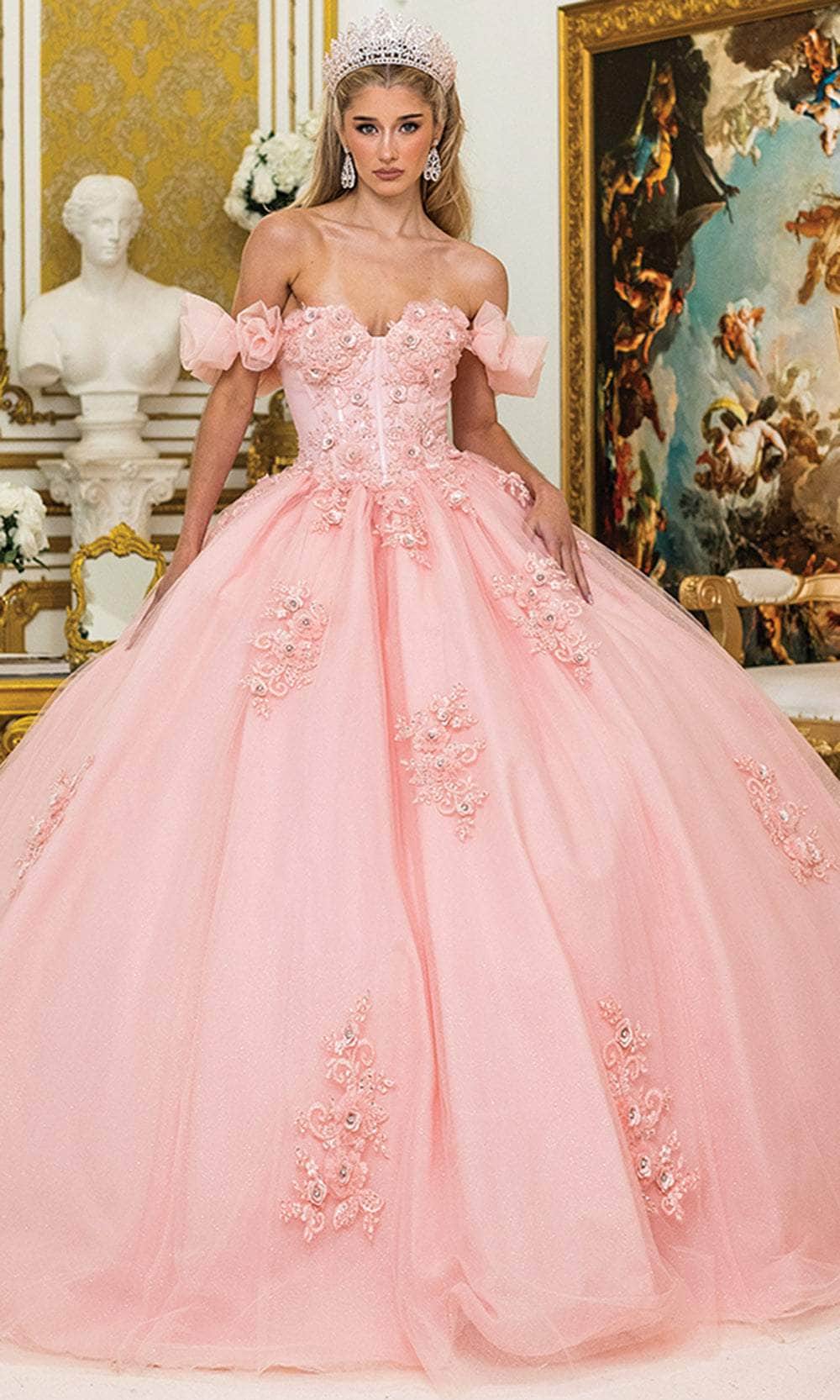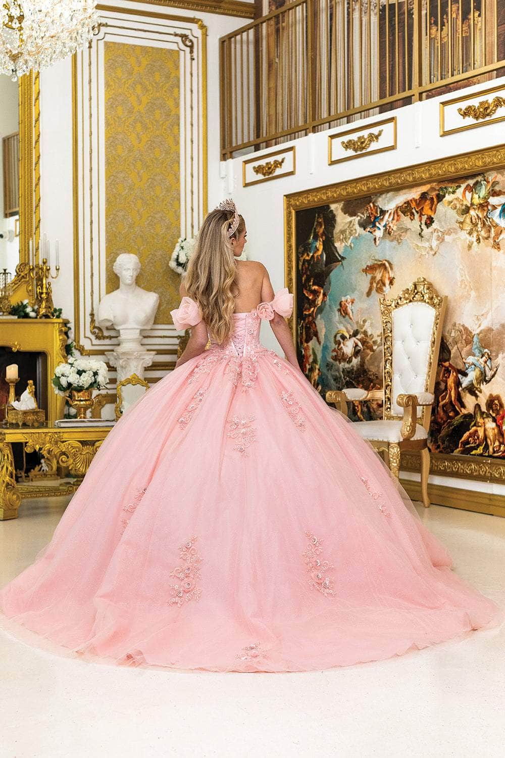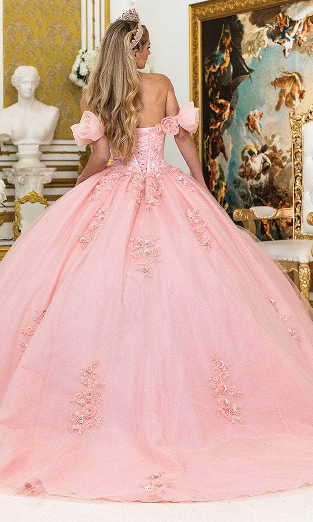 Dancing Queen 1976 blends classic charm with modern glamour, making it ideal for special celebrations. Featuring a sweetheart neckline and dreamy3D floral off-shoulder puff sleeves, this ballgown shines with detailed floral embroidery and glitter embellishments. The ballgown skirt drapes beautifully to sweep train, while the lace-up back cinches the waist for a flattering fit. The delicate beading on the bodice adds a luxurious element. Perfect for a quinceanera, the Dancing Queen 1976 will make you the star of your event. Models are wearing Bahama Blue, and Blush colors.