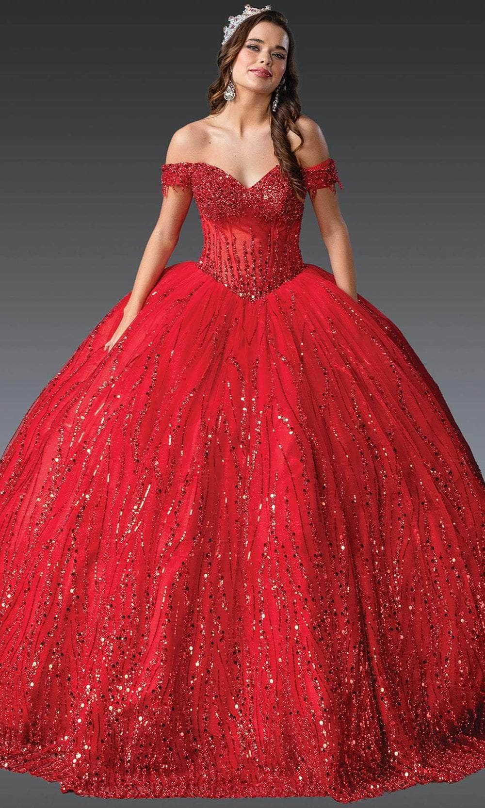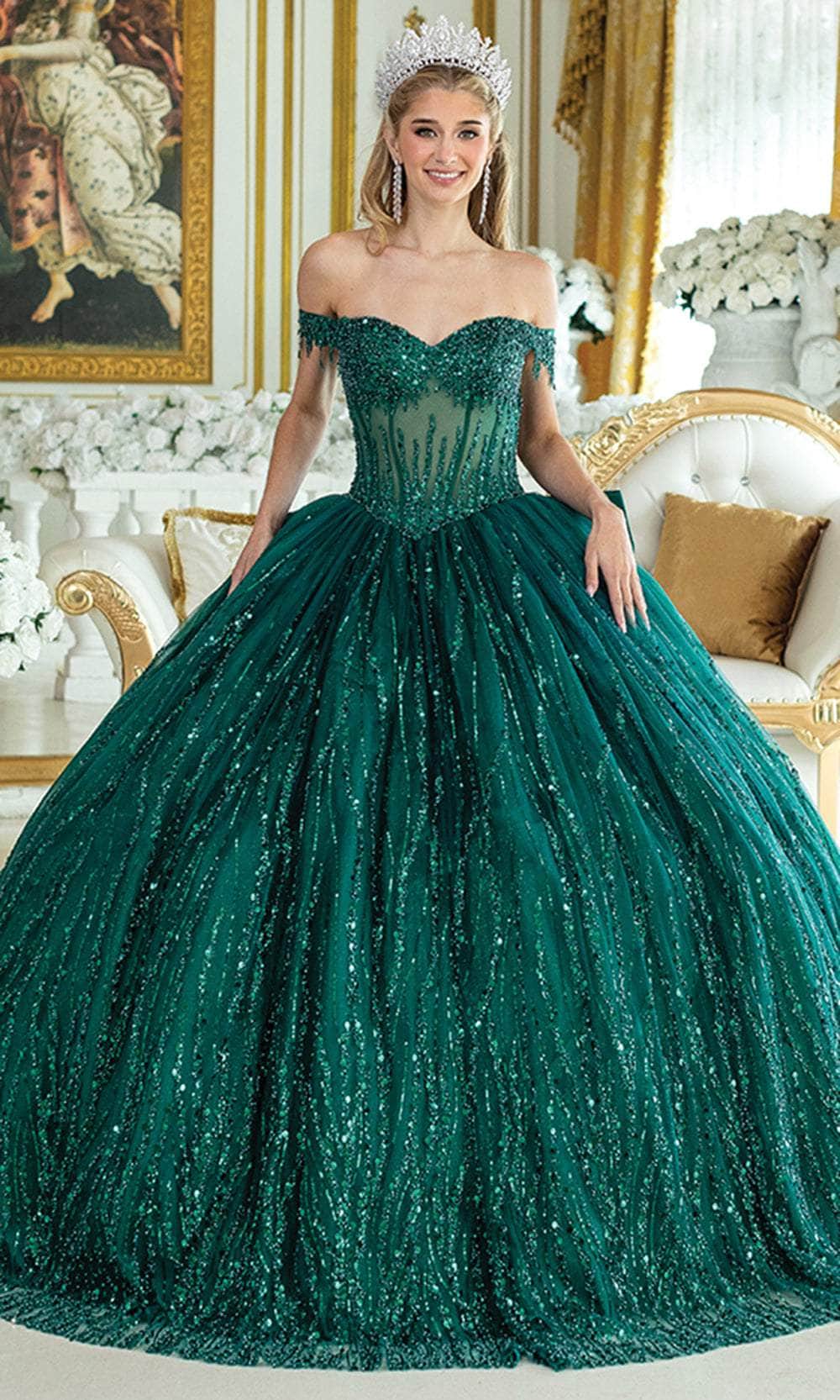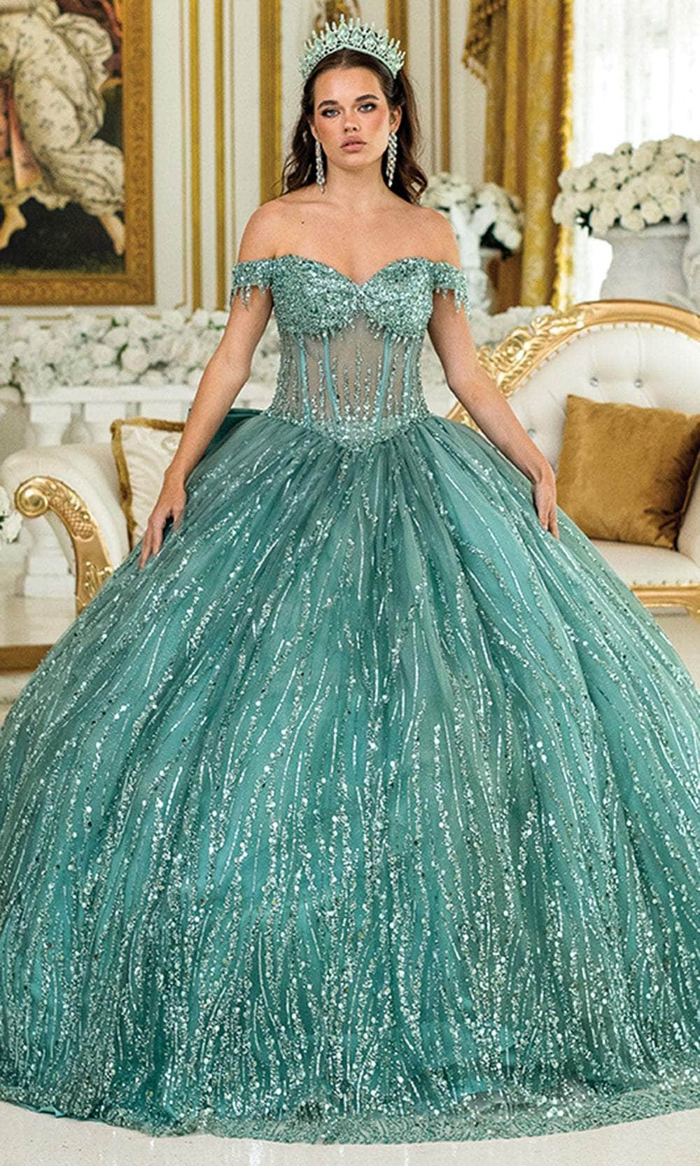 Experience the allure of the Dancing Queen 1982, a gown adorned with allover sequins and beaded that radiate glamour. The sweetheart neckline and off-shoulder sleeves frames the collarbone beautifully, while the corset bodice and lace up back enhance your shape with a perfect fit. Its Basque waistline elevates the voluminous ballgown silhouette, ensuring a princess-worthy appearance. Designed for evening galas, quinceaneras, or proms, the Dancing Queen 1982 guarantees an entrance that no one will forget, making you shine from every angle. Models are wearing Champagne, Hunter Green, Red, Rose Gold, Royal Blue, and Sage colors.