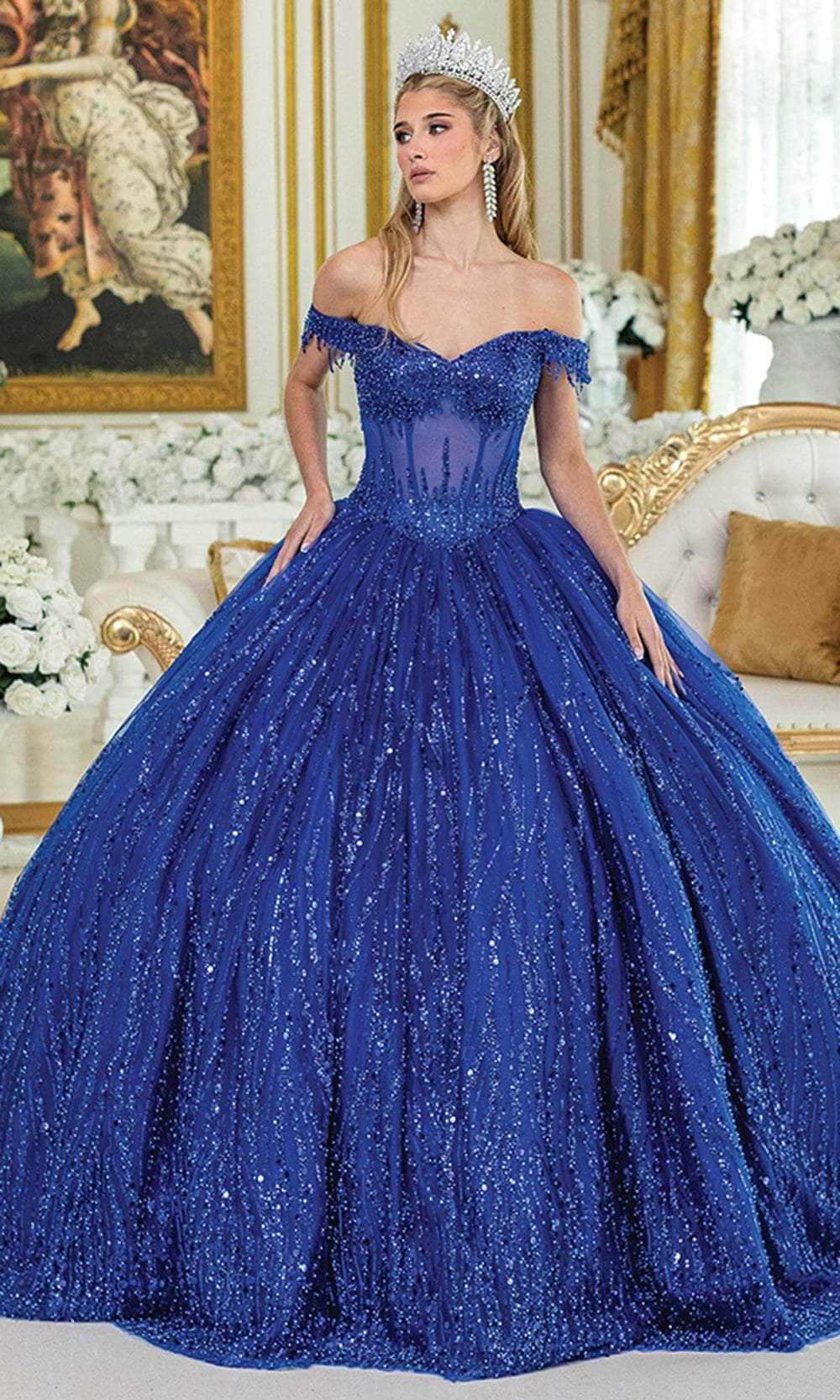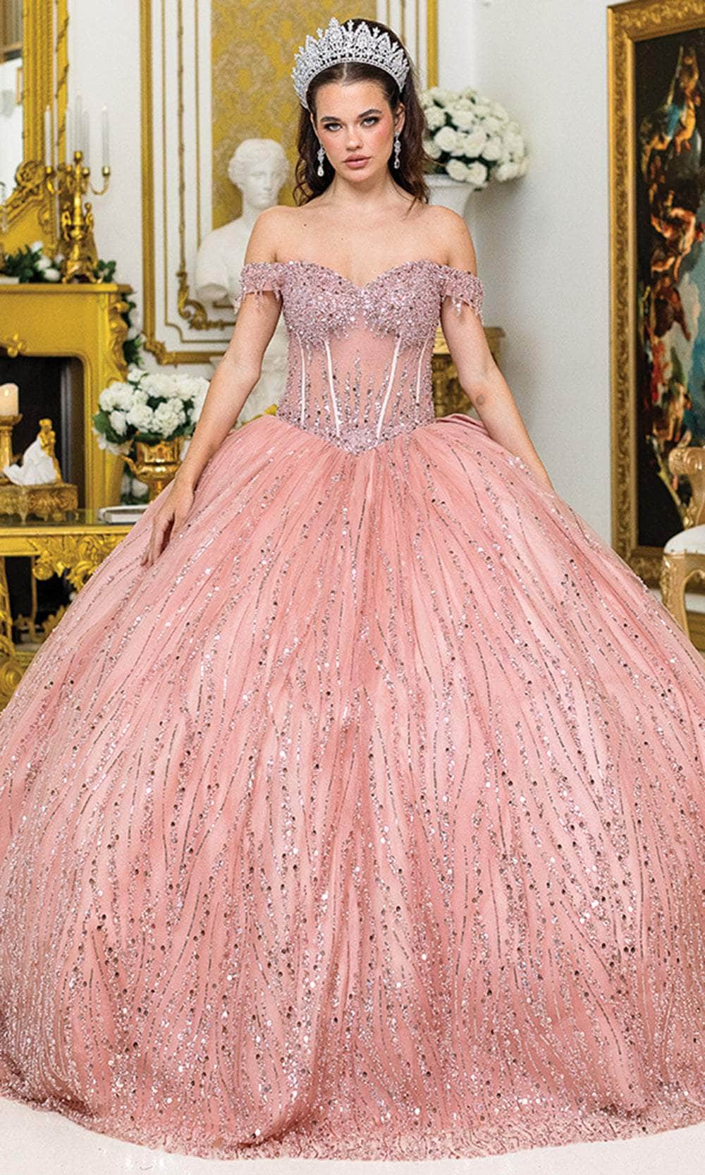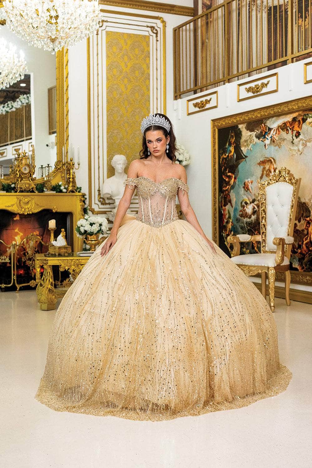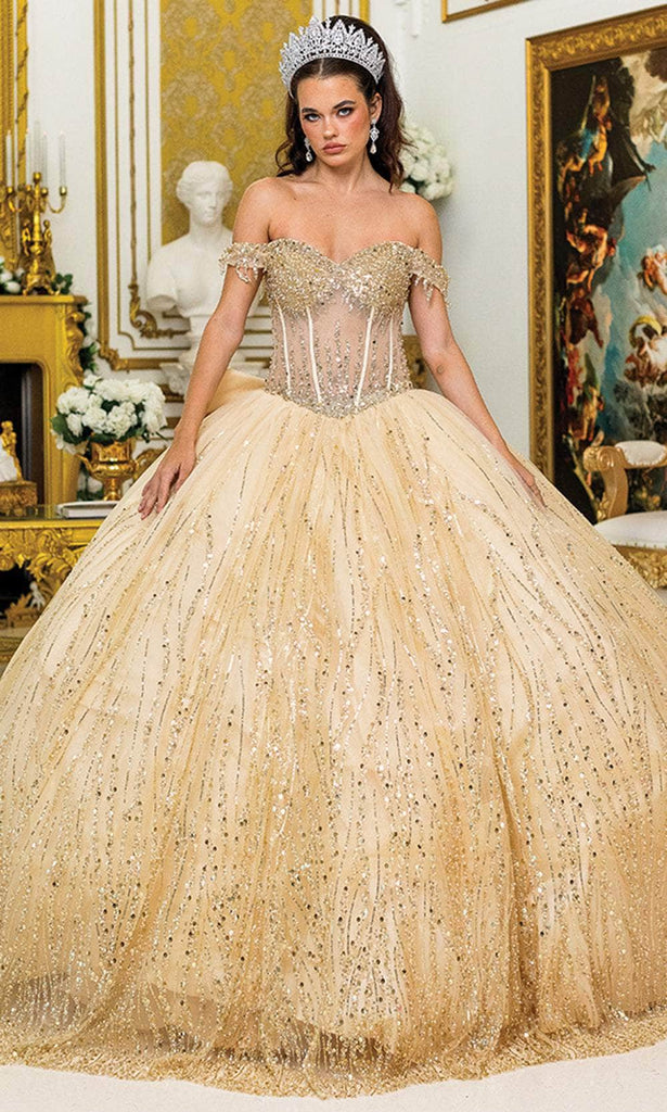 Experience the allure of the Dancing Queen 1982, a gown adorned with allover sequins and beaded that radiate glamour. The sweetheart neckline and off-shoulder sleeves frames the collarbone beautifully, while the corset bodice and lace up back enhance your shape with a perfect fit. Its Basque waistline elevates the voluminous ballgown silhouette, ensuring a princess-worthy appearance. Designed for evening galas, quinceaneras, or proms, the Dancing Queen 1982 guarantees an entrance that no one will forget, making you shine from every angle. Models are wearing Champagne, Hunter Green, Red, Rose Gold, Royal Blue, and Sage colors.