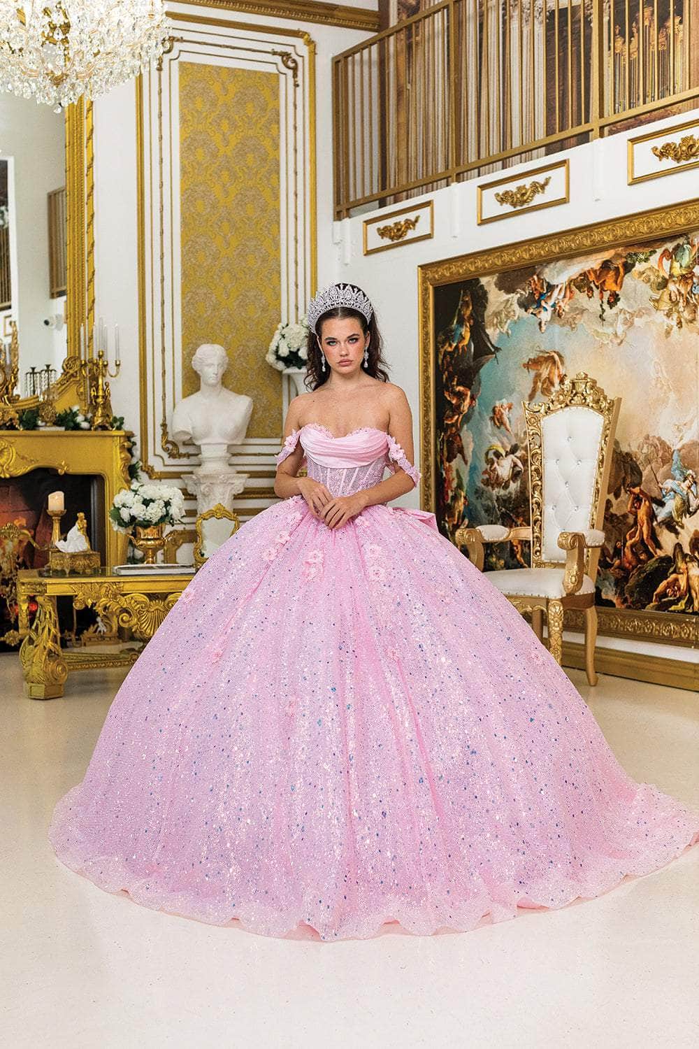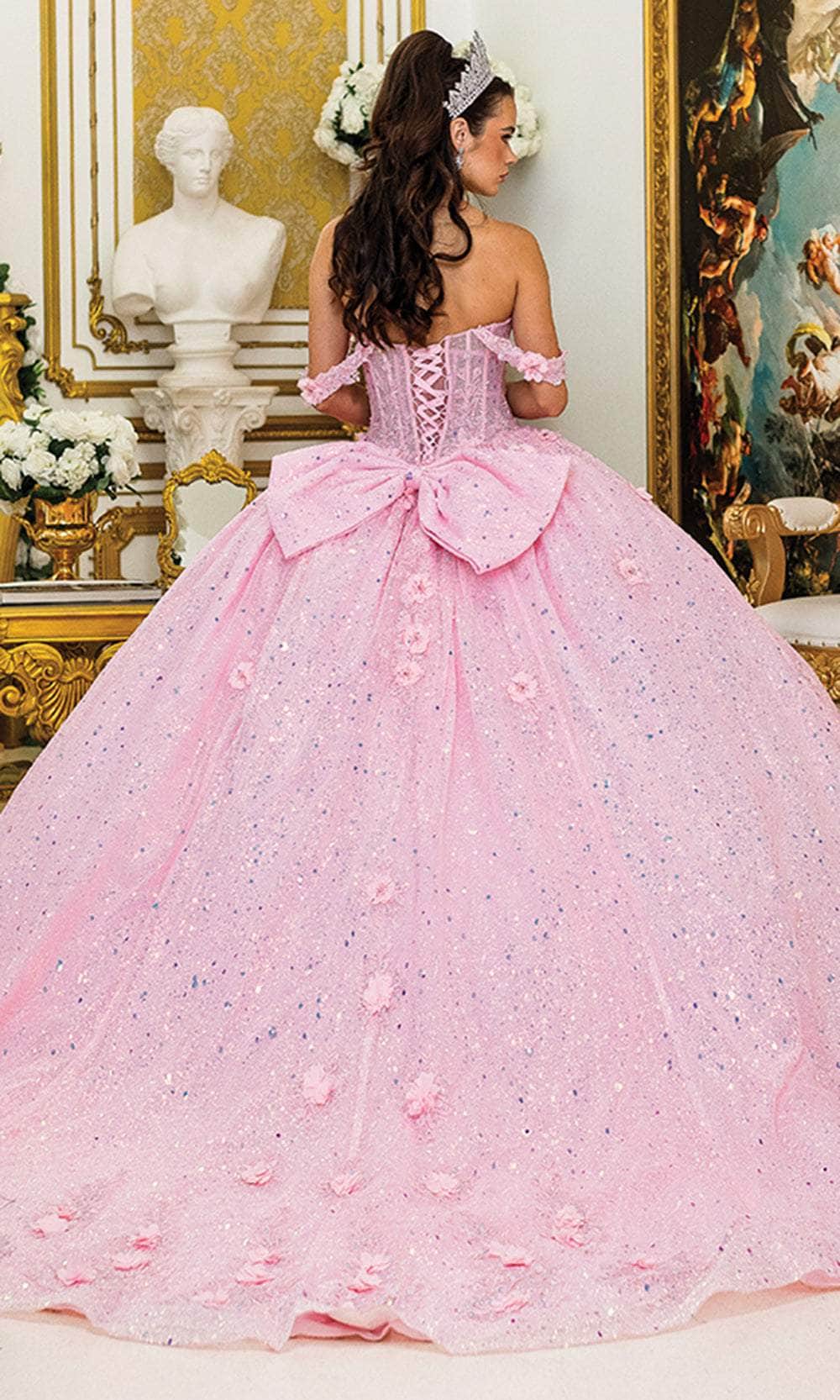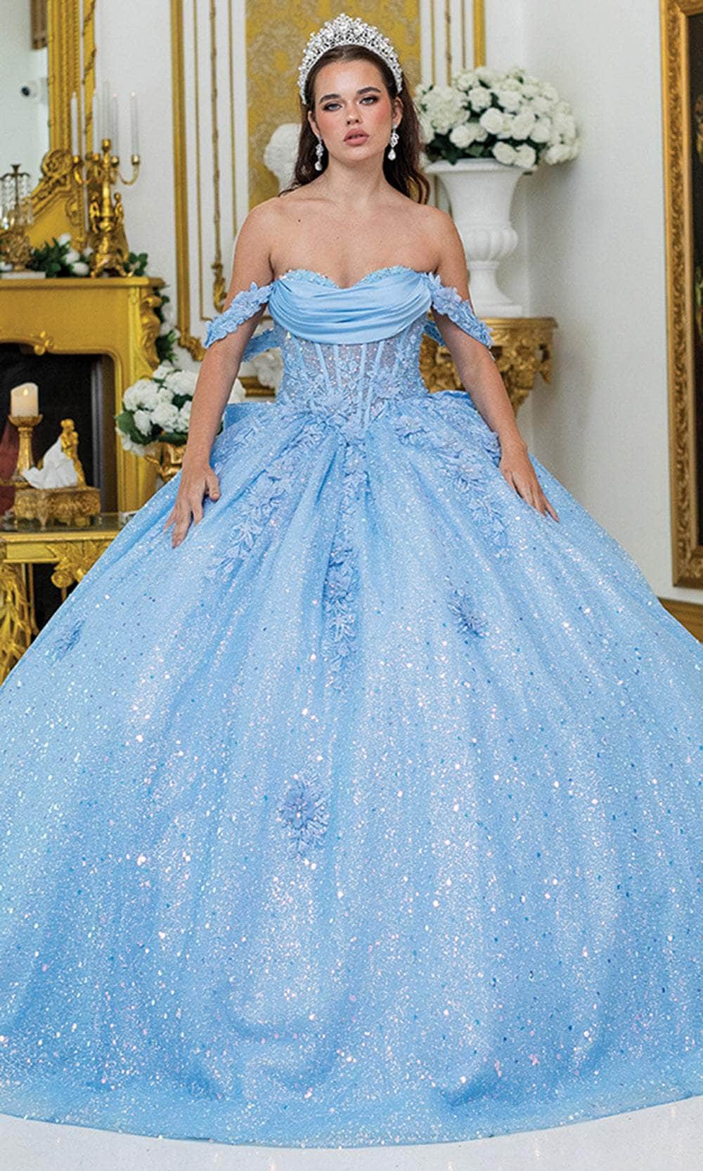 Radiate sophistication and sparkle in this stunning Dancing Queen 1984 ballgown, crafted for those who love all things glamorous. The gown features a sweetheart neckline, off-shoulder sleeves, illusion corset bodice, and a lace up back that sculpts the figure. A 3D floral appliques and glitter tulle overlay brings enchanting shimmer to the full skirt, while the Basque waistline enhances the flattering silhouette. Perfect for quinceaneras or formal galas, the Dancing Queen 1984 is designed to create magical memories and leave a lasting impression. Models are wearing Bahama Blue, Lilac, and Pink colors.
