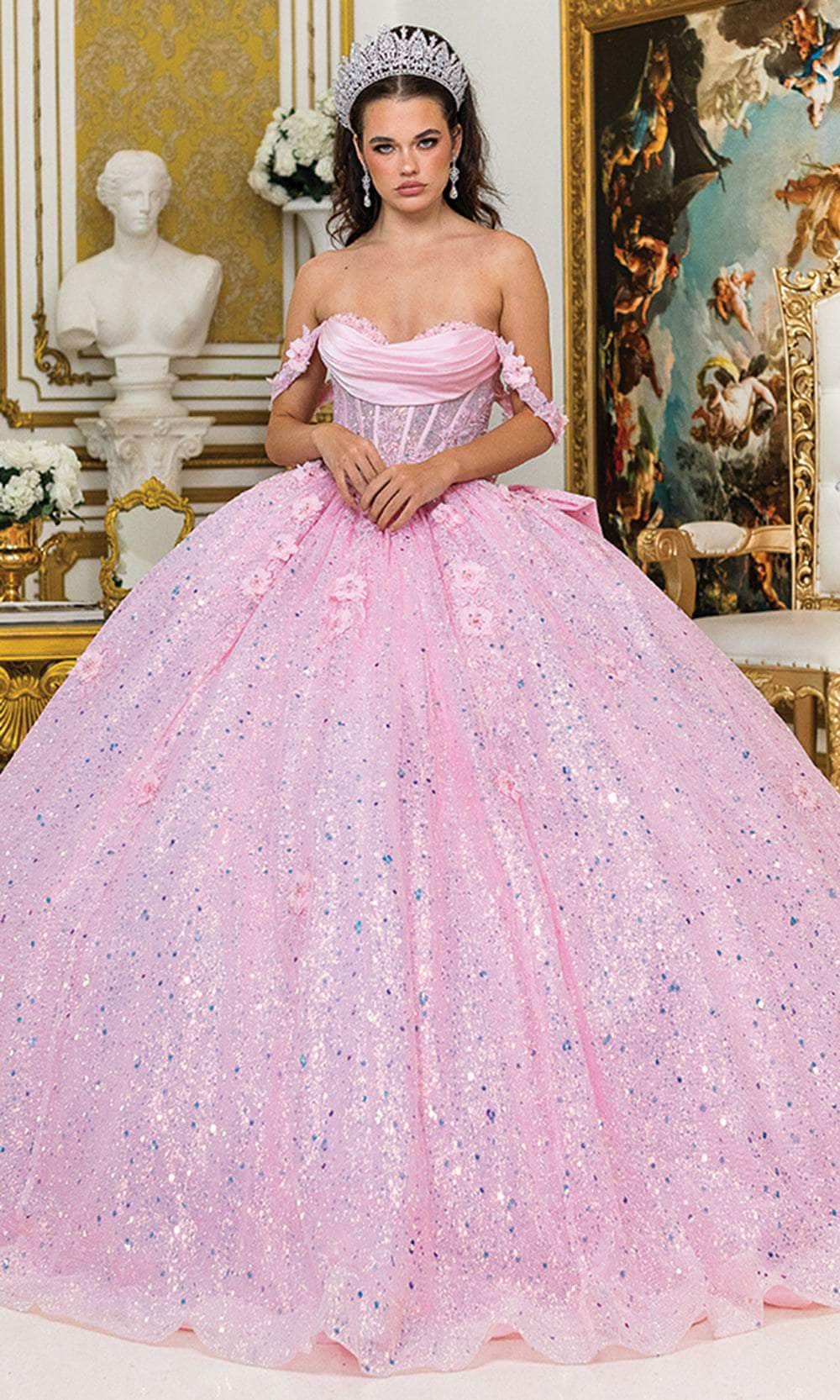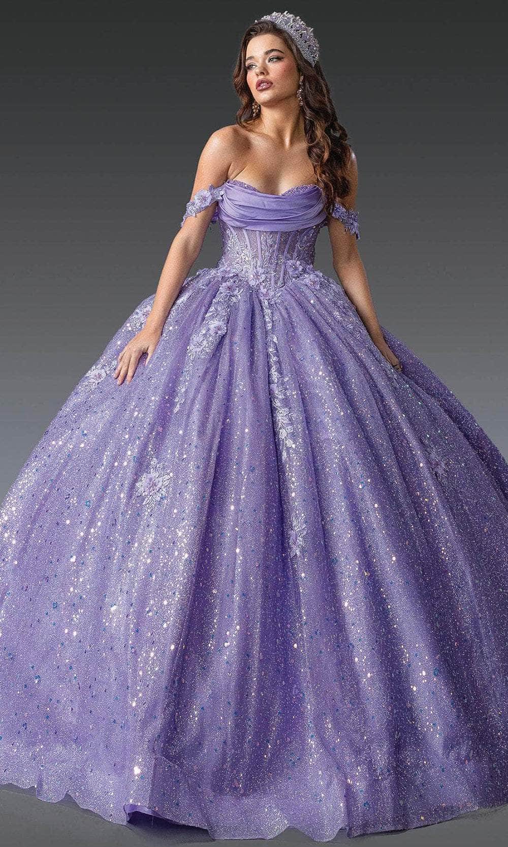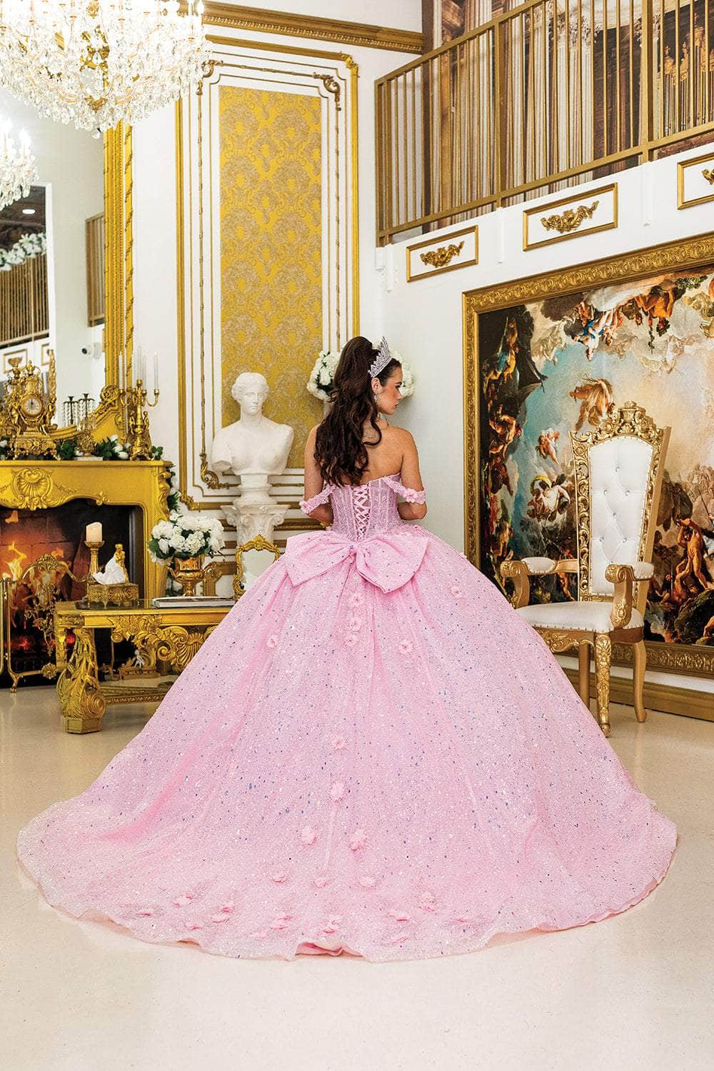Radiate sophistication and sparkle in this stunning Dancing Queen 1984 ballgown, crafted for those who love all things glamorous. The gown features a sweetheart neckline, off-shoulder sleeves, illusion corset bodice, and a lace up back that sculpts the figure. A 3D floral appliques and glitter tulle overlay brings enchanting shimmer to the full skirt, while the Basque waistline enhances the flattering silhouette. Perfect for quinceaneras or formal galas, the Dancing Queen 1984 is designed to create magical memories and leave a lasting impression. Models are wearing Bahama Blue, Lilac, and Pink colors.
