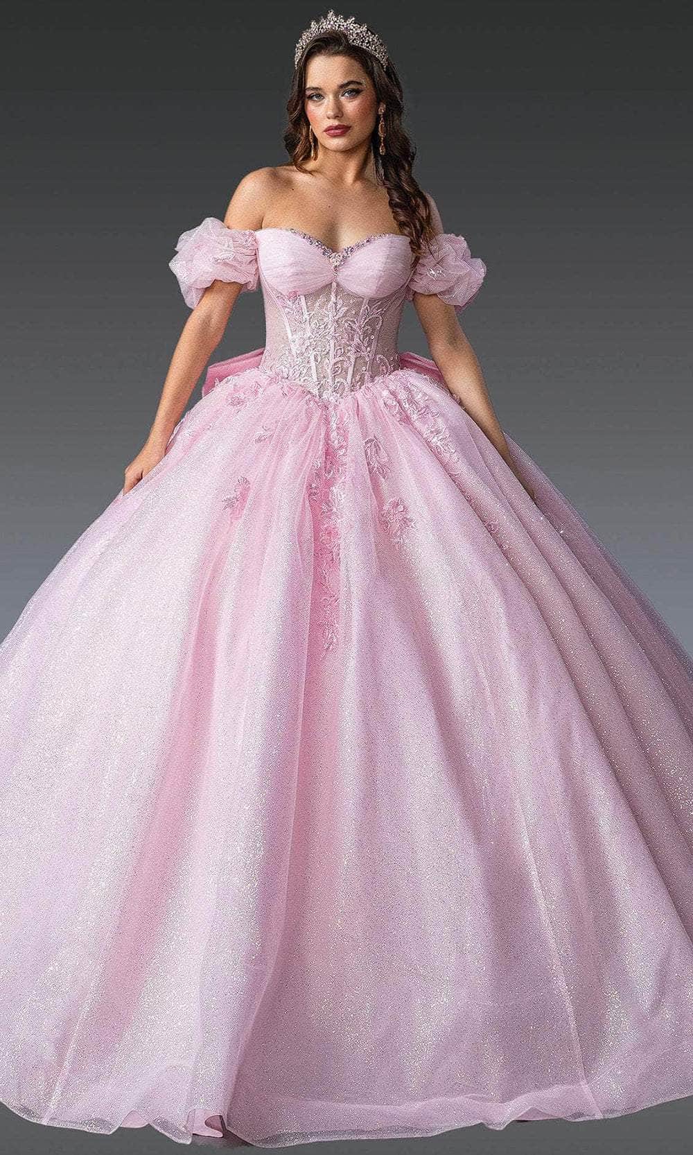 Step into the spotlight with the Dancing Queen 1985 ballgown, designed to capture attention with every twirl. This exquisite gown features an embroidered bodice with a subtly shimmering finish. The ruffled off-shoulder sleeves paired with sweetheart neckline and lace-up back blend romance with modern glam. The Basque waistline leads to a voluminous ballgown skirt, creating a regal silhouette perfect for quinceanera, galas, and formal soirees. Shine bright in the Dancing Queen 1985 gown. Models are wearing Bahama Blue, Blush, Fuchsia, Hunter Green, Lilac, Pink, and Red colors.