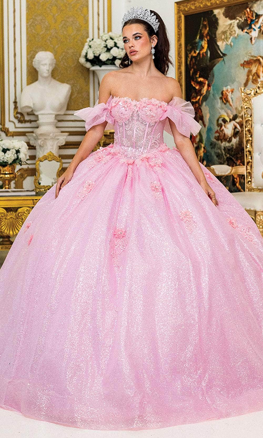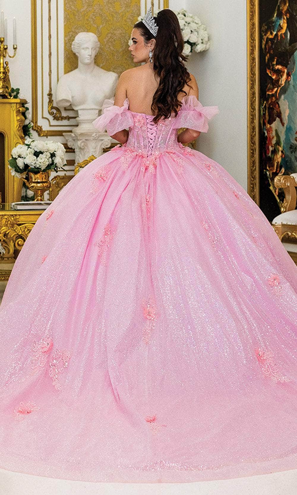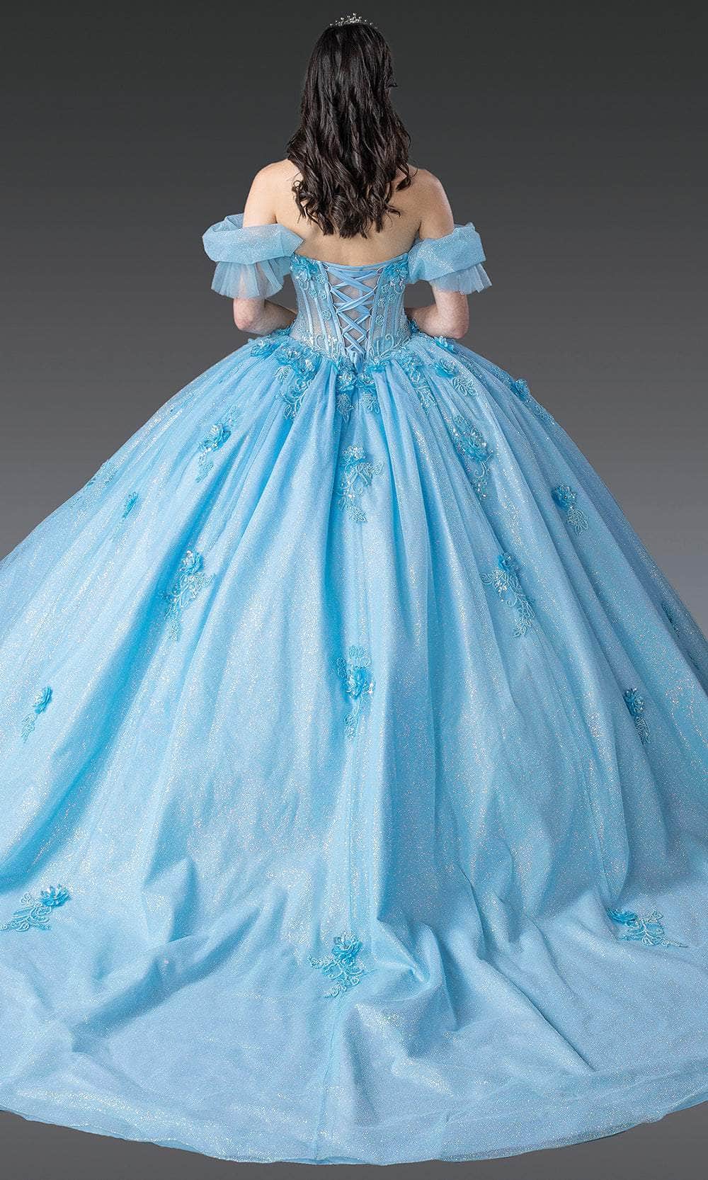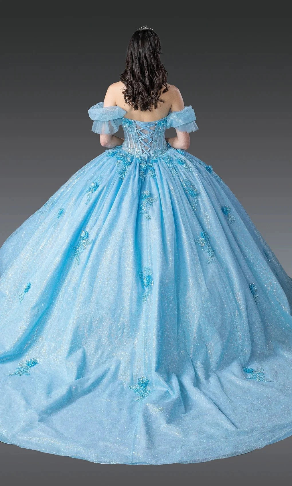 Embrace elegance with the Dancing Queen 1990 ballgown, designed to make your entrance unforgettable. This exquisite piece showcases an off-shoulder puff sleeves, sweetheart neckline and corset boning on a beautifully beaded bodice. Embellished with sparkling glitter and detailed 3D floral applique, this ballgown glimmers from every angle. The voluminous tulle skirt ensures you shine as the star of your celebration. The Dancing Queen 1990 is an exceptional choice for a Quinceanera or red carpet event, promising a regal and graceful statement. Models are wearing Bahama Blue, and Pink colors.