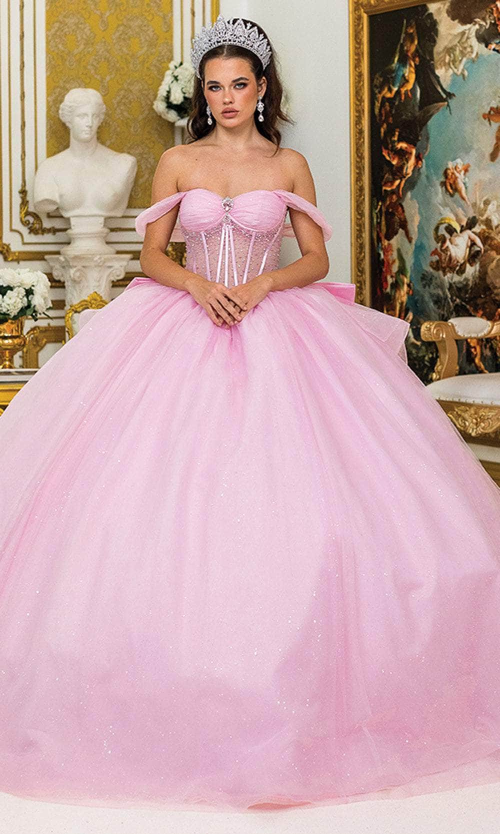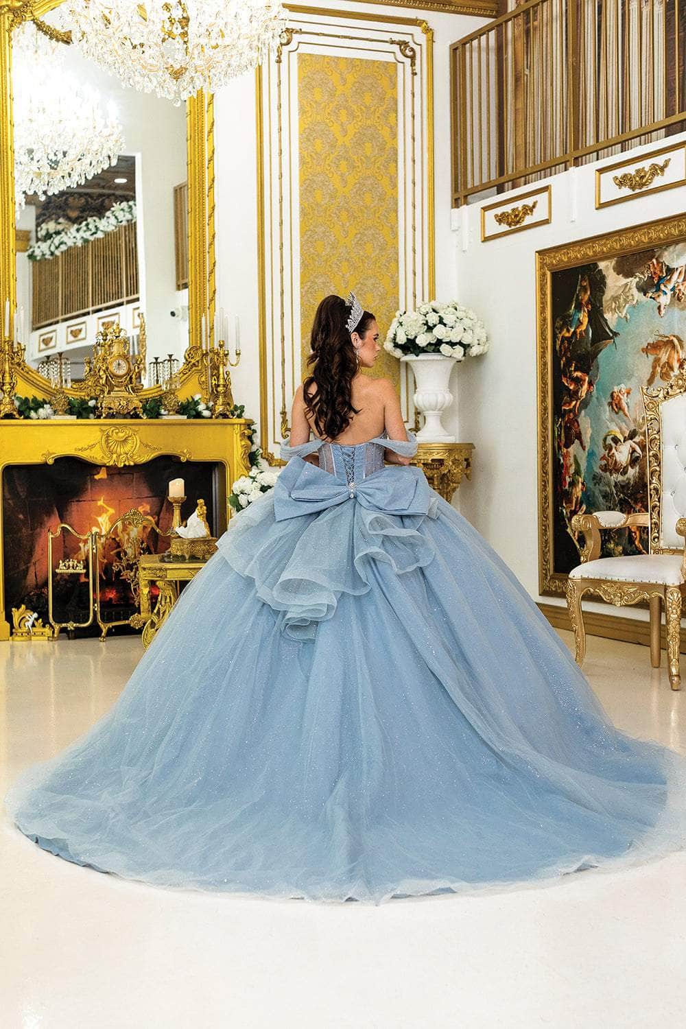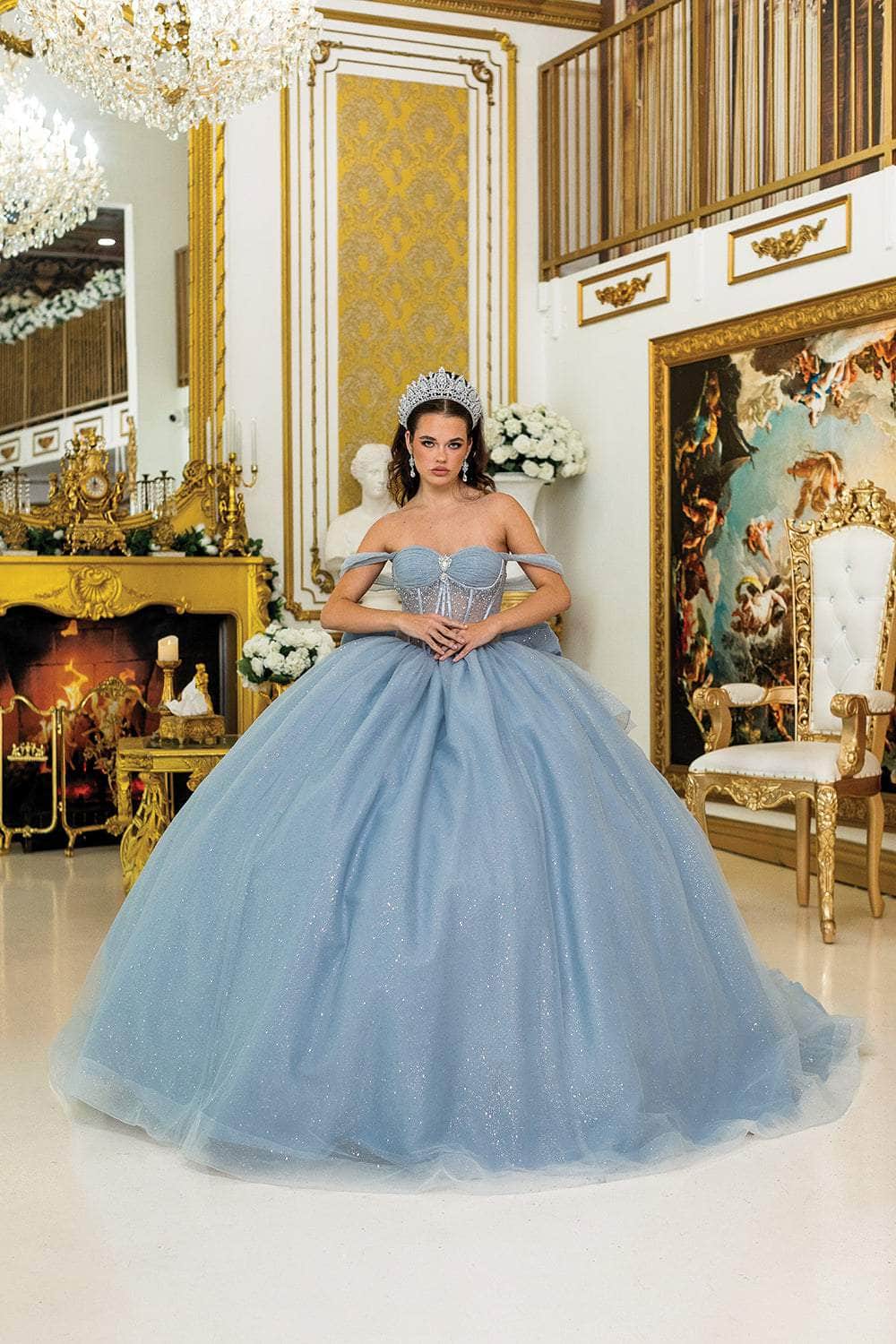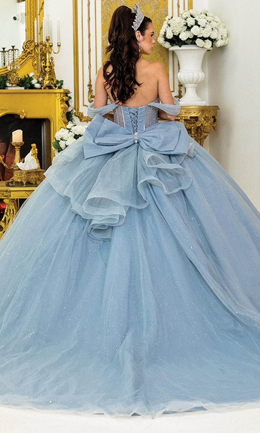 This Dancing Queen 1996 ethereal ballgown brings timeless beauty and modern flair together for a truly breathtaking look. The gown dazzles with a sweetheart neckline and off shoulder sleeves, paired with a glitter bodice that sparkles under the lights. The structured illusion corset bodice sculpts the waist and transitions into a flattering Basque waistline. An oversized back bow with ruffle and lace up back completes the ensemble, providing comfort and adjustability. Whether attending a lavish quinceanera or a glamorous gala, the Dancing Queen 1996 ensures you stand out gracefully all evening long. Models are wearing Dusty Blue, and Pink colors.