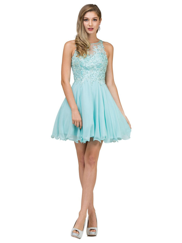 Sparkling with stones that glisten on the lace appliques festooned on the sleeveless bodice, this dainty piece showcases a jewel illusion over a sweetheart neckline and a sheer racerback. Fringed with embellished appliques, the layered A-line skirt froths down to a rolled short hem.