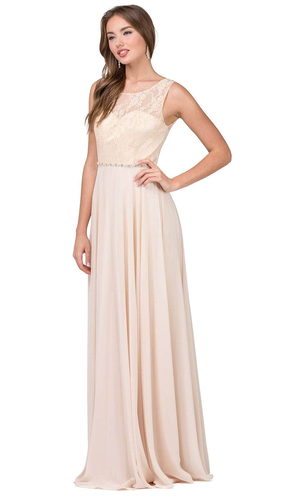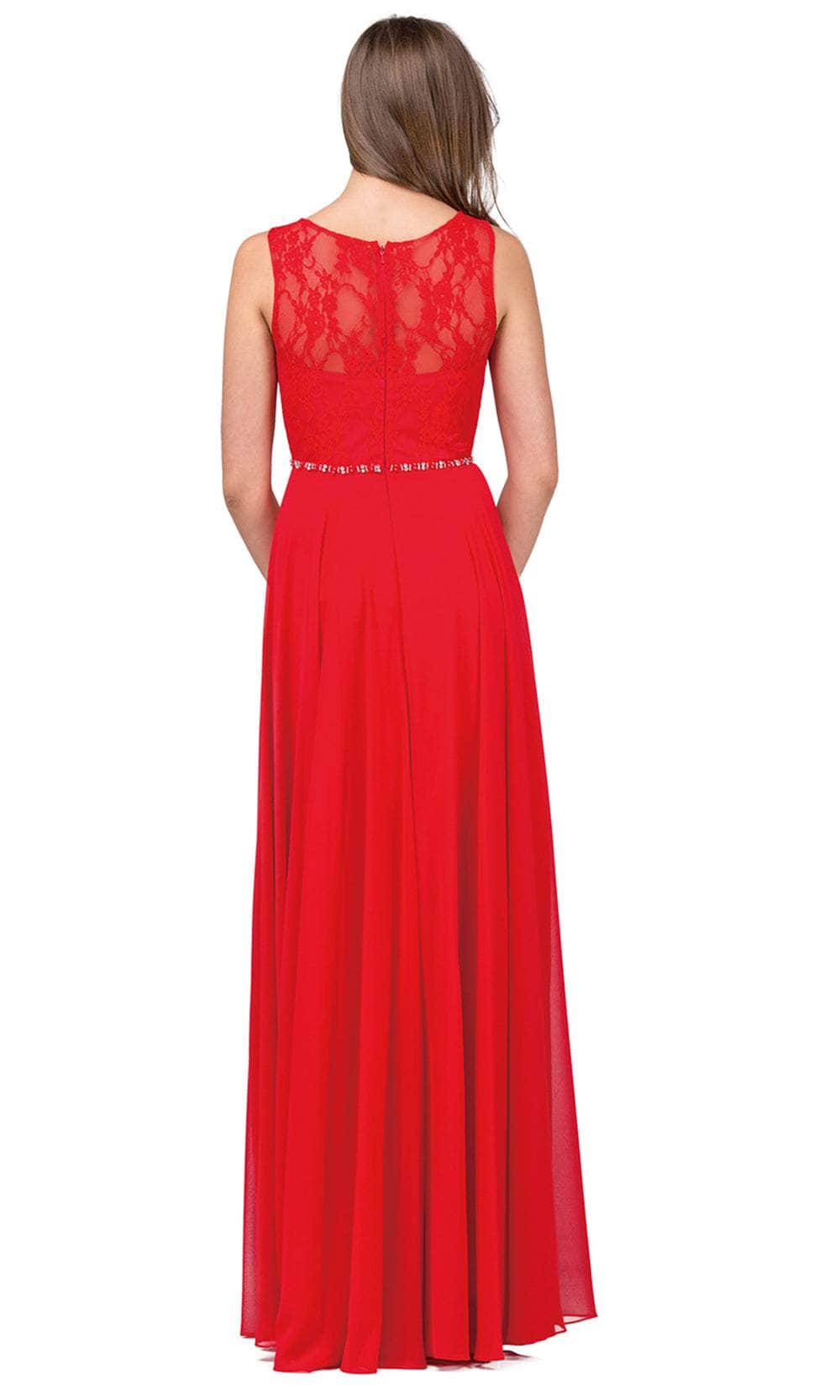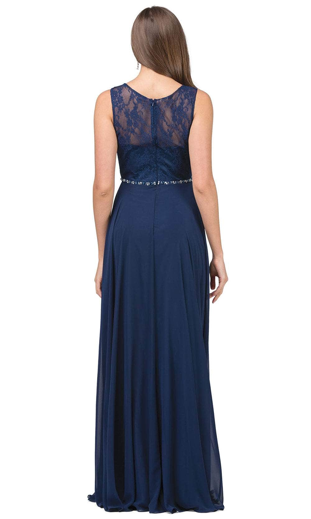 The Dancing Queen 2240 evening gown demands to be remembered. Tailored lines sculpt a flattering silhouette, highlighted by a graceful scoop neckline. The sleeveless design offers a touch of modern minimalism, while a captivating lace overlay adorns the bodice. A row of delicate jewels cinches the waist, drawing the eye to your curves. The sheer back adds a touch of allure, while the A-line skirt flows gracefully into a romantic brush train. This Dancing Queen 2240 creation will make you feel like a queen. Models are wearing the Black, Blush, Champagne, Navy, Red, and Silver colors.