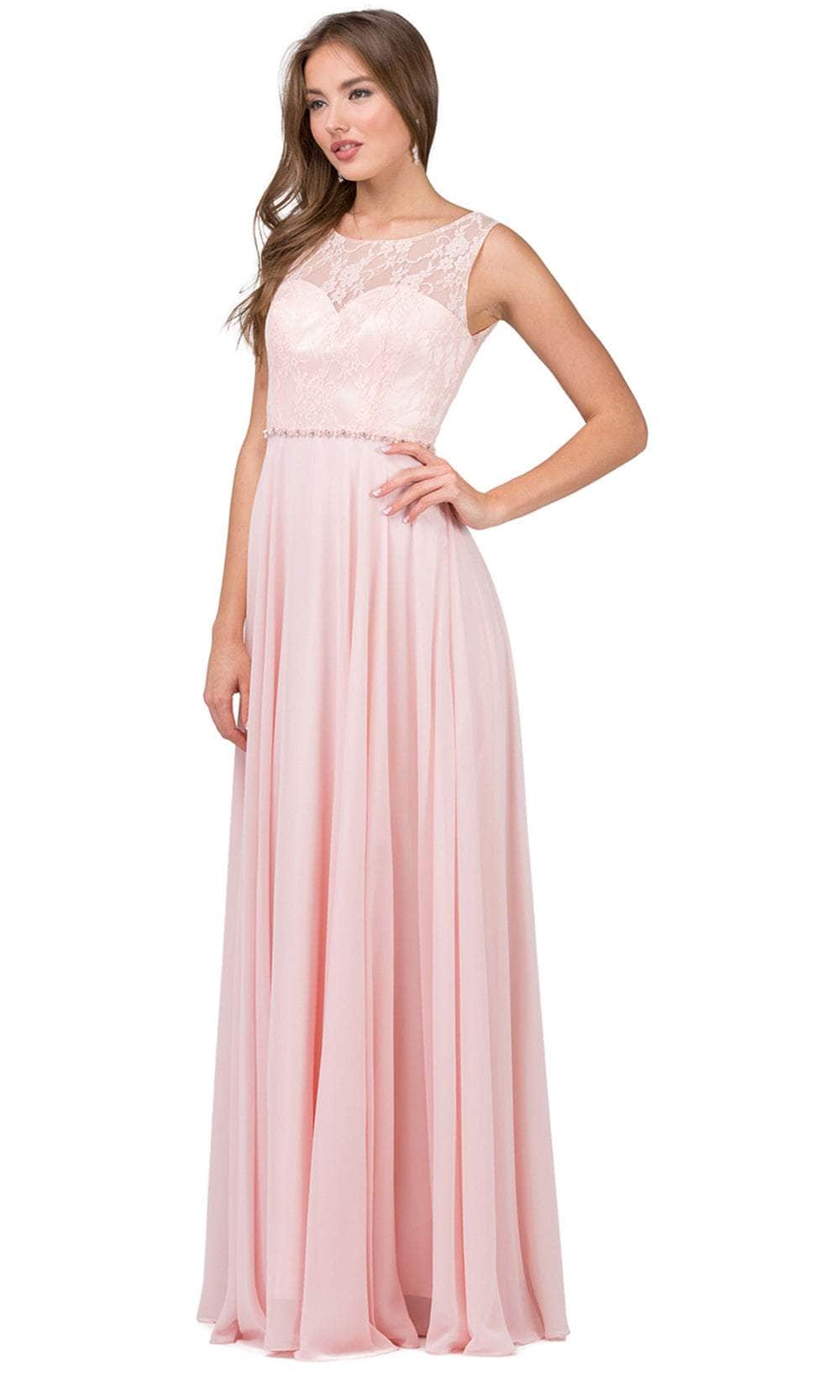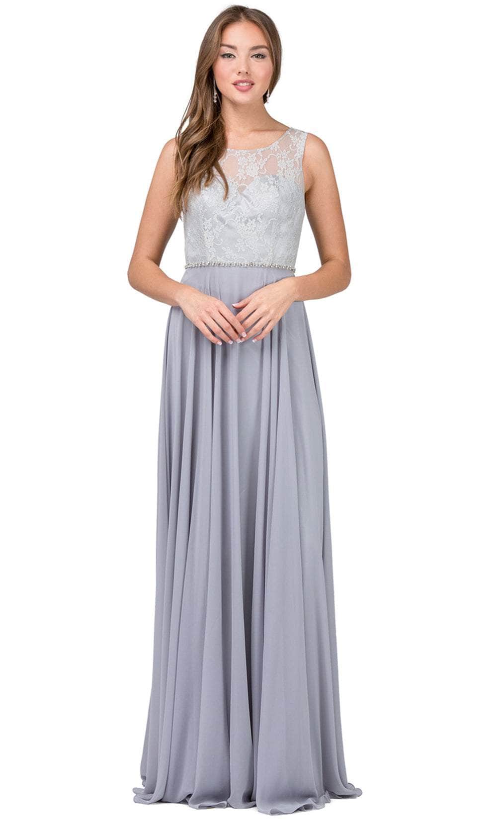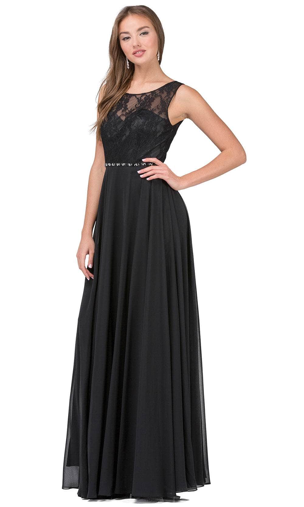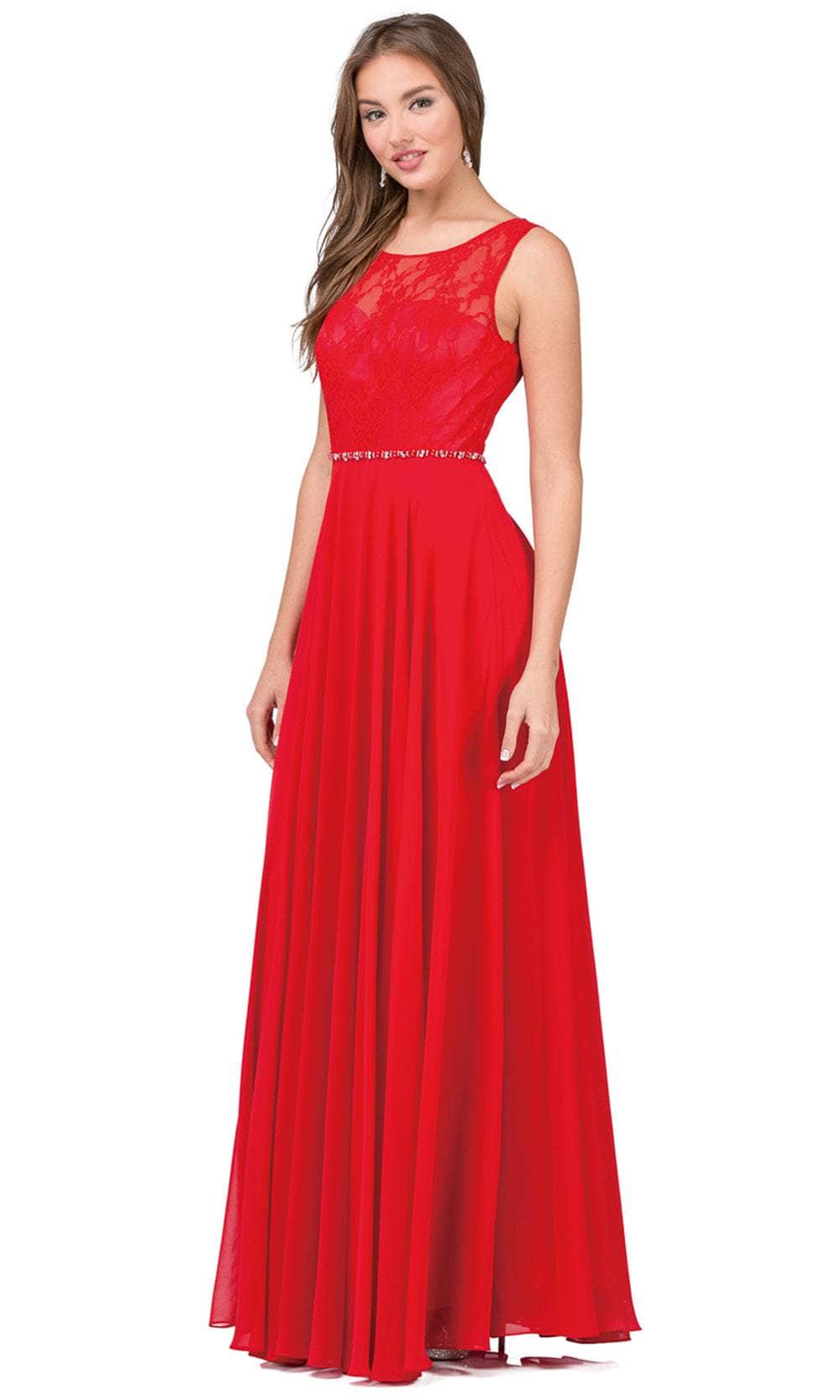 The Dancing Queen 2240 evening gown demands to be remembered. Tailored lines sculpt a flattering silhouette, highlighted by a graceful scoop neckline. The sleeveless design offers a touch of modern minimalism, while a captivating lace overlay adorns the bodice. A row of delicate jewels cinches the waist, drawing the eye to your curves. The sheer back adds a touch of allure, while the A-line skirt flows gracefully into a romantic brush train. This Dancing Queen 2240 creation will make you feel like a queen. Models are wearing the Black, Blush, Champagne, Navy, Red, and Silver colors.