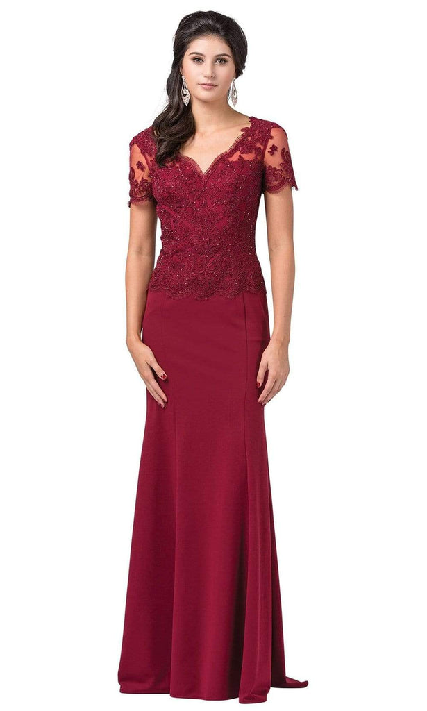 Saunter in sophistication while parading this Dancing Queen 2535 creation. Exquisitely ornamented with an intricate lace appliques, this piece shows an illusion v-neckline atop a rhinestone ornate bodice. Designed with short sleeves and a sheer v-open back, the sheath silhouette starts off from the sweetheart lining down to a brush of train. Wrap yourself in stunning beauty in this Dancing Queen masterpiece.