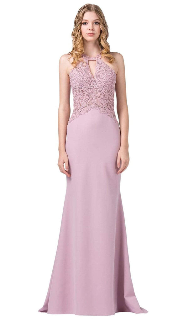 Get glamorous look with this dress by Dancing Queen 2787. Brandishes in a sleeveless, halter neckline with embroidered bodice styled with a front keyhole and an open back. The fitted bodice flourishes a full length trumpet skirt with a sweep train finish. Promote attention-grabbing style in this stunning Dancing Queen dress. Model is wearing Dusty Pink color.