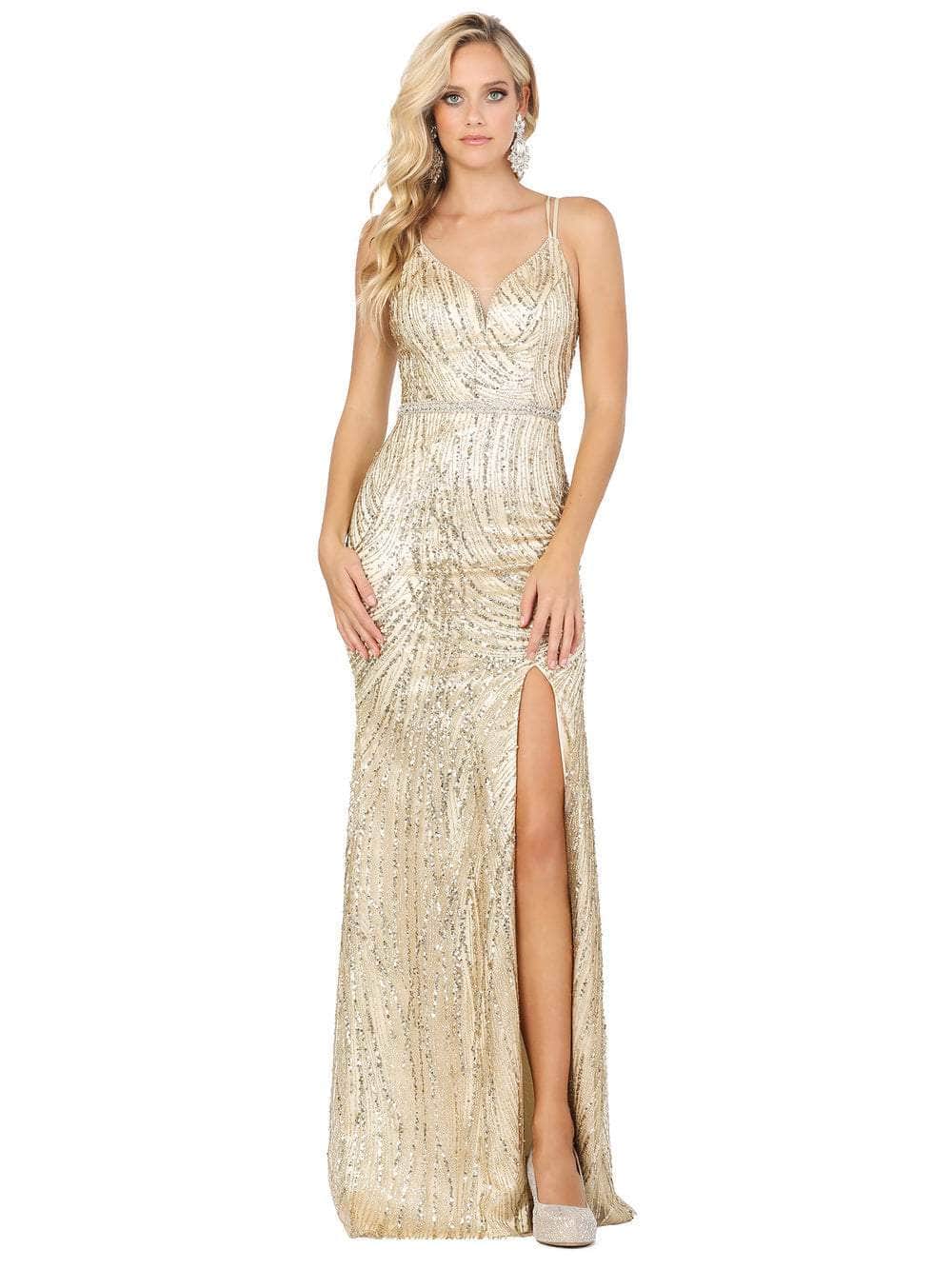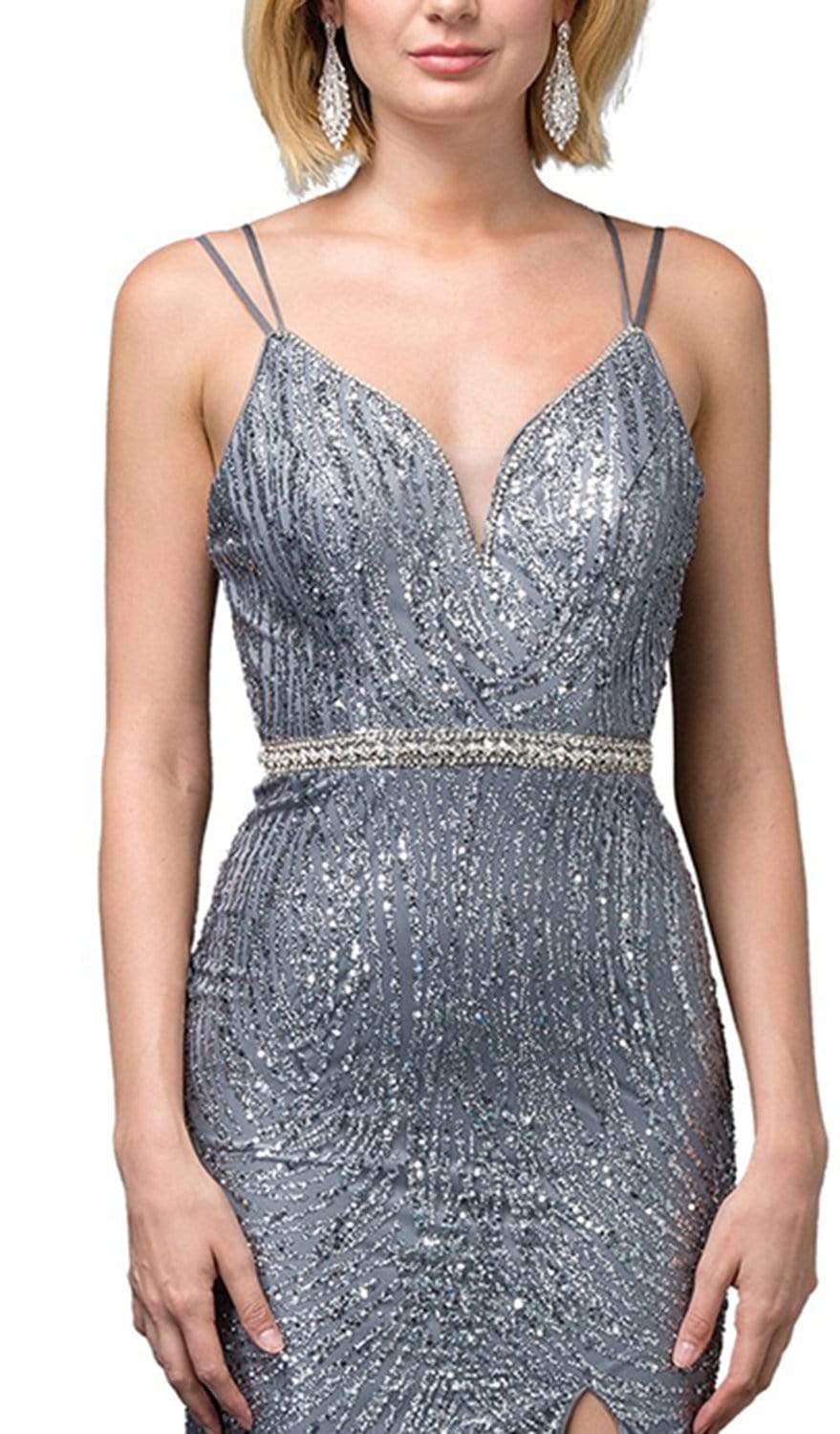 You deserve to feel beautiful when you don this feminine gown from Dancing Queen 2826. Stunning glitter embellishments adorn the whole ensemble for a shimmering effect as the fitted bodice features a plunging V neckline V neckline with sheer inset detail at the bust. Dual spaghetti straps lend support to the top as it leads to the strappy corset open back. The natural waist is accented with a beaded belt, which leads to the full length slim mermaid skirt. A side slit and small train finishes the look of this glamorous dress. Be in this Dancing Queen ensemble and leave a lasting impression. Models are pictured wearing the  Steel Blue, and Gold colors.