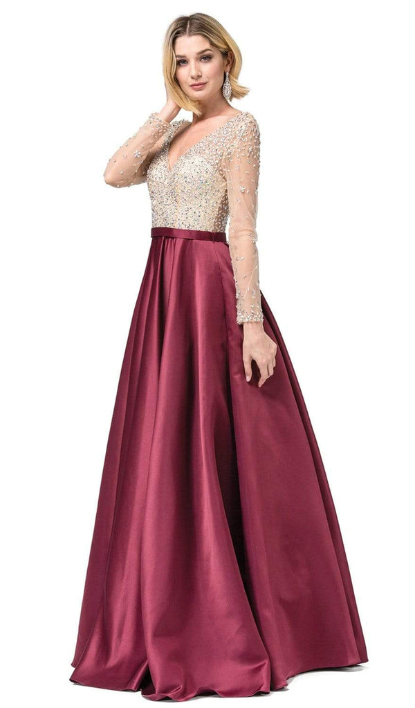 Look fantastic from head to toe in this mesmerizing Dancing Queen 2840 creation. Crafted with shimmering beadwork texturing the nude bodice, this gown starts with an illusion v-neckline and long sleeves. The back is styled with a deep v-open design. The silhouette starts off with a slender waistband as the satin A-line skirt cascades with a full-length hemline. Flatter those refined assets in this Dancing Queen masterpiece. Model is wearing the Burgundy color.