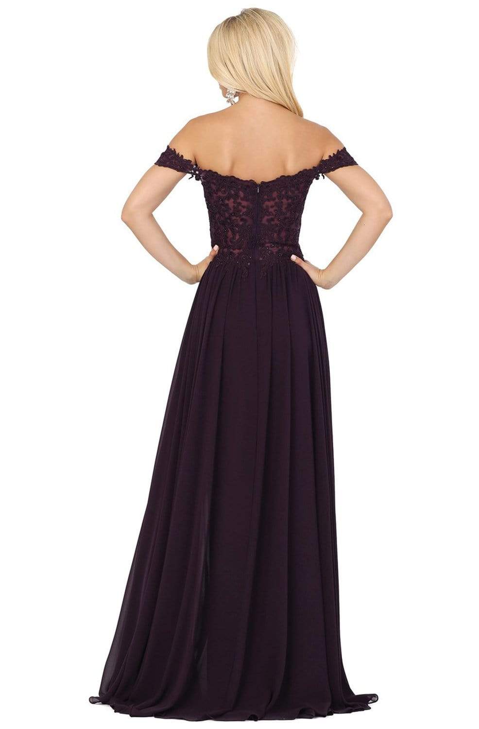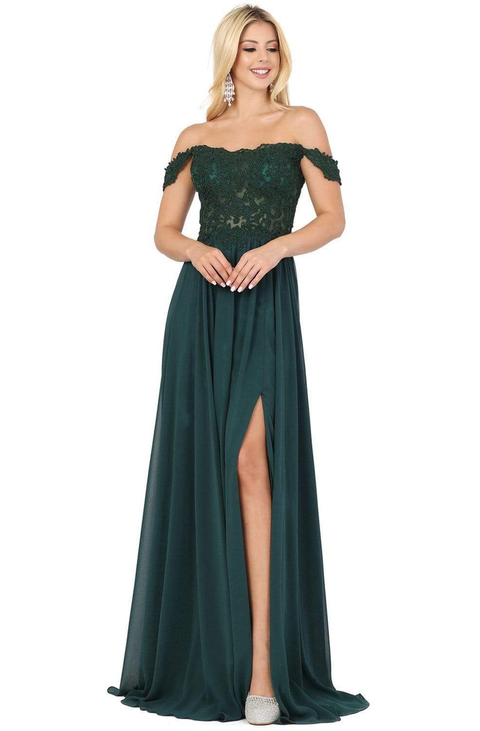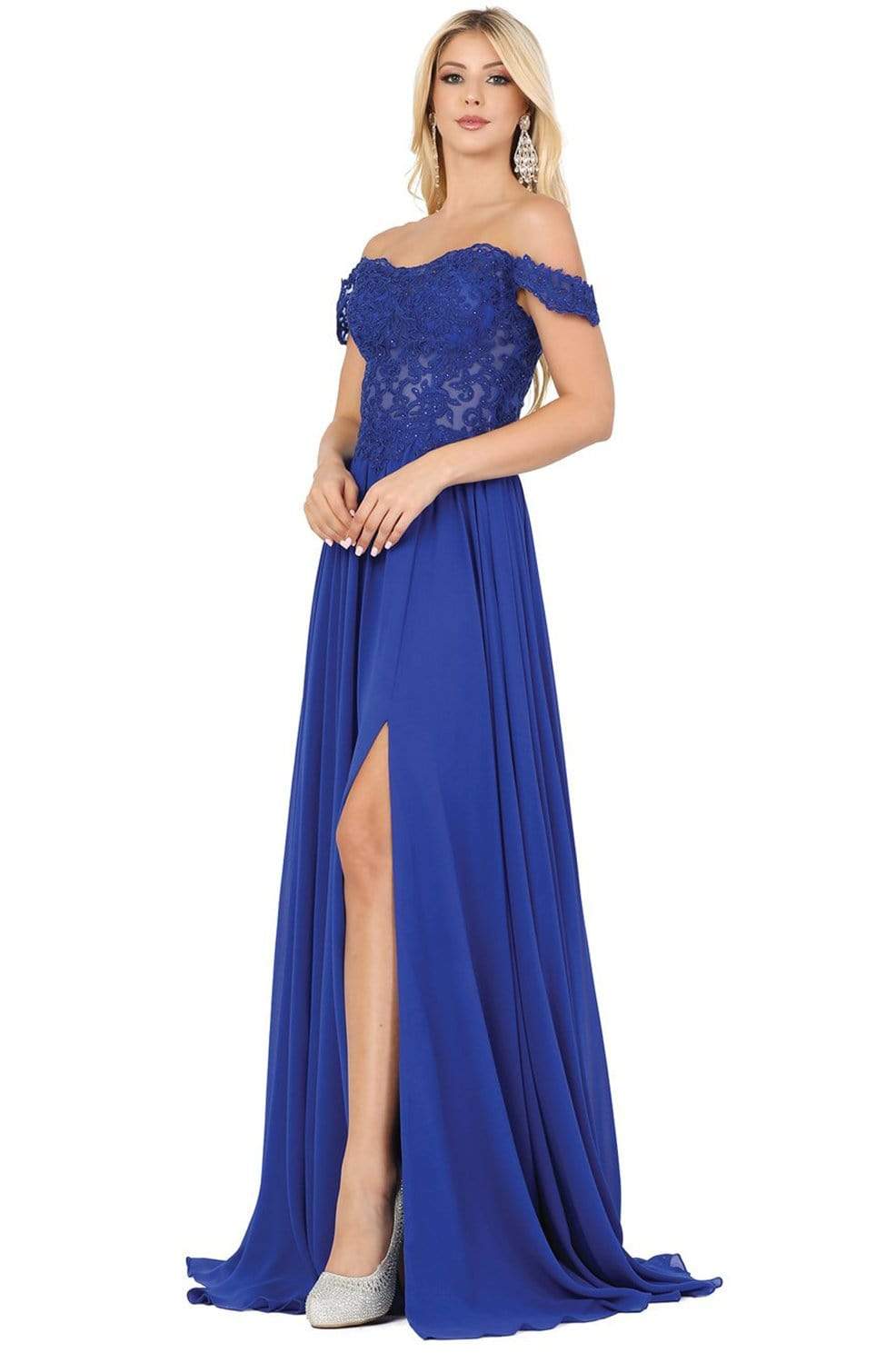 Dream big in this dazzling evening dress from Dancing Queen 2933 Prom dress. The semi-sheer bodice has a glamorously off shoulder neckline with draped sleeves, wrapped in romantic beaded lace. An A-line full skirt falls down the ground while revealing a high leg slit. This charming piece for black tie event, Prom and formal party by Dancing Queen shows pure grace and elegance.