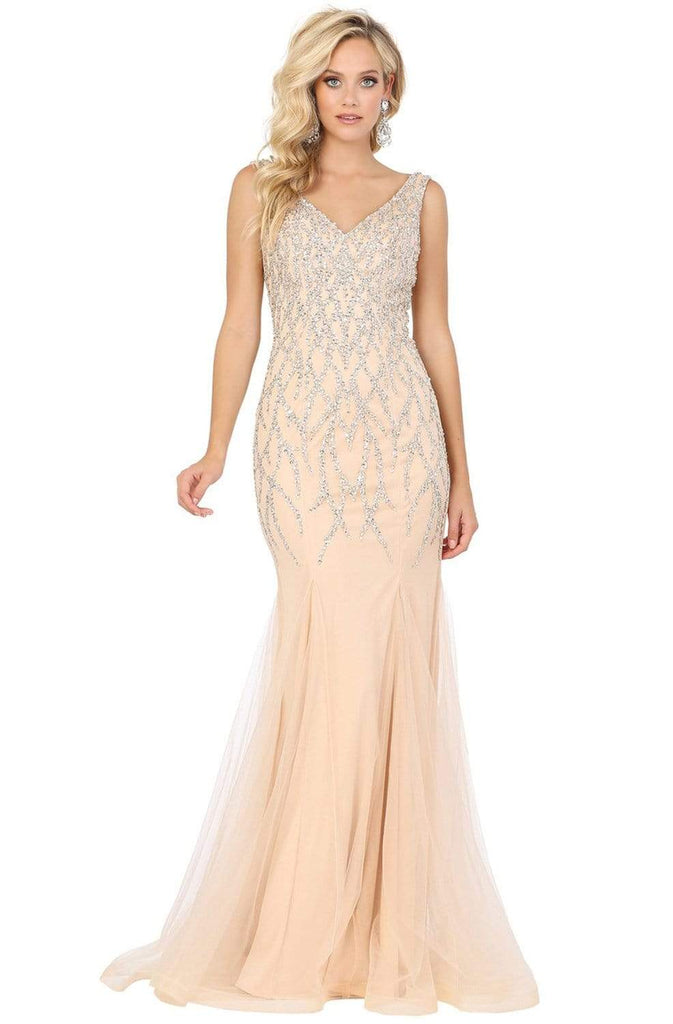 Turn yourself into a style sensation in this exquisite Dancing Queen 2957 creation. Graces with trailing metallic beadwork, this gown reveals a deep v-neckline on a sleeveless bodice. The plunging v-open back design is cinched with a corset-styled accent. Flourishing a tailored fit, the trumpet skirt parades lush godet inserts grace its gossamer flare and train. Look utterly fetching in this Dancing Queen masterpiece.