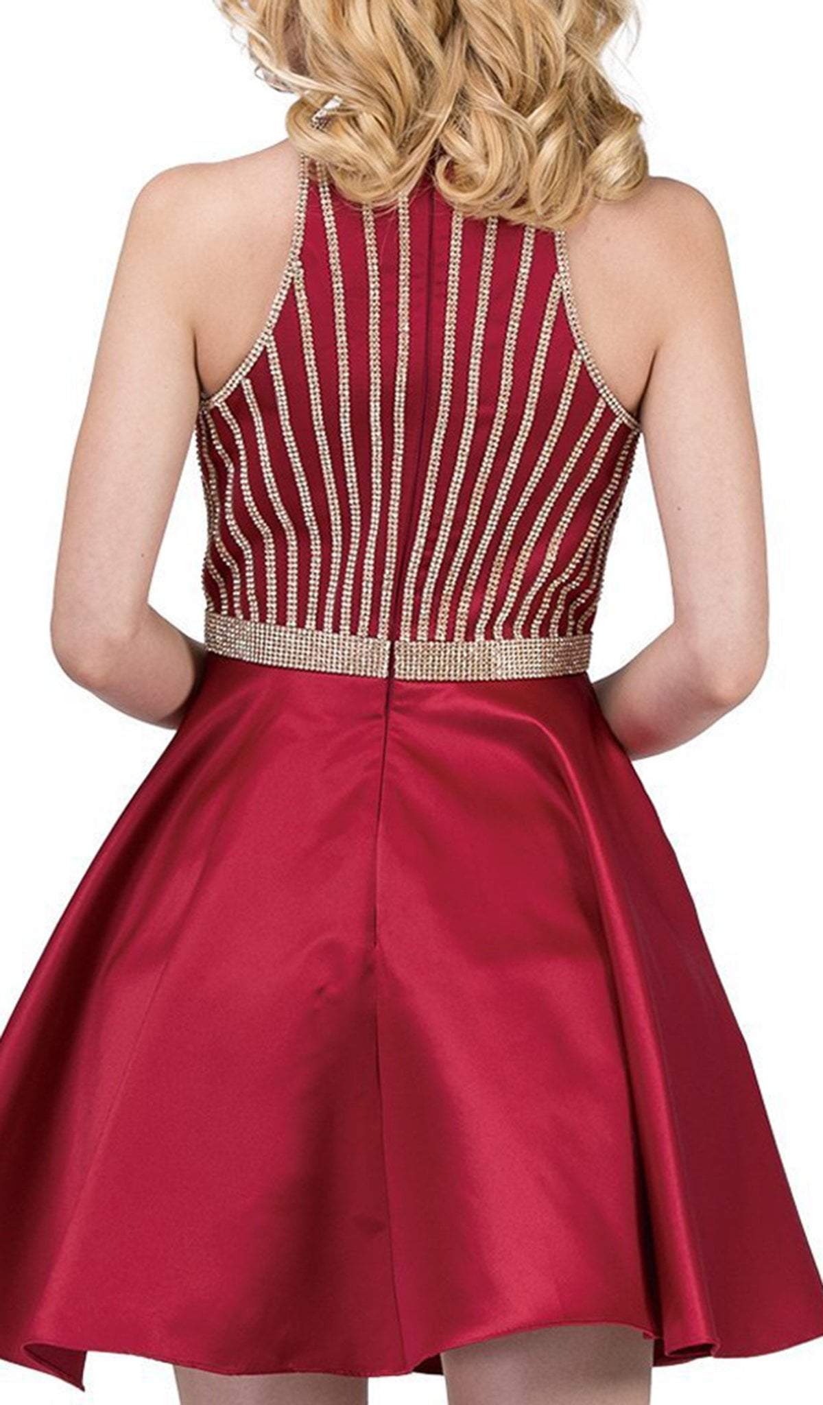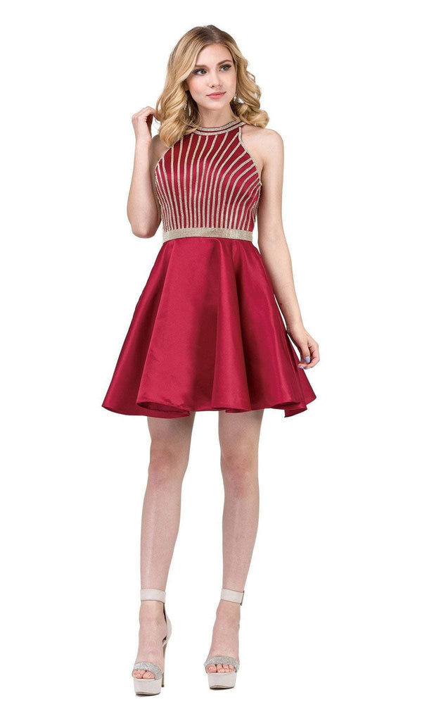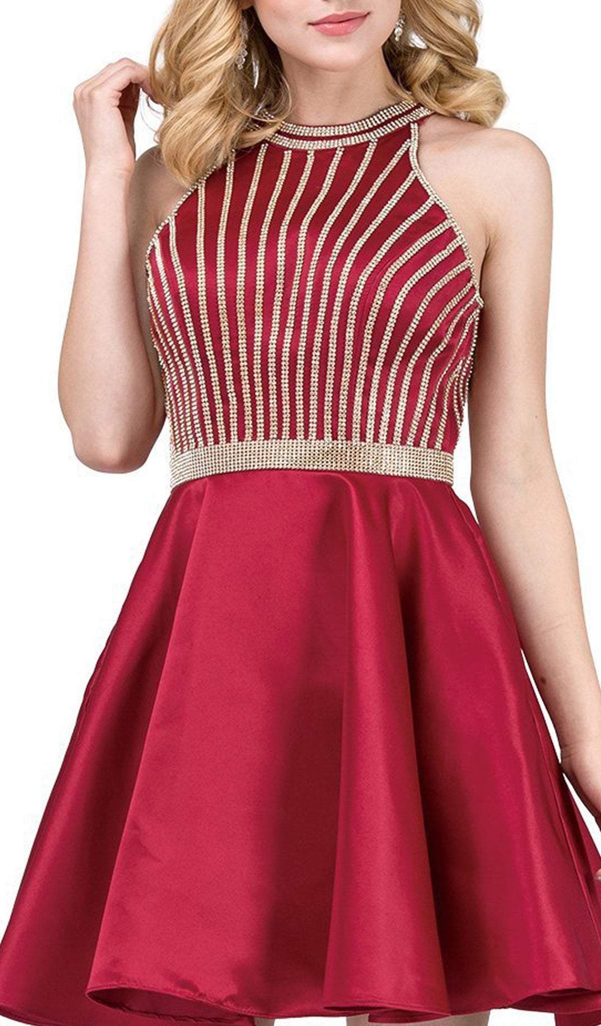Promote attention-grabbing style in this stunning Dancing Queen 3041. This sweet lovely dress glams in a sleeveless, halter neckline with fitted bodice elegantly decked with gold beading. The dress has a racerback style and a mid-thigh flowy A-line skirt. Every detail of this Dancing Queen is dripping with faultless charm!