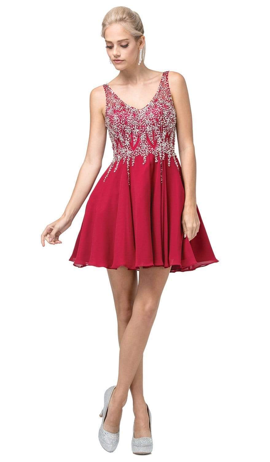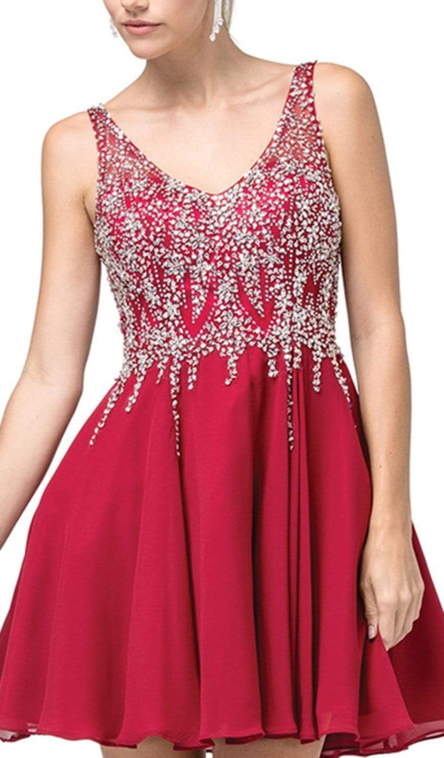 Be ready to capture the spirit of that romantic evening in this glamorous Dancing Queen 3129 cocktail dress. Striking rhinestones, beads, and sequins embellishments adorn the sheer-illusion mesh fitted bodice for a sparkling effect. A V neckline frames the bodice over a distinct sweetheart lining as the back flaunts an open scoop cut. The glittering accents trail stunningly onto the short a-line chiffon skirt as layers of satin and tulle-trimmed linings provide the skirt with added volume. This short Dancing Queen homecoming piece is an awesome pick for special events.