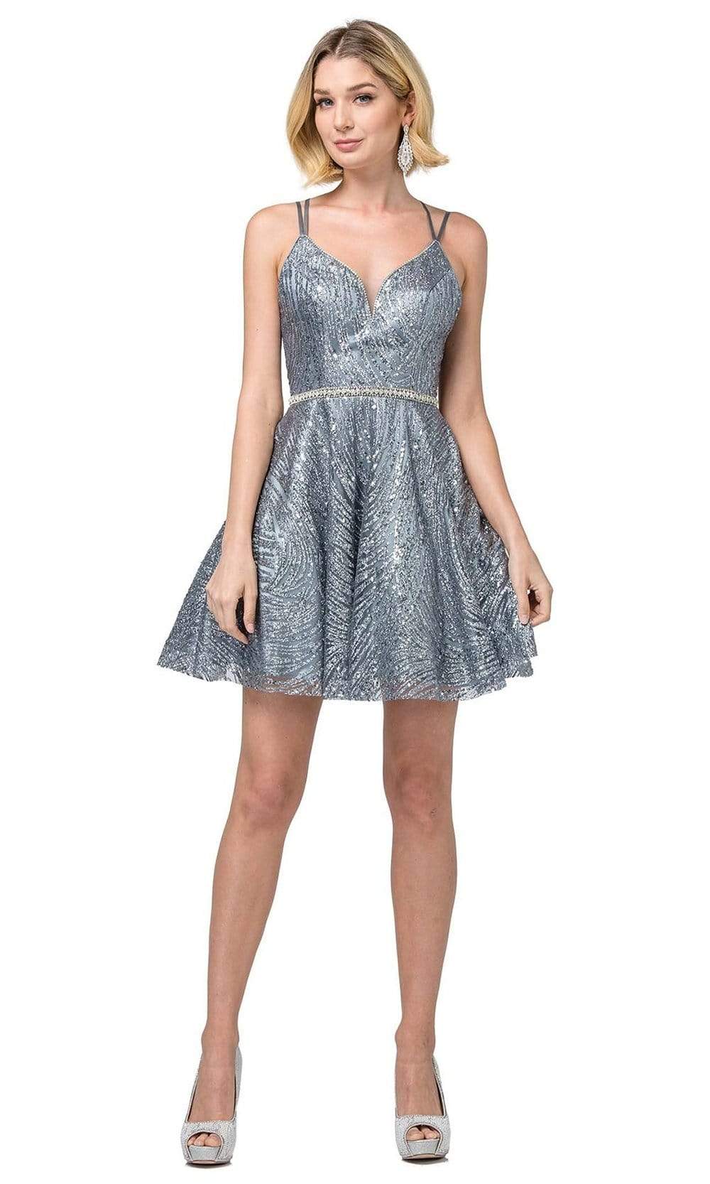 Fill the room with warmth and light in this radiant dress by Dancing Queen 3227. This style fashions a sleeveless, plunging V-neckline with shoulder straps. Adorned with glittering embellishments, the dress has a strappy back and flourishes a sassy A-line silhouette. Optimize the attraction of your special event in this alluring dress by Dancing Queen. Find more sweet sixteen dresses!