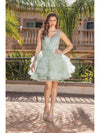 Get ready for everyone to stop and stare when you show up in this Dancing Queen 3273 masterpiece. The fitted bodice is lavishly crafted with beautiful lace embroidery and flaunts a flattering V-neckline. It also displays a sweetheart lining, wide shoulder straps and an illusion mid-open scoop back. The tulle skirt flares a mid-thigh A-line silhouette with multiple ruffle tiers edged with horsehair hem. This Dancing Queen dress is awesome for prom or for any special night event! Models are wearing the Champagne, and Sage colors.