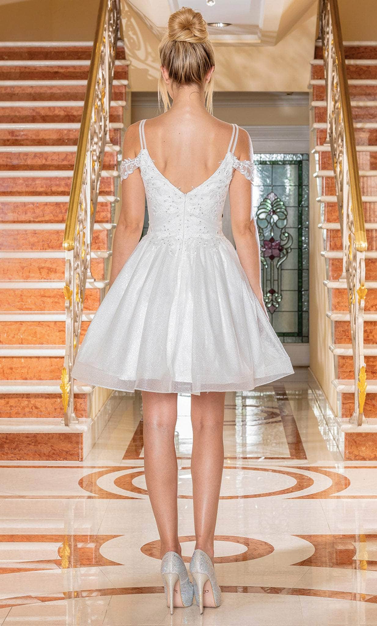 Capture the glamour as you walk on this stunning gorgeous Dancing Queen 3290. Be beautiful wearing this mini gown made with shimmering fabric. The fitted bodice is covered with floral lace and presents an illusion sweetheart neckline. Moreover, it has spaghetti straps and drop sleeves made with the floral lace fabric. To flatter your style, the sparkling skirt flares down to the mid-thigh. Feel like a star in this magical masterpiece by Dancing Queen 3290. Models are wearing Bahama Blue, Blush and Off White colors.