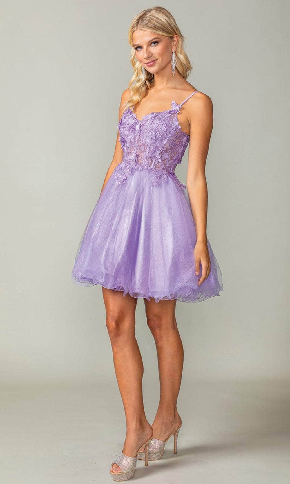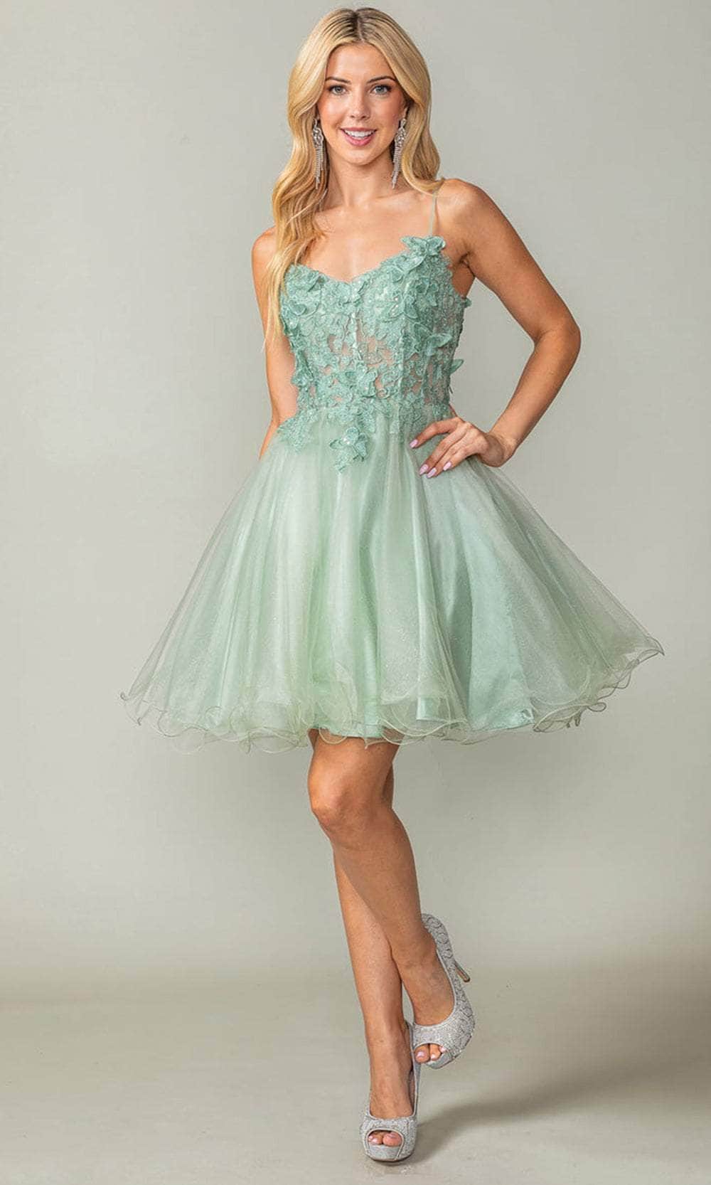 Captivate with sophisticated allure in the Dancing Queen 3341 cocktail dress. Tailoring expertise sculpts the silhouette, providing a perfect foundation for the delicate spaghetti straps and plunging v-neckline. This neckline flatters your figure and leads to a captivating sheer bodice adorned with intricate lace appliques and shimmering rhinestones. Strategically placed boning defines your curves and adds a touch of structure. The lace-up back ensures a flawless fit and adds a touch of drama. The layered skirt dances around your legs with every step, finishing in a playful short hem. Let the Dancing Queen 3341 be your partner in captivating the night. Models are wearing the Champagne, Lilac, and Sage colors.