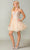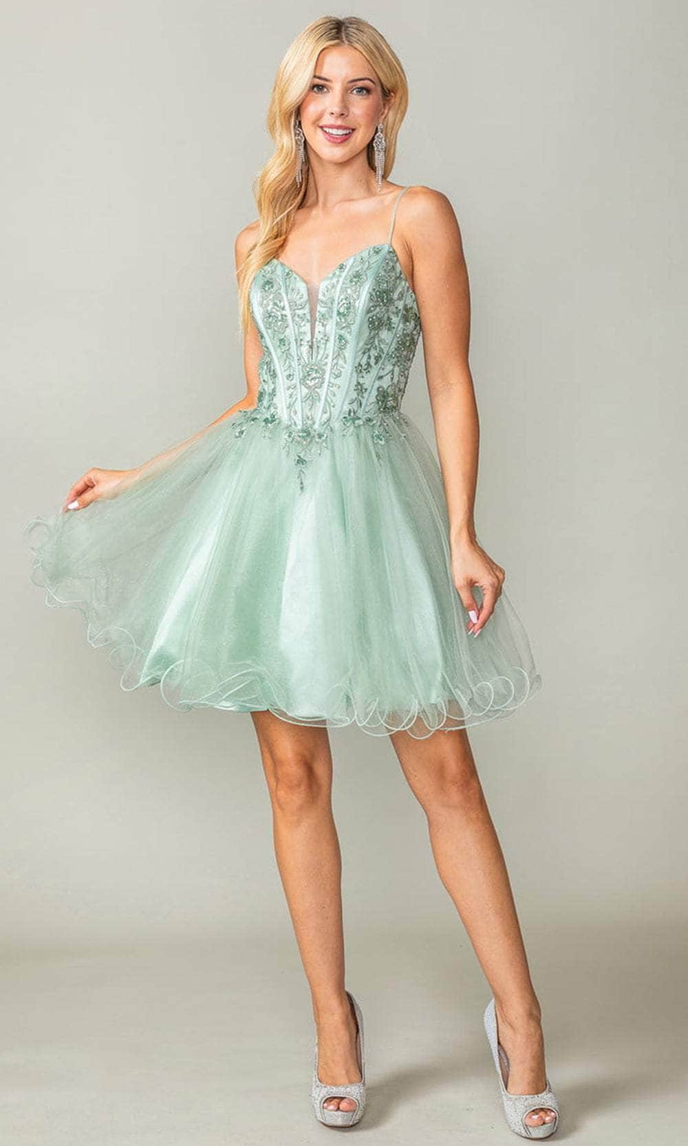 Captivate the room in the Dancing Queen 3351 cocktail dress. Expert tailoring sculpts the silhouette, providing a base for the delicate spaghetti straps. The plunging v-neckline is accentuated by an illusion inset, creating a hint of mystery and subtle allure. Strategically placed corset boning is adorned with exquisite lace appliques and shimmering rhinestones, highlighting your curves and adding a touch of dazzling detail. The lace-up back ensures a perfect fit and a touch of drama, while the layered skirt dances around your legs with every step. The playful short hem adds a touch of youthful energy, making this Dancing Queen 3351 creation the perfect blend of elegance and modern flair. Models are wearing the Blush, Champagne, and Sage colors.
