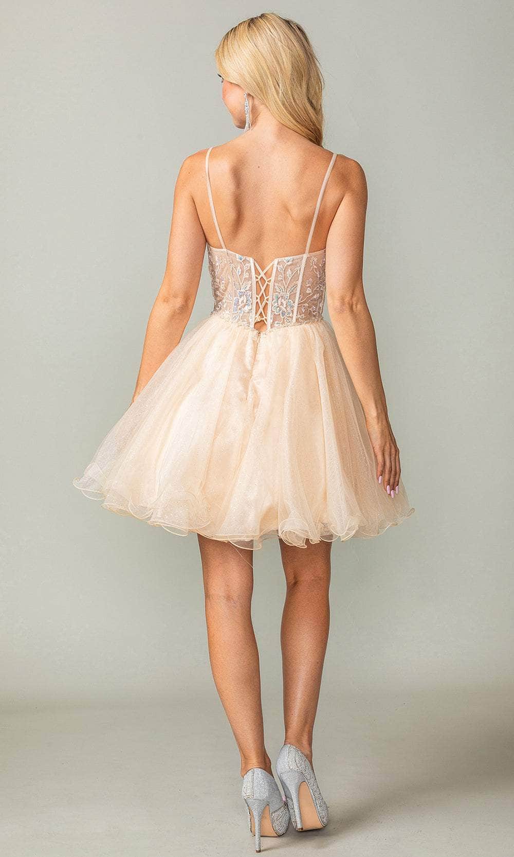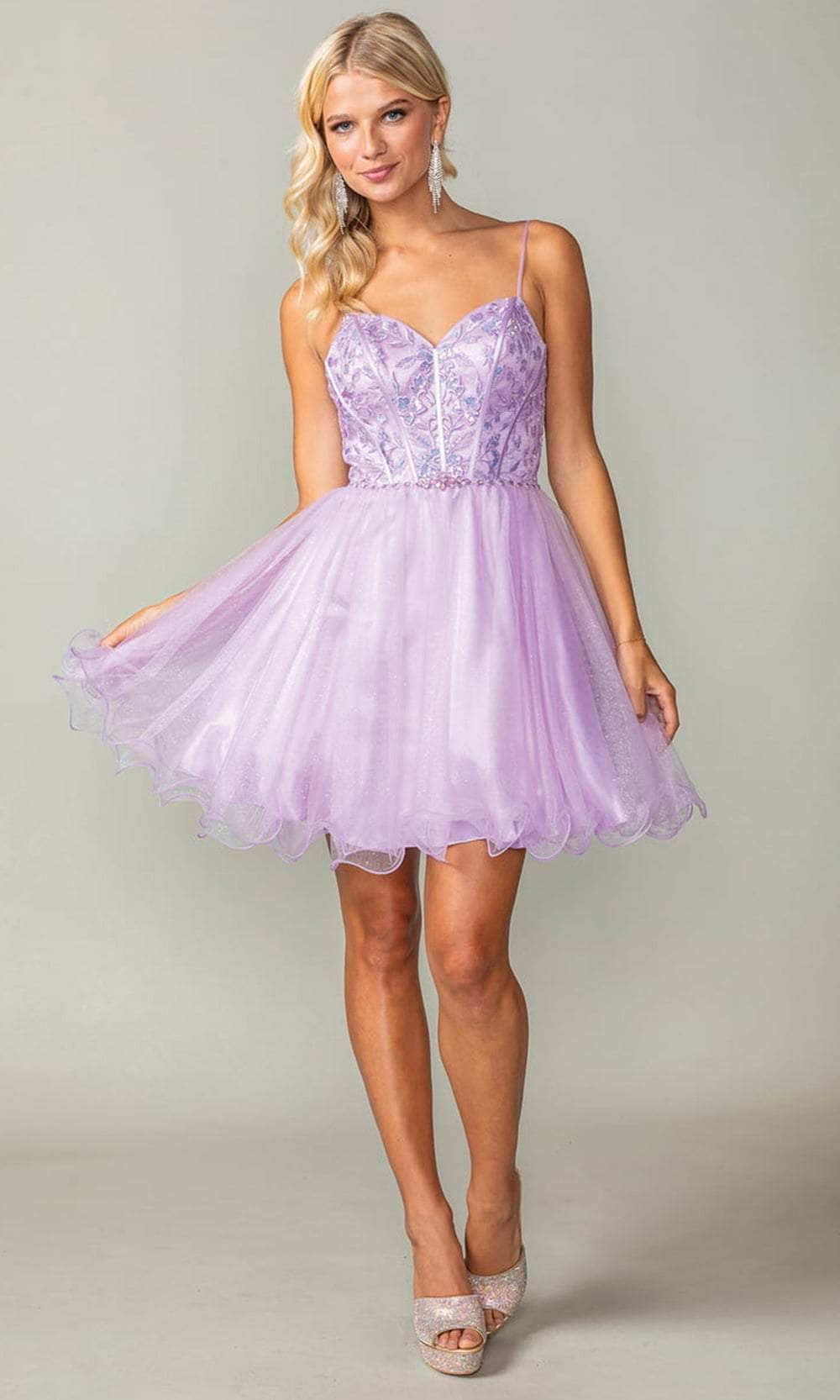Embrace the essence of springtime romance in the Dancing Queen 3352 cocktail dress. Tailoring expertise sculpts a flattering silhouette, accented by delicate spaghetti straps. Exquisite floral embroidery adorns the dress, adding a touch of whimsical elegance. The lace-up back ensures a perfect fit and a hint of drama, while the A-line skirt dances around your legs with every step. The playful short hem adds a touch of youthful flair. This Dancing Queen 3352 masterpiece is a celebration of luxury fabrics and impeccable tailoring. Models are wearing the Champagne and Lilac colors.
