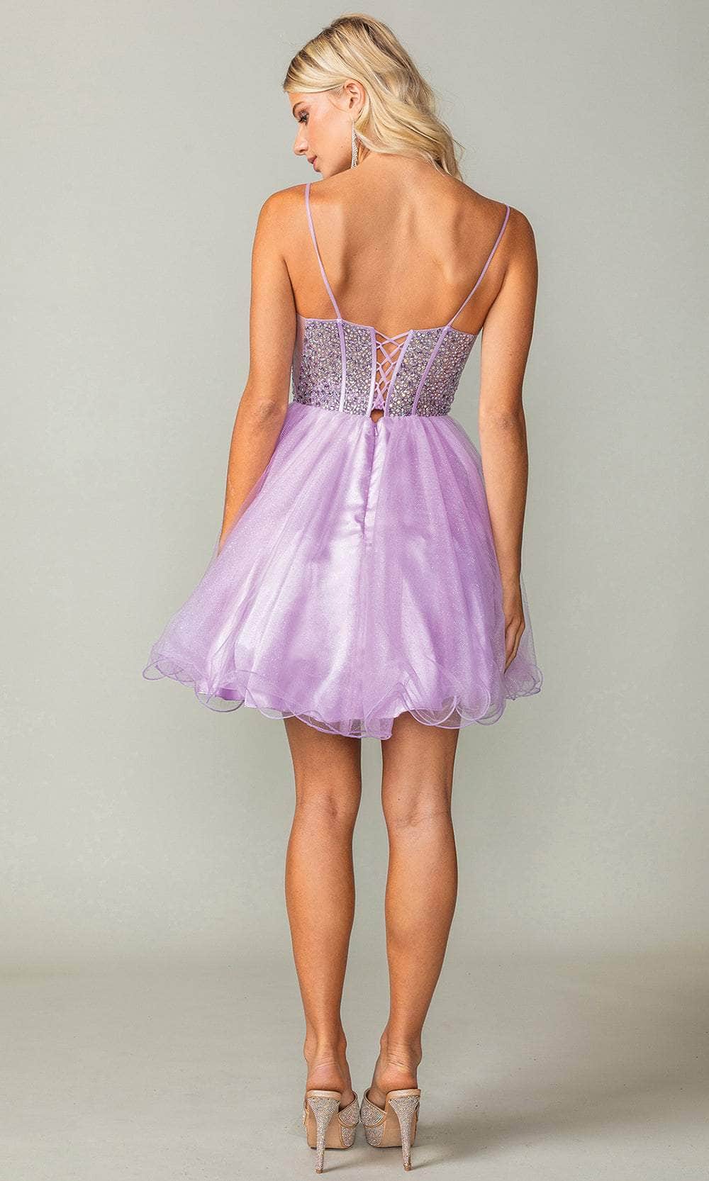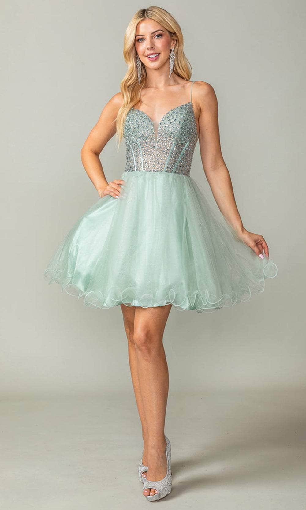 Command sophistication with the Dancing Queen 3353 cocktail dress. Expert tailoring sculpts the base of airy tulle, creating a flattering A-line silhouette that moves with effortless grace. Delicate spaghetti straps frame a deep V-neckline, enhanced by an illusion inset for a touch of allure. Sequined details dance across the sheer, corset-boned bodice, adding a touch of glimmer. The lace-up back ensures a perfect fit, while the layered tulle skirt cascades to a short, ruffled hem for a touch of playful whimsy. This Dancing Queen 3353 creation is perfect for a night where you want to radiate confidence and effortless style. Models are wearing the Champagne, Lilac, and Sage colors.