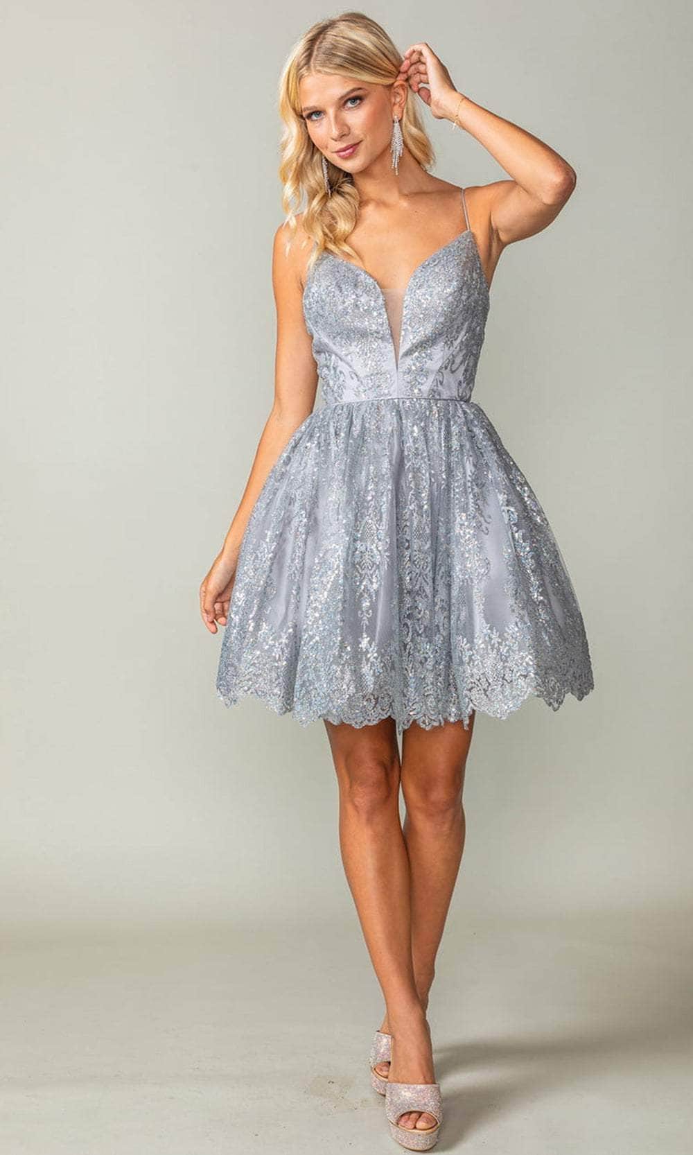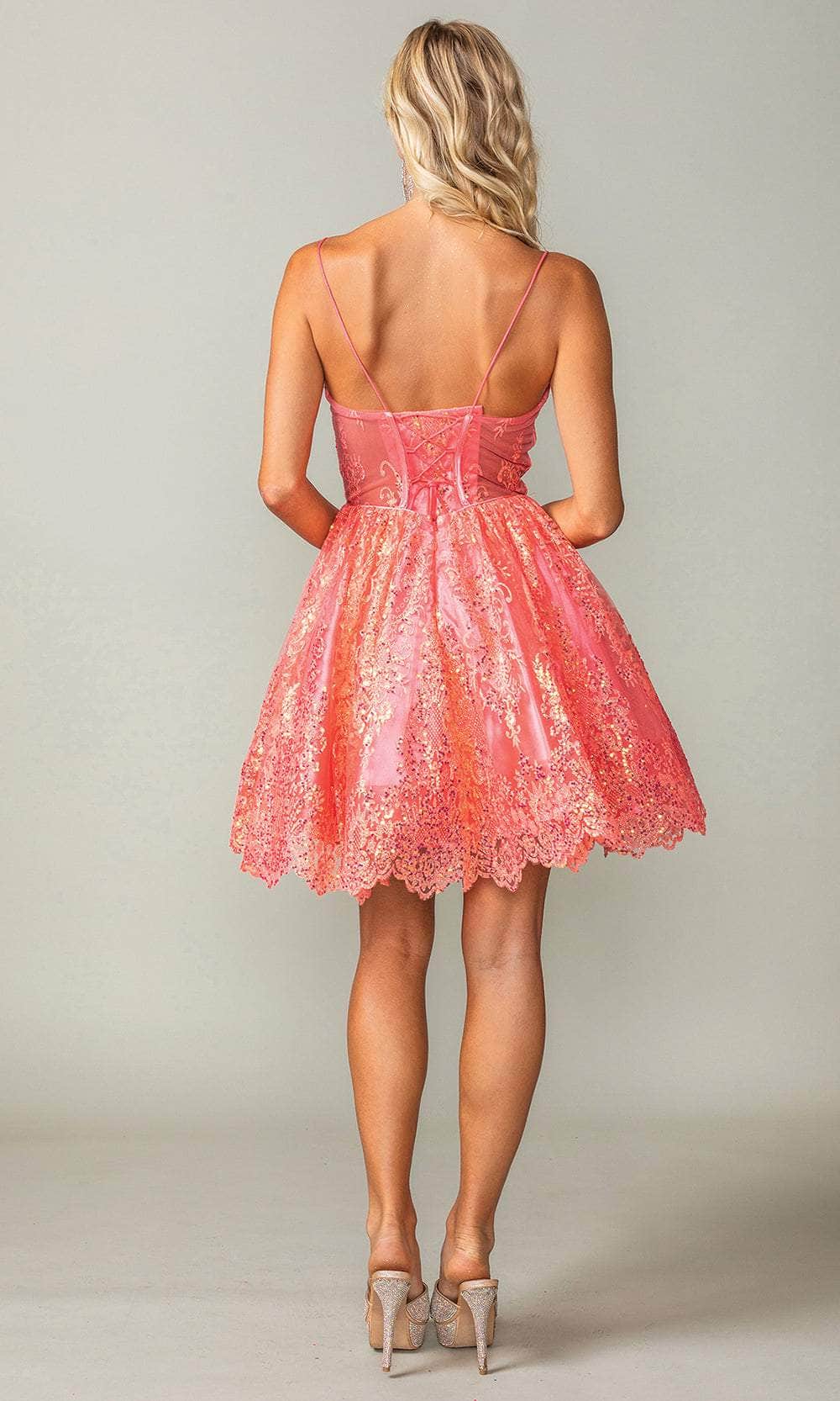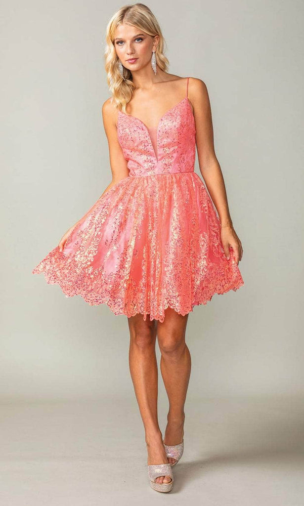 Steal the spotlight with the dazzling Dancing Queen 3358 cocktail dress. Precision tailoring shapes the silhouette, providing the perfect base for its stunning design features. The dress boasts delicate spaghetti straps framing a deep V-neckline, enhanced by an illusion inset for an air of elegant intrigue. Shimmering sequins cover the dress, catching the light with every move, making you shine brilliantly. The back showcases a covered corset, offering both structure and a sleek finish. The A-line skirt flows gracefully from the fitted bodice, with a delicately scalloped hem ending in a playful short length. This Dancing Queen 3358 dress effortlessly combines modern glamour, ensuring you make an unforgettable entrance. Models are wearing the Coral, Silver, and Gold colors.