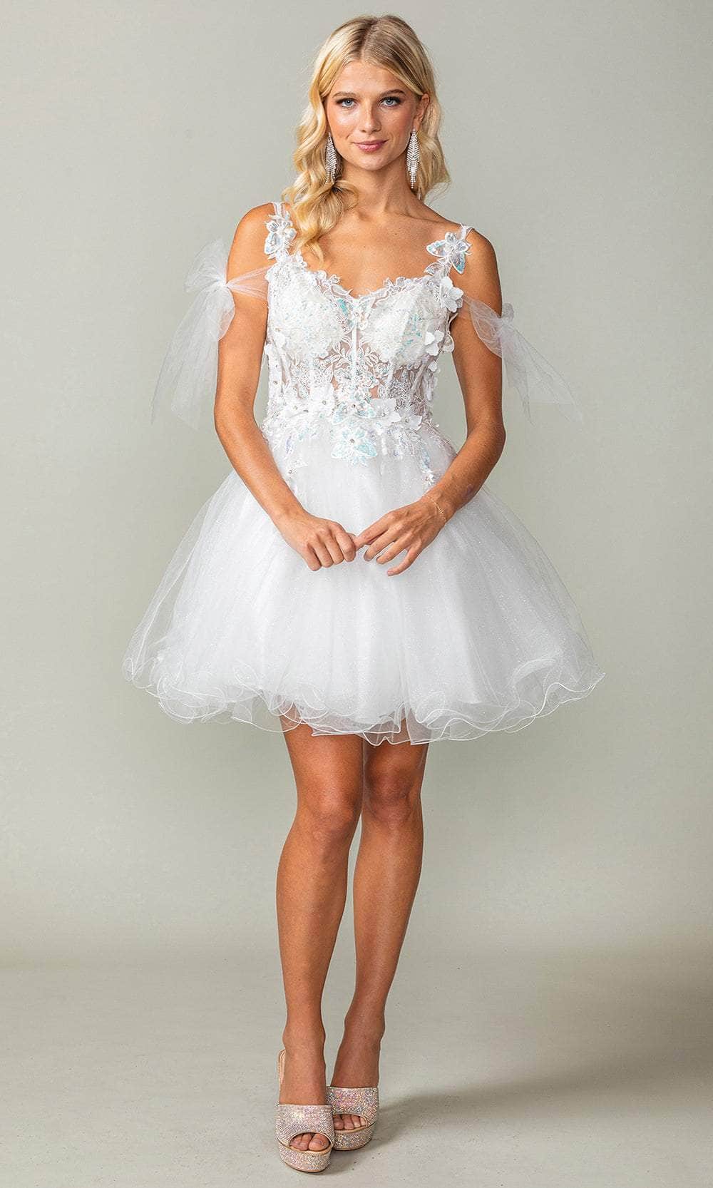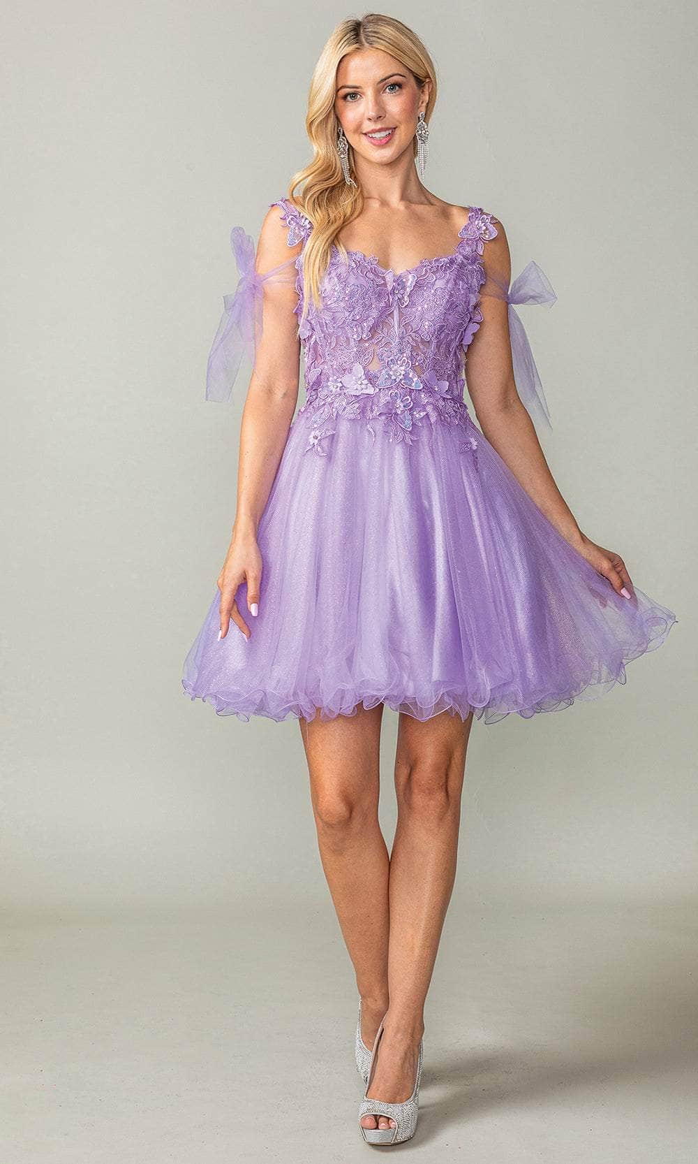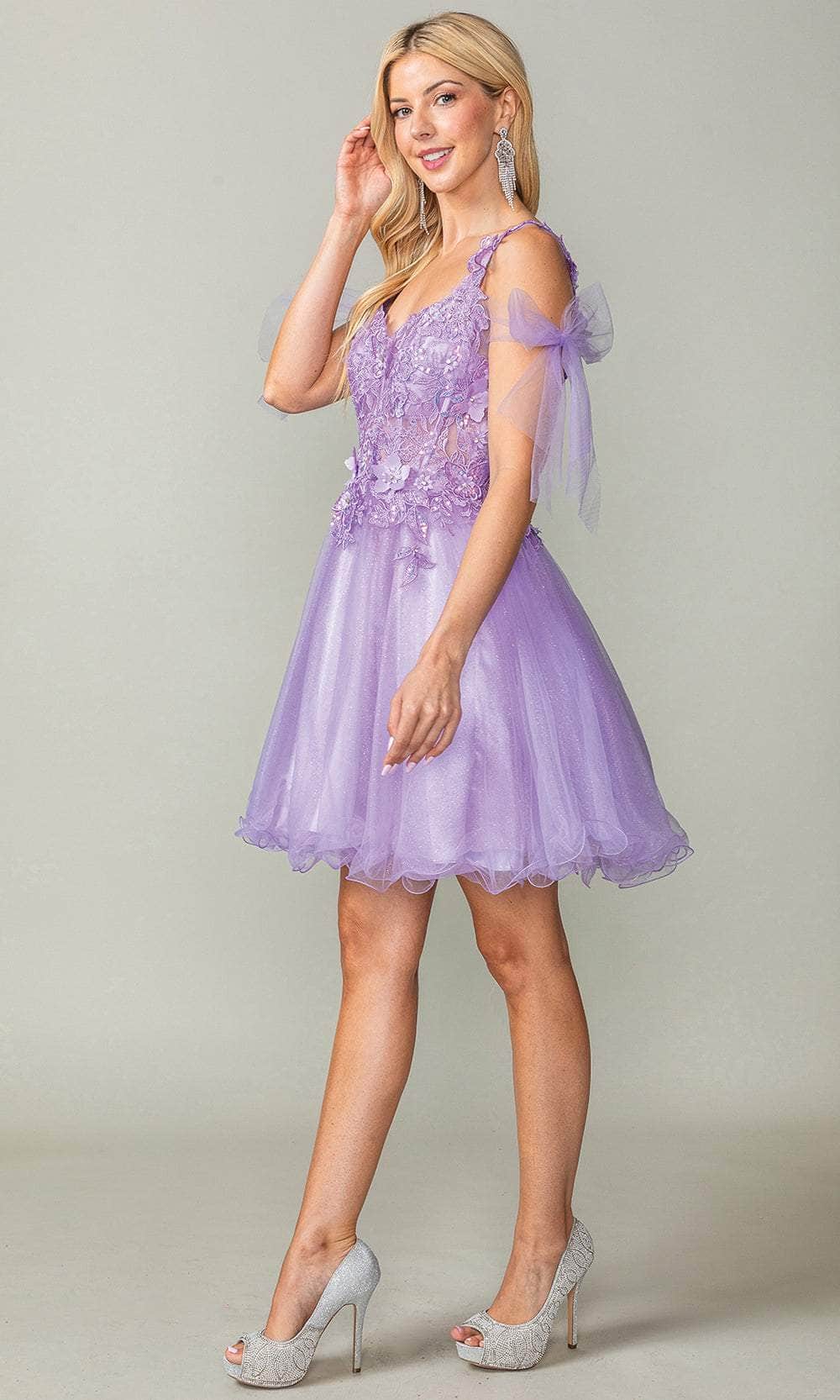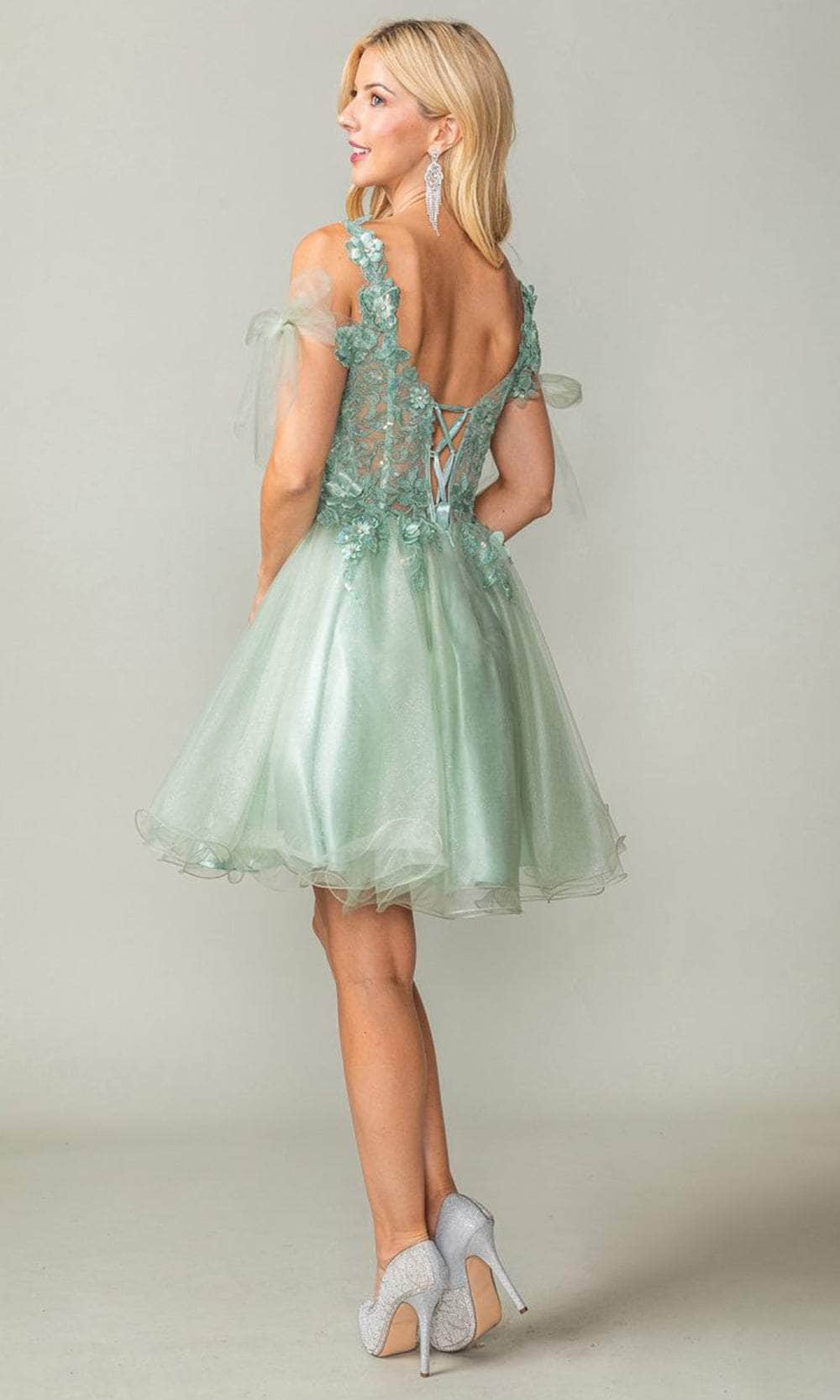 You will be the star of the night wherever the music takes you in the captivating Dancing Queen 3365 cocktail dress. Expert tailoring sculpts the silhouette, showcasing an ethereal tulle base adorned with shimmering sequins. Delicate butterfly appliqués add a touch of whimsy and movement. The bodice features strategically placed corset boning for a beautifully defined waist, accentuated by the flattering v-neckline and delicate spaghetti straps. A touch of romanticism is added by a sheer off-the-shoulder strap that cascades gently down the arm. The back showcases a dramatic corset closure, further emphasizing your figure. The skirt flows in graceful layers, finishing in a playful short hem that allows for effortless movement. This Dancing Queen 3365 masterpiece is the perfect blend of elegant structure and whimsical charm. Models are wearing the Blush, Sage, Purple, and Off White colors.