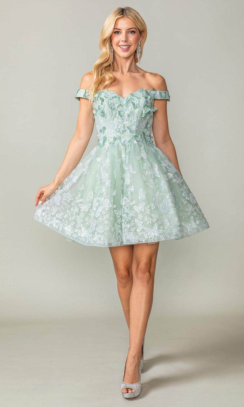 Embody shimmering glamour in the Dancing Queen 3366 cocktail dress. Tailoring expertise sculpts the silhouette, showcasing a captivating glitter print. Sequins add a touch of dazzling texture throughout the dress creating a mesmerizing effect. Delicate butterfly appliques adorn the strategically placed corset bodice. The off-the-shoulder neckline adds a touch of romantic allure, while the lace-up back ensures a perfect fit. The layered skirt dances around your legs with every step, finishing in a playful short hem. This Dancing Queen 3366 masterpiece is a captivating blend of sophistication and youthful charm. Models are wearing the Blush, Lilac, and Sage colors.