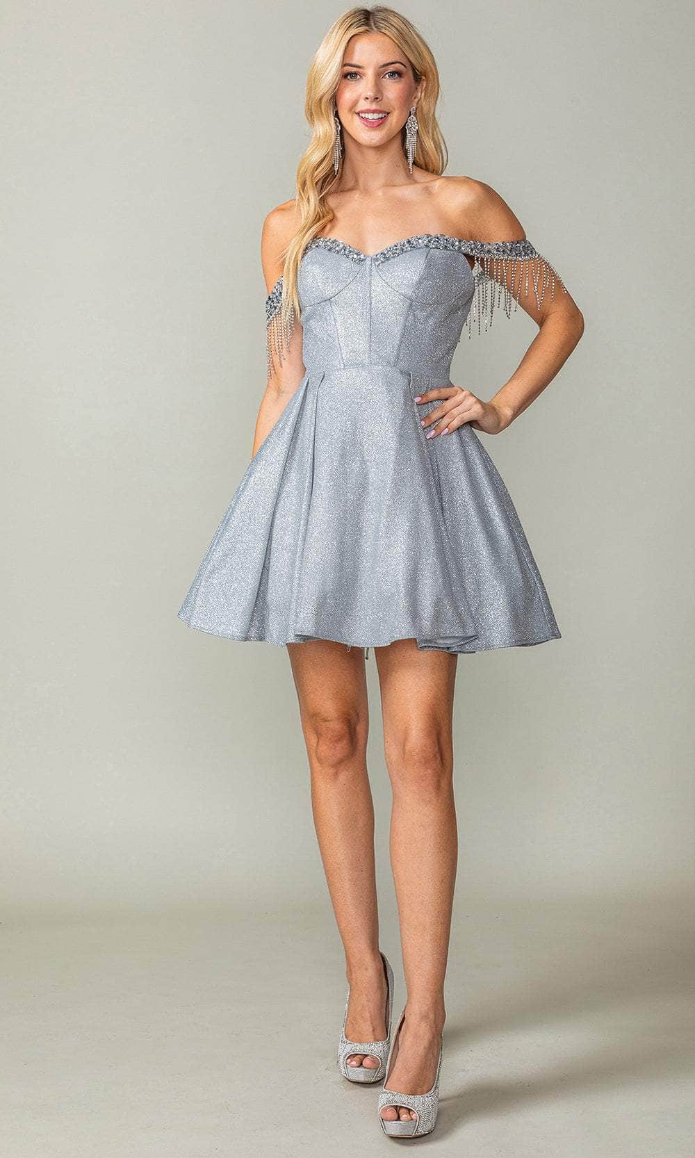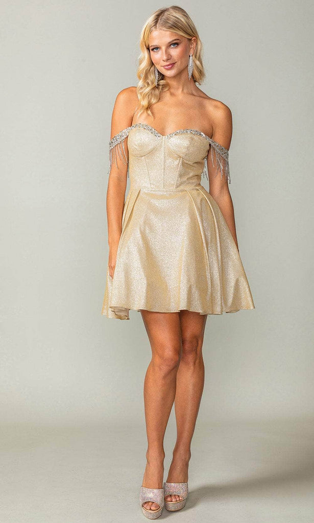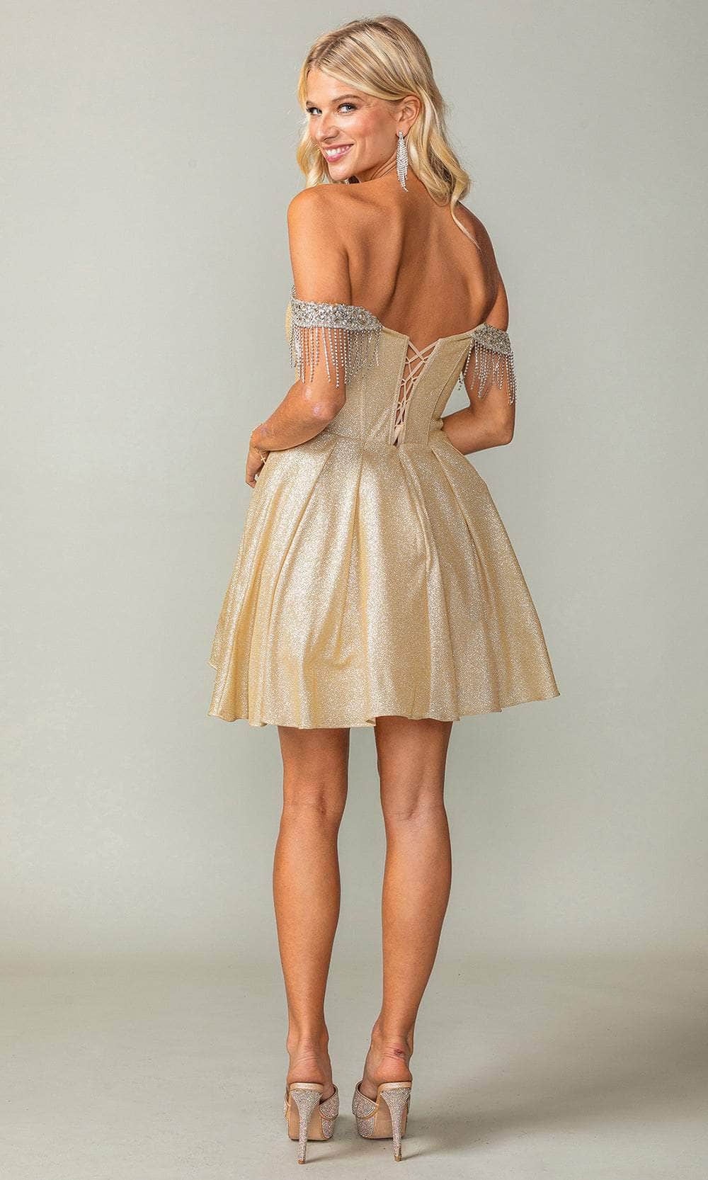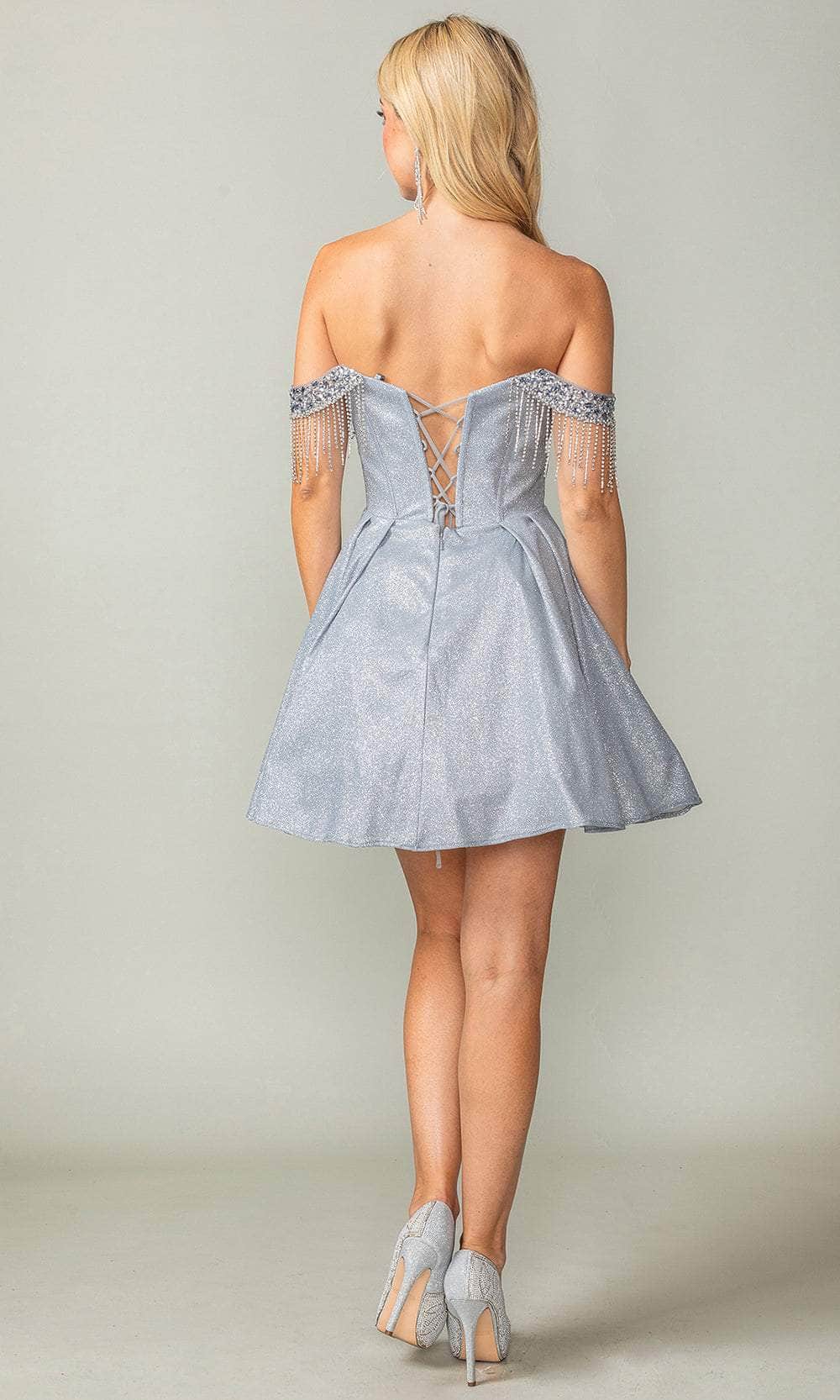 Own the dance floor in the dazzling Dancing Queen 3392 cocktail dress. Tailored lines define the silhouette, adorned with shimmering embellishments that catch the light with every move. The off-the-shoulder neckline adds a touch of allure, while the bustier bodice flatters your figure. The back stuns with intricate corset detailing, highlighting your curves and adding a touch of drama. The A-line skirt gracefully flows from the bodice, finishing in a playful mini hem that allows for ease of movement. This Dancing Queen 3392 creation is the perfect blend of elegance and fun as you become the star of the night. Models are wearing the Blush, Champagne, Sage, and Silver colors.