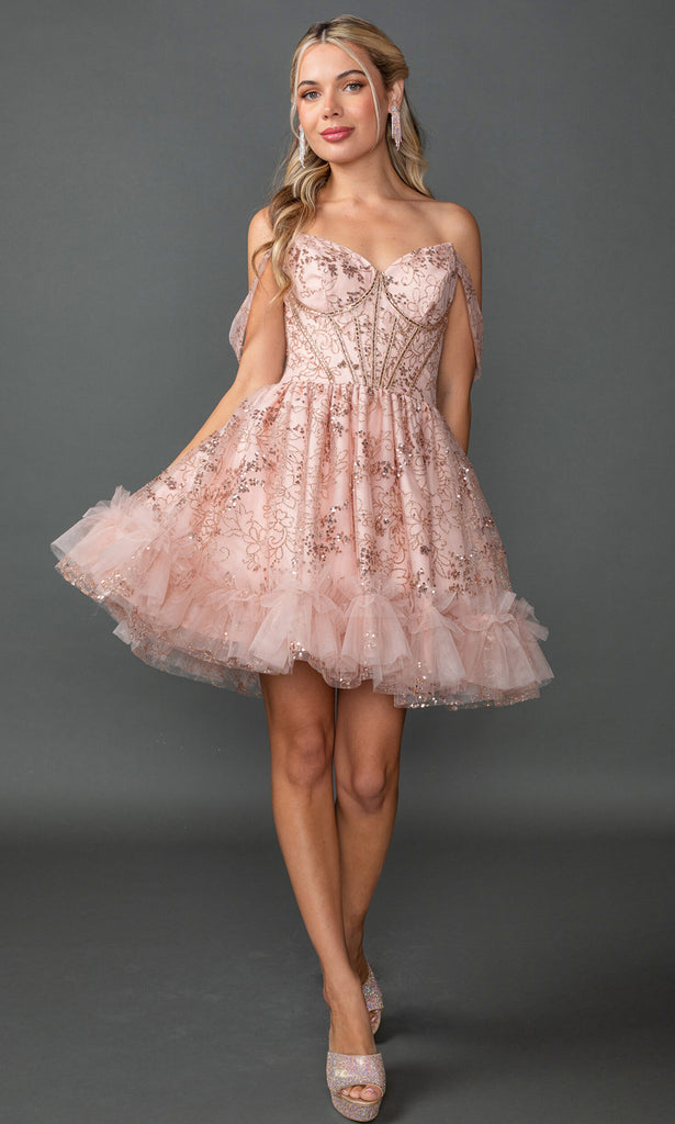 Dancing Queen 3422 brings fairytale charm to your celebration with its off-shoulder tulle design and draped sleeves. The embroidered corset bodice with visible boning and bustier detail creates a structured yet romantic silhouette, while the ruffled A-line skirt flares to a mid-thigh hemline for playful movement. A mid-open back with lace-up closure and bow accent adds a sweet finishing touch. Perfect for homecoming, sweet 16 parties, Bat Mitzvahs, or festive evening gatherings, this fit-and-flare dress ensures you sparkle. Celebrate in style with Dancing Queen 3422. Model is wearing Rose Gold color.