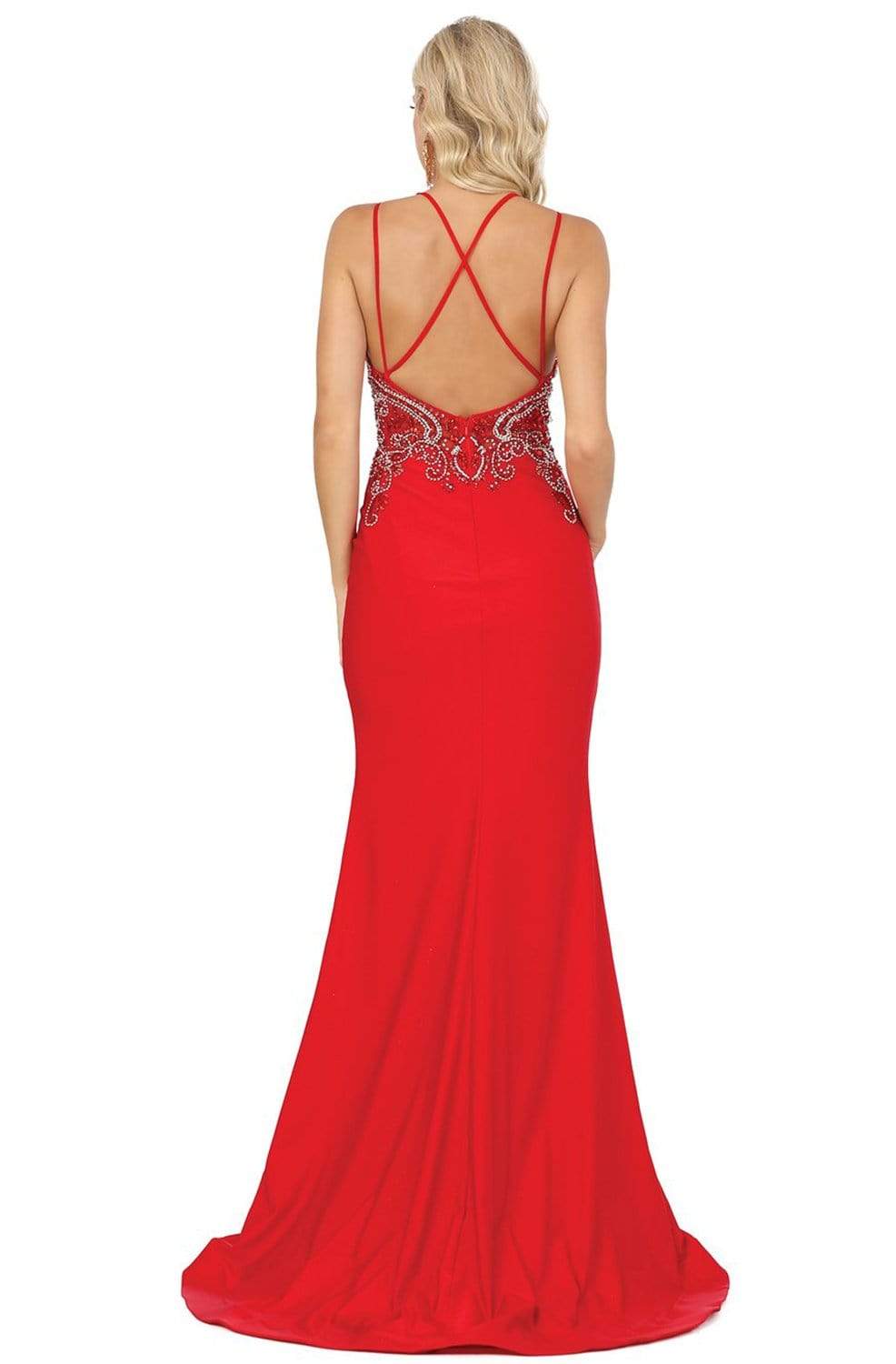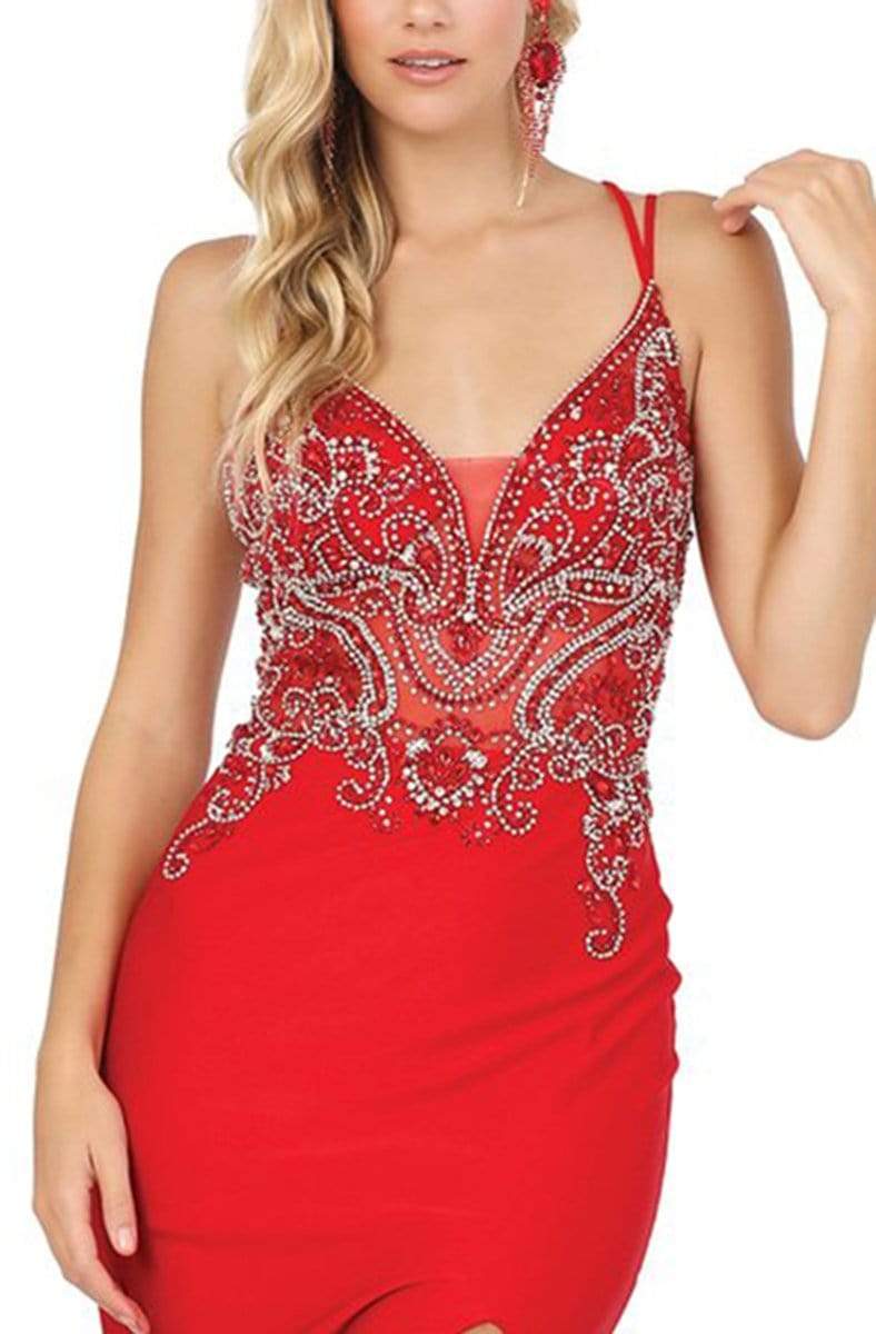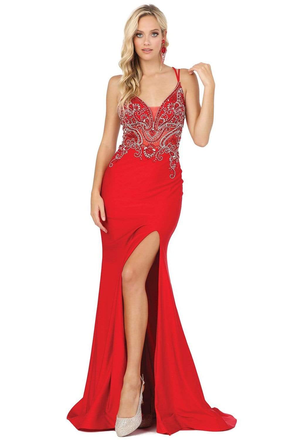 Showcase a style that communicates sophistication in this Dancing Queen 4050 creation. Intricately designed with rhinestone ornaments, this gown is crafted with a plunging v-neckline with a tonal sheer inset. Framed with double spaghetti straps that traverse to crisscross at the back. The trumpet skirt opens with a sexy slit before flowing to the floor with a train. Spark the interest of the stellar crowd in this Dancing Queen masterpiece.