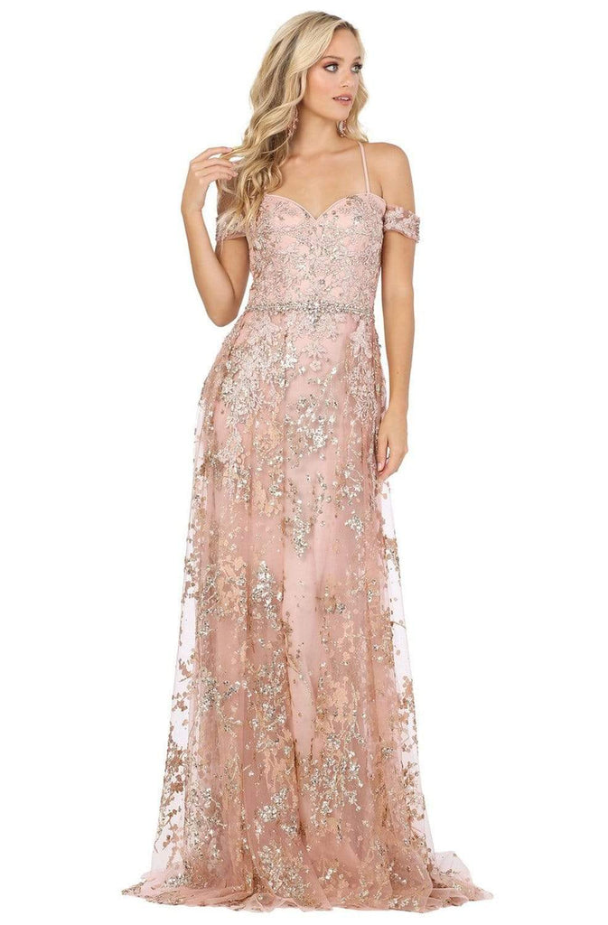 Make the crowd swoon over your exceptional style in this Dancing Queen 4082 creation. Festooned with floral lace appliques on the bodice, this stunner shows an off shoulder neckline with a sweetheart notch design. Spaghetti straps crisscross the back before traversing into a lace up design. The sheer A-line skirt parades metallic accents as it touches the floor with a train. Make a lasting impression in this scintillating Dancing Queen masterpiece. Models are wearing the Rose Gold and Gold colors.