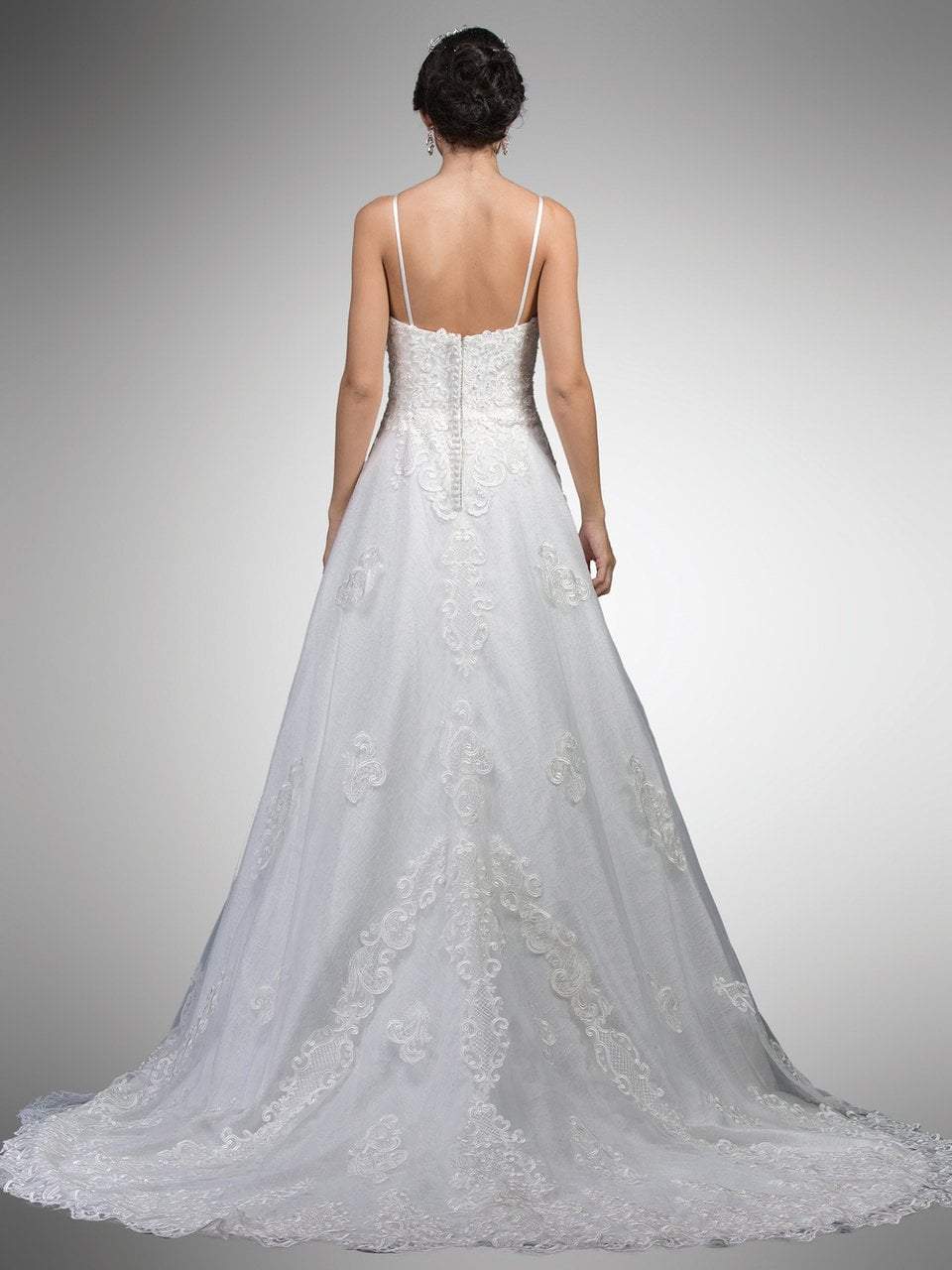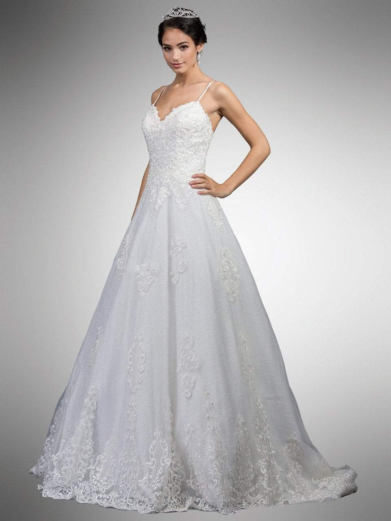 Make yourself into a vision of loveliness in this spectacular bridal gown by Dancing Queen 0041. The curve hugging top features a sweetheart neckline supported with spaghetti straps and lead to the mid-open back. Stunning embroideries accented with heat stones adorn the bodice and bottom of the skirt creating scalloped edges. An elegant sweep train adds the perfect touch to the whole stunner. All eyes will be on you as you walk your grand entrance with this Dancing Queen ensemble.