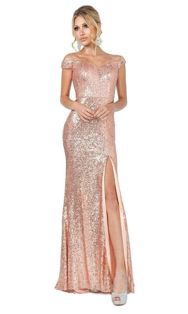 Be that statuesque beauty in this stunning gown by Dancing Queen 4319. Crafted in full sequin fabric, this spangled gown shows off a sexy off-shoulder sweetheart neckline coupled with a mid-open back, seam fitted bodice with cinched natural waist and a full-length sheath skirt that parts with a high leg slit. This Dancing Queen creation is meant to turn heads.