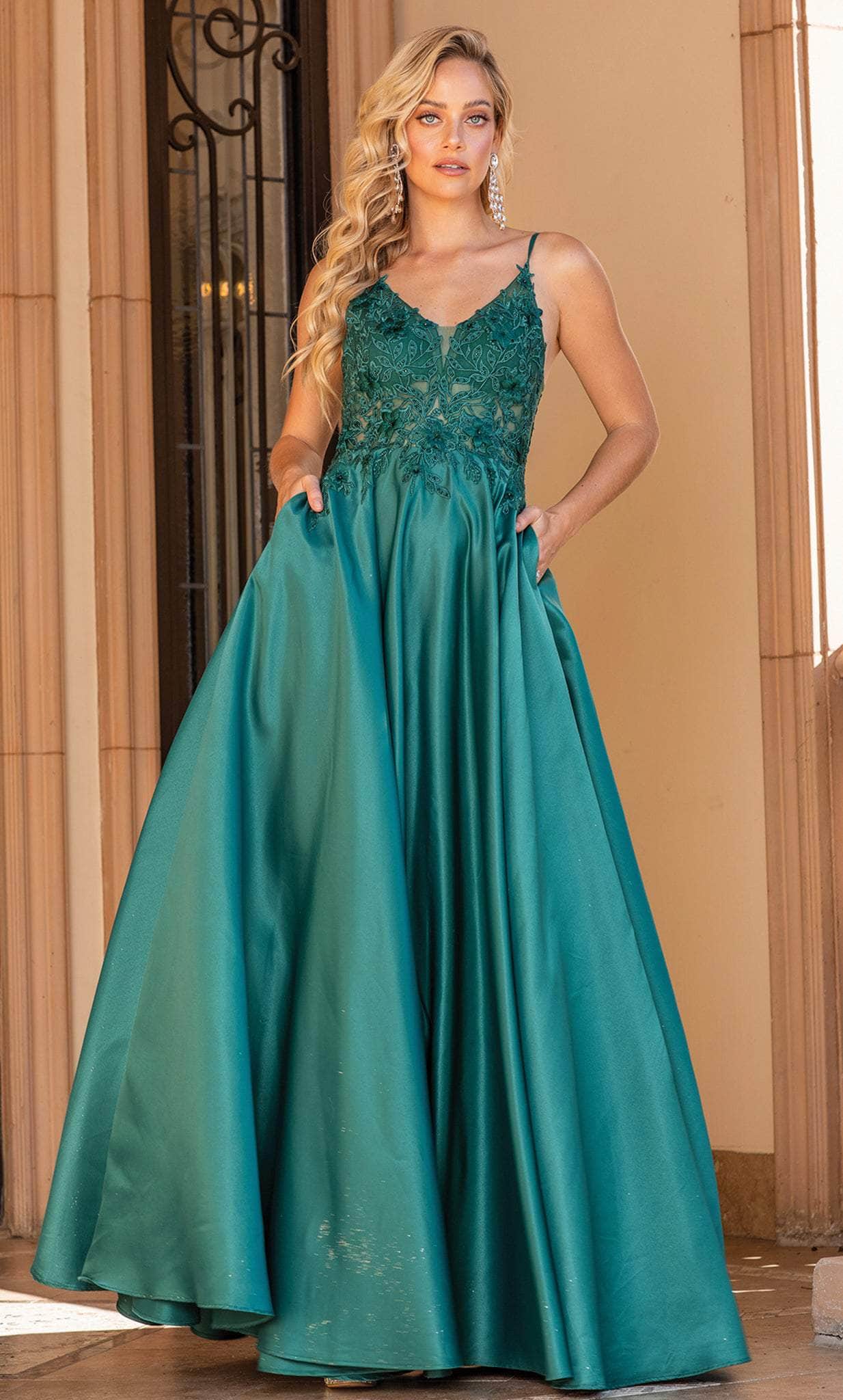 Channel red carpet glamour wearing this Dancing Queen 4326 gown. Stunningly adorned with beautiful lace embroidery and beads accent, this sleeveless style makes a lasting impression at any event. Showcasing in a sheer bodice, it has a plunging v-neckline, spaghetti straps, and a midrise scoop back. The pleated skirt has a flowy A-line silhouette that flares to the floor length hem and ends with side pockets. This Dancing Queen 4326 creation will definitely make you feel special! Models are wearing the Bahama Blue, Burgundy, Hunter Green, Lilac, Mint and Navy colors.
