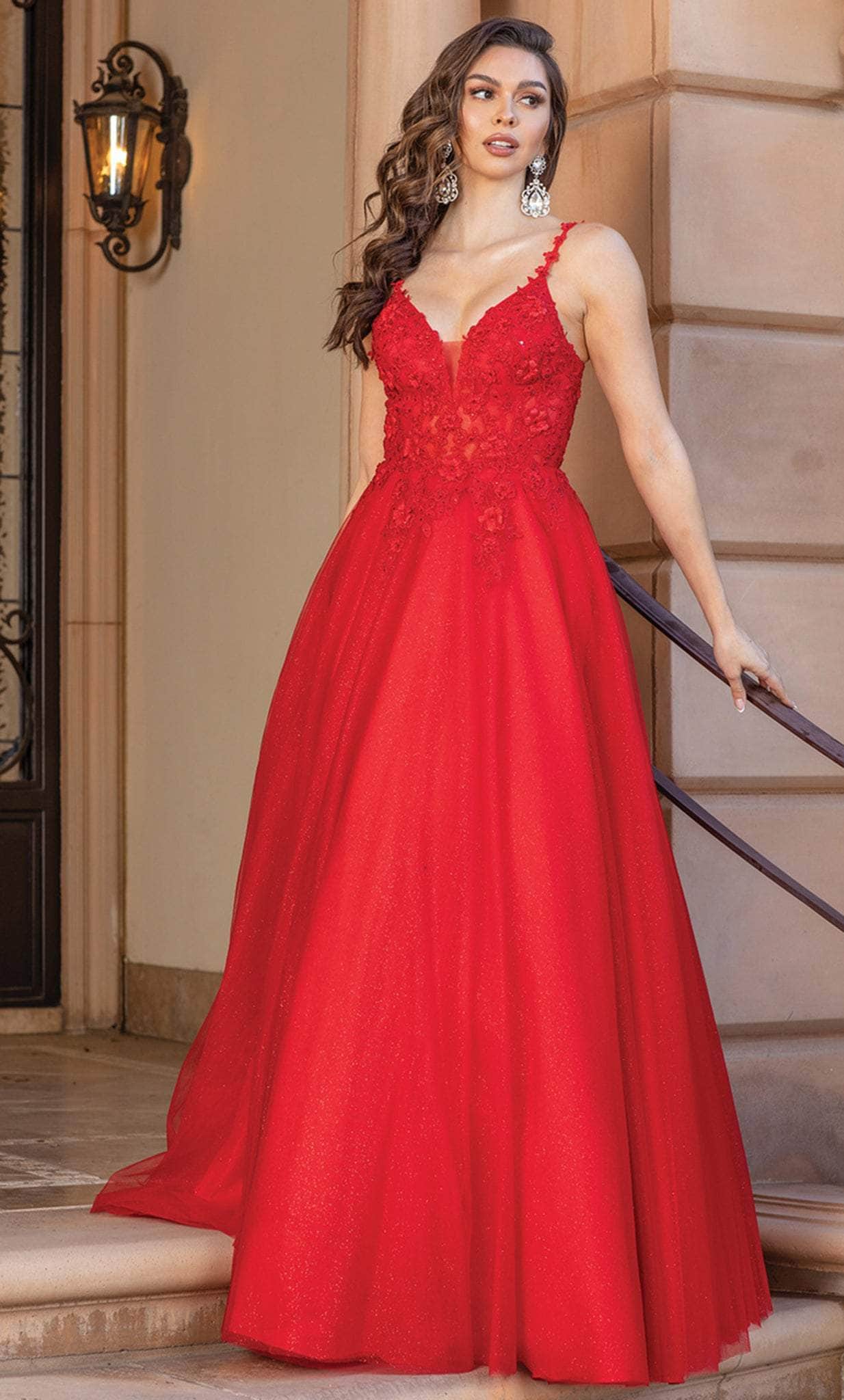 At your next formal event, look stunning in this understated yet alluring Dancing Queen 4328. Wear this A-line dress with spaghetti straps, an open back, and a plunging V neckline to enter the hall with elegance and beauty. Additionally, it features a zipper for securing at the back and floral lace motifs. The shimmering tulle fabric paneled skirt stretches down the floor.