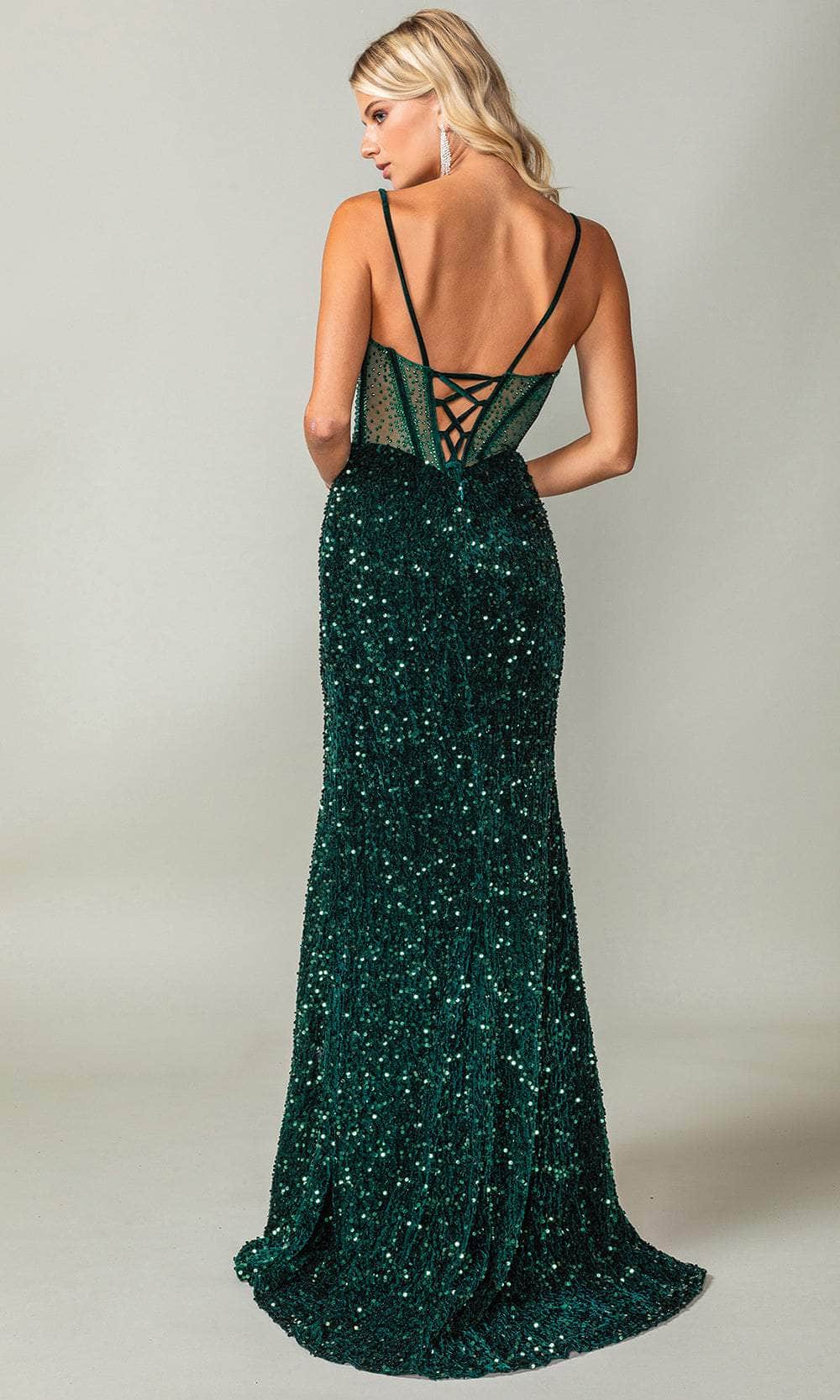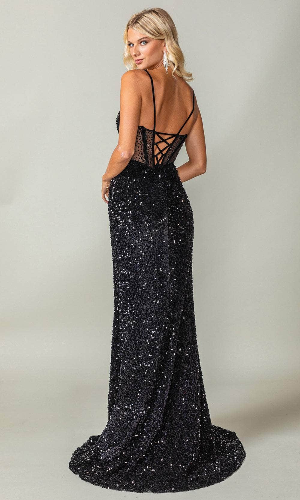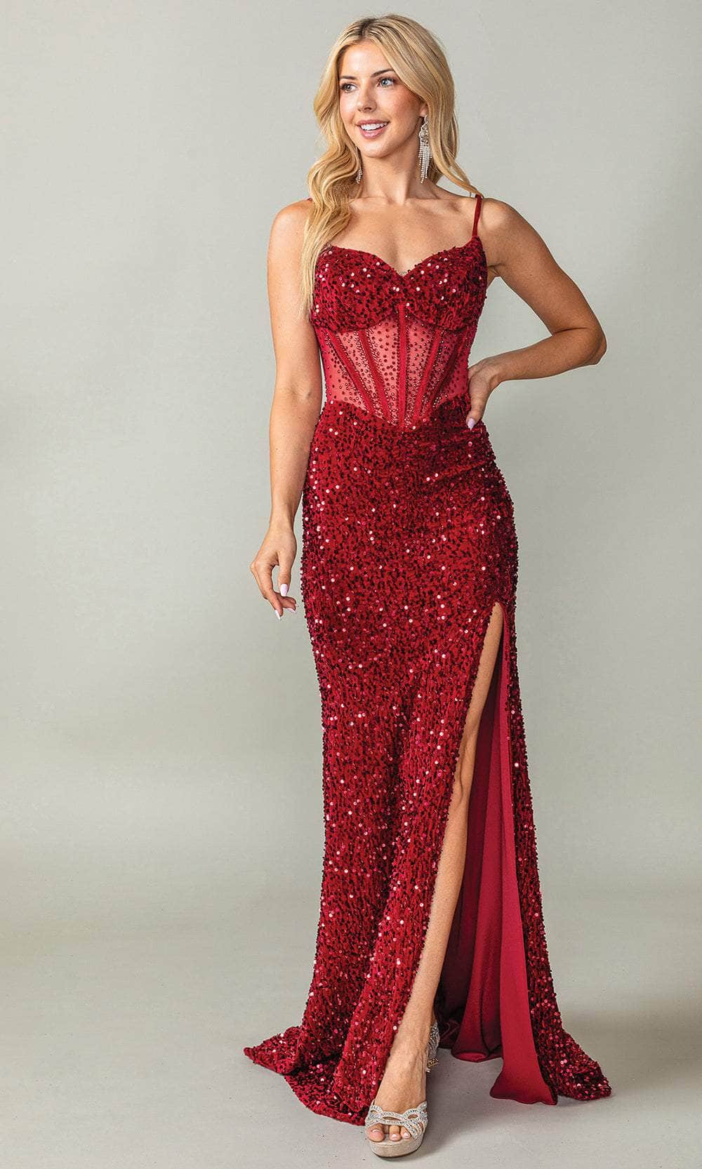 Have the courage to mesmerize in this Dancing Queen 4360 creation, a meticulously curated piece with tailoring lines tracing the contours of its bewitchingly feminine design. This resplendent ensemble features delicate spaghetti straps supporting a sweetheart neckline adorned with a dazzling sequined bust. The bejeweled corset boned bodice imparts a regal charm, while the sheer lace-up back adds an element of intrigue. The sequined sheath skirt cascades elegantly, culminating in a high slit that teases the senses, and a sweeping train that adds a touch of drama. Revel in the grace of this Dancing Queen 4360 creation, a masterpiece designed for those who appreciate the artistry of couture. Models are wearing the Black, Burgundy, Hunter Green, and Royal Blue colors.