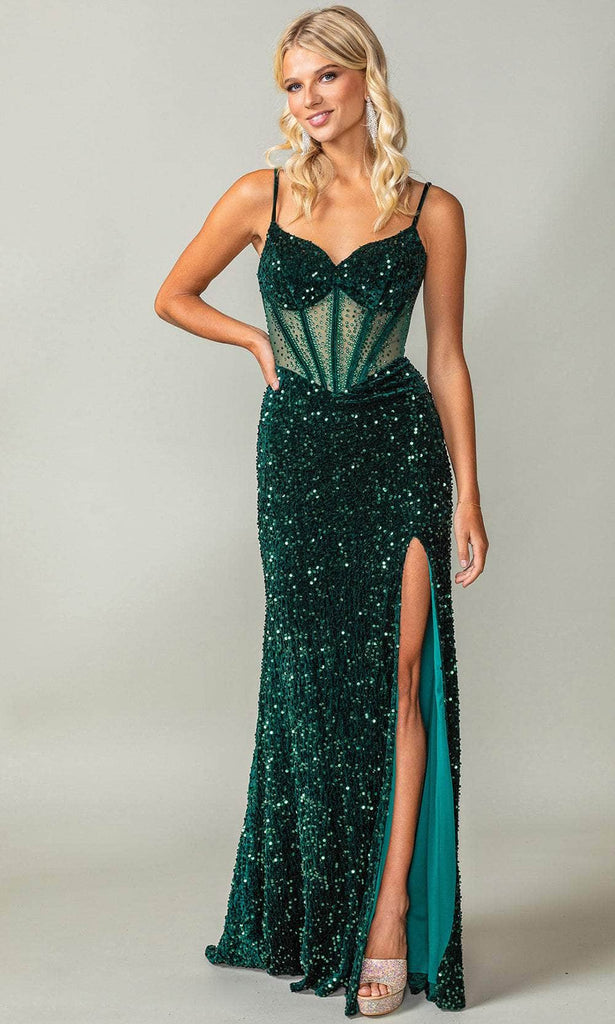 Details: Spaghetti Straps, Sequined Bust, Bejeweled Corset Boned Bodice, Sheer Lace Up Back, High Slit, Sweep Train