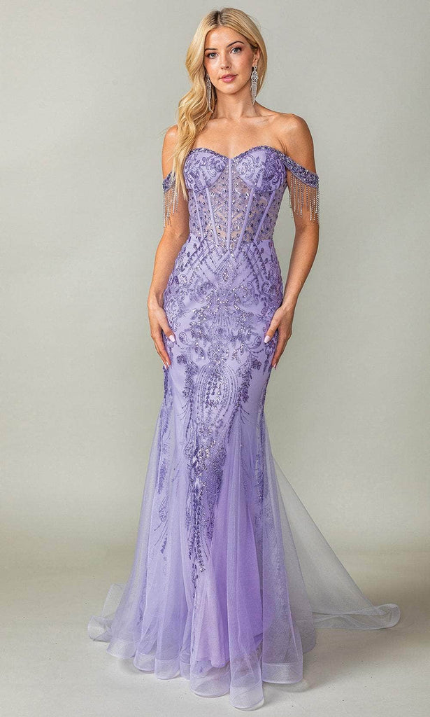 Parade a dreamy appeal in this Dancing Queen 4365 creation. A dazzling tapestry of sophistication, this glitter-print silhouette is adorned with exquisite embellishments, epitomizing timeless glamour. The off-shoulder neckline gracefully frames the décolletage, while the sheer corset-boned bodice adds a touch of ethereal allure. Beaded fringed sleeves gently cascade, creating a mesmerizing visual rhythm. The sheer lace-up back imparts a sense of delicate intrigue. The trumpet skirt, enriched with godet details, elegantly flares, culminating in a sweep train that leaves an indelible impression of grace and grandeur. Embrace the spotlight in this resplendent Dancing Queen 4365 masterpiece. Models are wearing the Black, Gold, Lilac, Rose Gold, and Sage colors.