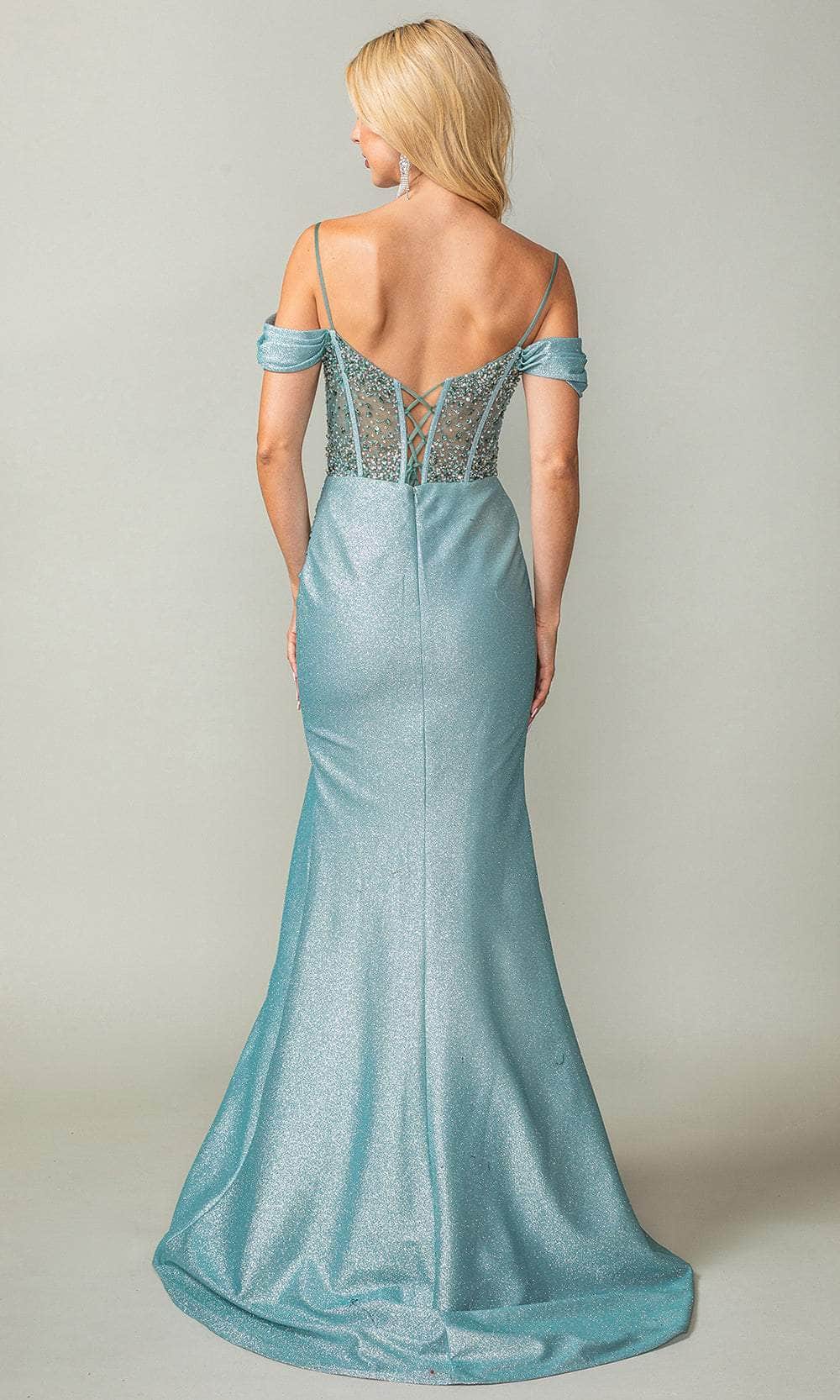 Compel everyone to take a gander at you in this Dancing Queen 4367 gown, a manifestation of timeless elegance. Adorned with delicate spaghetti straps and a refined scoop neckline, this dress seamlessly blends sophistication with allure. The beaded sheer corset bodice exudes opulence, complemented by a cold shoulder detail and artfully draping off-shoulder straps. The sheer lace-up back adds a touch of enchantment, while the mermaid skirt, featuring a high slit and a sweeping train, promises a silhouette that captivates. Revel in the allure of this Dancing Queen 4367 masterpiece as you command attention with every step, a true embodiment of refined glamour. Models are wearing the Blush, Lilac, and Sage colors.