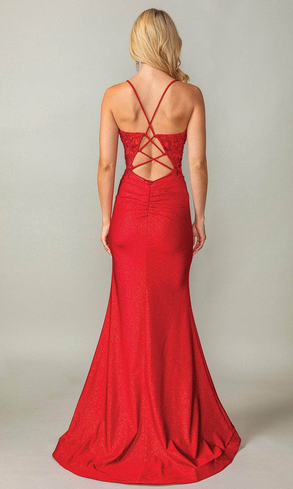 Make a grand entrance in this stylish Dancing Queen 4396 ensemble. This sleeveless dress is ornamented with lace embroidery and dotted beads that add a touch of feminine charm. It features a sweetheart neckline, and spaghetti straps that elegantly frame your shoulders. The back reveals a cutout detail and lace-up closure that brings a modern twist to the dress, ensuring a comfortable fit. With its sweep train and high leg slit, the skirt creates a sheath silhouette that accentuates your curves. This Dancing Queen 4396 creation will turn heads all night long. Models are wearing Red, and Royal Blue colors.