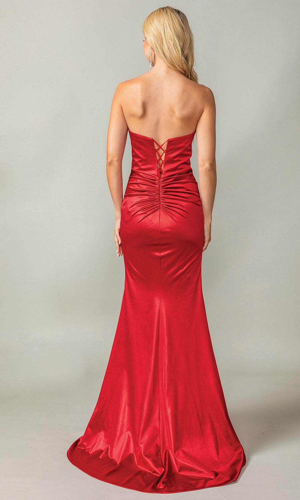 Details: Strapless, Beaded Peekaboo, Bustier Bodice, Lace Up Back, Draped Skirt, High Slit, Sweep Train